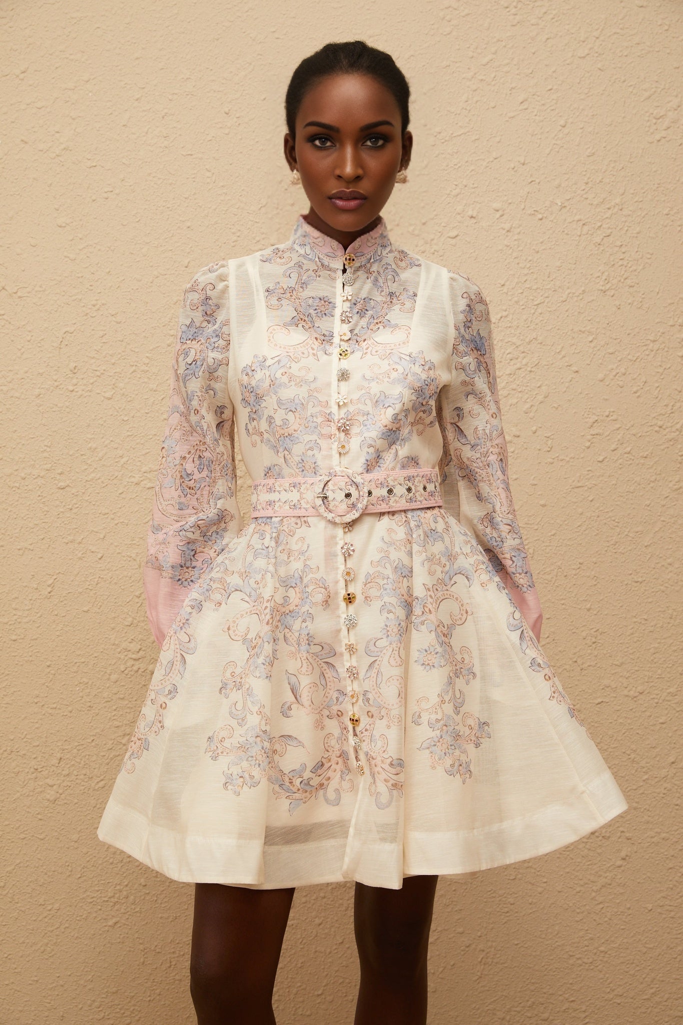 Exude grace in the Annabelle Mini Dress, a masterpiece of sophistication. Crafted from a sumptuous blend of fabrics, this dress boasts all-over floral print that exudes elegance. The belted waist cinches the silhouette, while decorative buttons add a touch of refinement. With its flounced skirt and two side slit pockets, every detail exudes luxury. This dress features a front button fastening and a rear zip fastening for ease of wear. Designed with long sleeves and a crew neck, it epitomizes timeless style. Elevate your wardrobe with this thigh-length dress, perfect for any upscale occasion. Composition: 100% Mixed Linen.