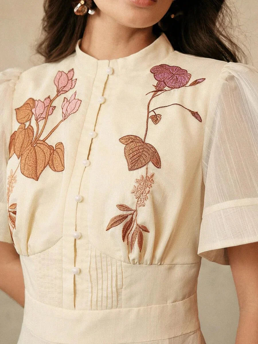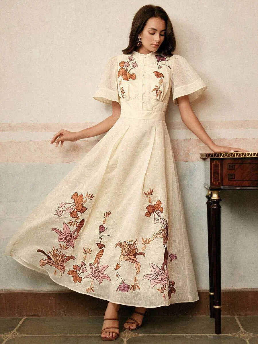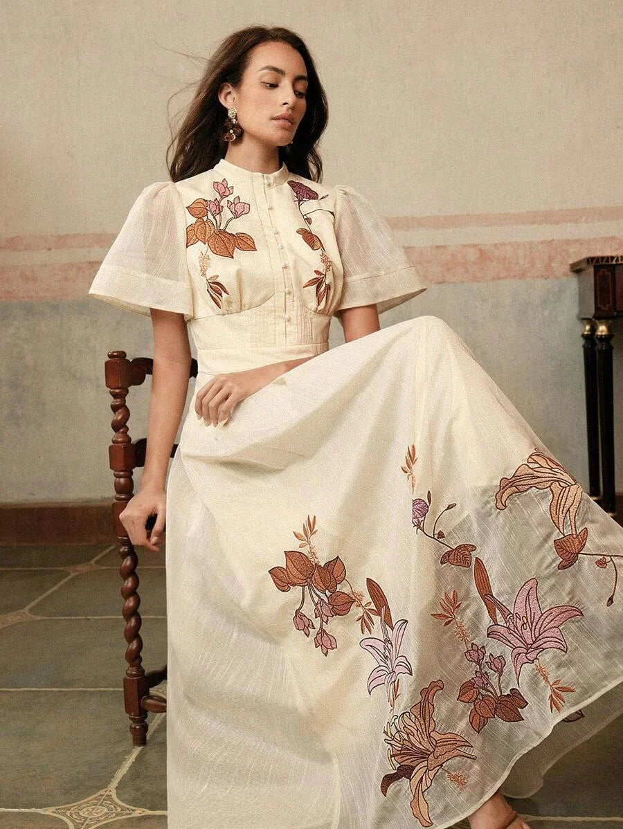 Make a grand entrance with the Annalisa Maxi Dress, boasting intricate floral embroidery in a delicate apricot hue. This elegant A-line dress features a stand collar and flounce sleeves for a touch of romance. Perfect for weddings and festive occasions like Ramadan and Eid, its high-waisted silhouette and flared hem exude grace. Crafted from luxurious woven fabric, this long dress offers a regular fit and is adorned with subtle drawstring and zipper details. With a 100% polyester composition and meticulous care instructions for handwashing, this dress ensures both style and comfort without compromising on luxury.