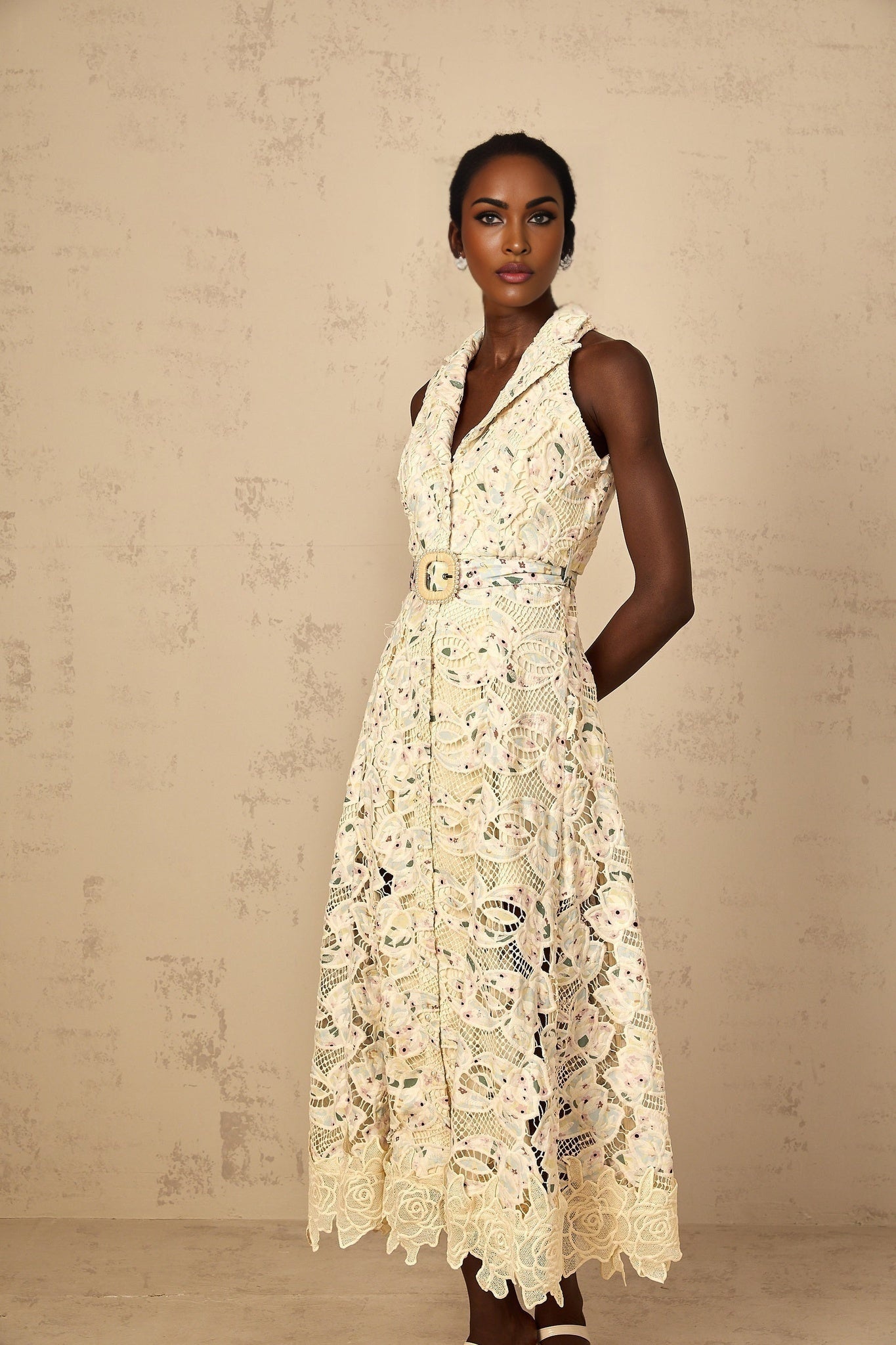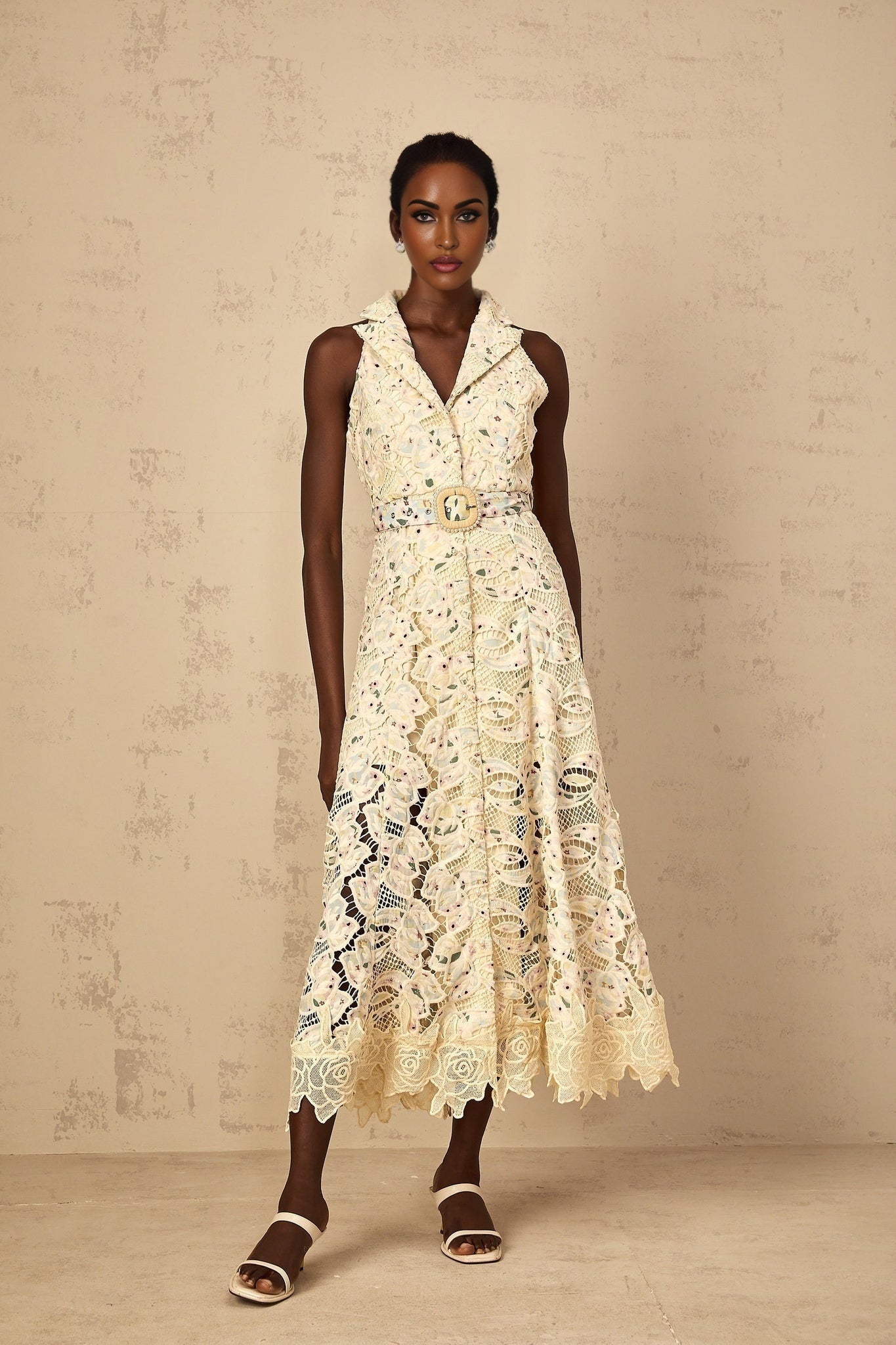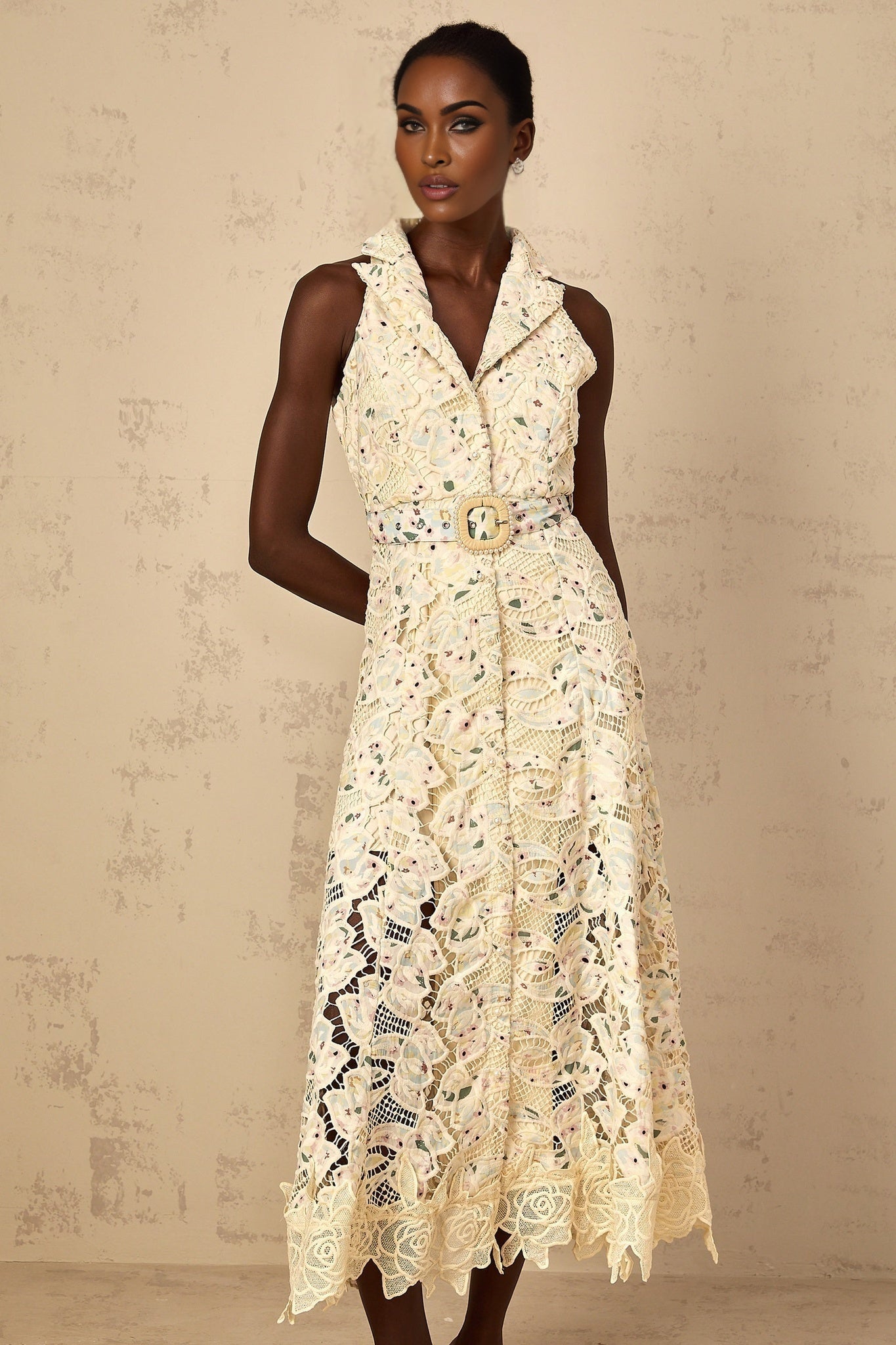 Artemide Midi Dress - Lace Detailing - Belted Waist - Floral Embroidery - Cut-Out Design - Faux-Pearl Buttons