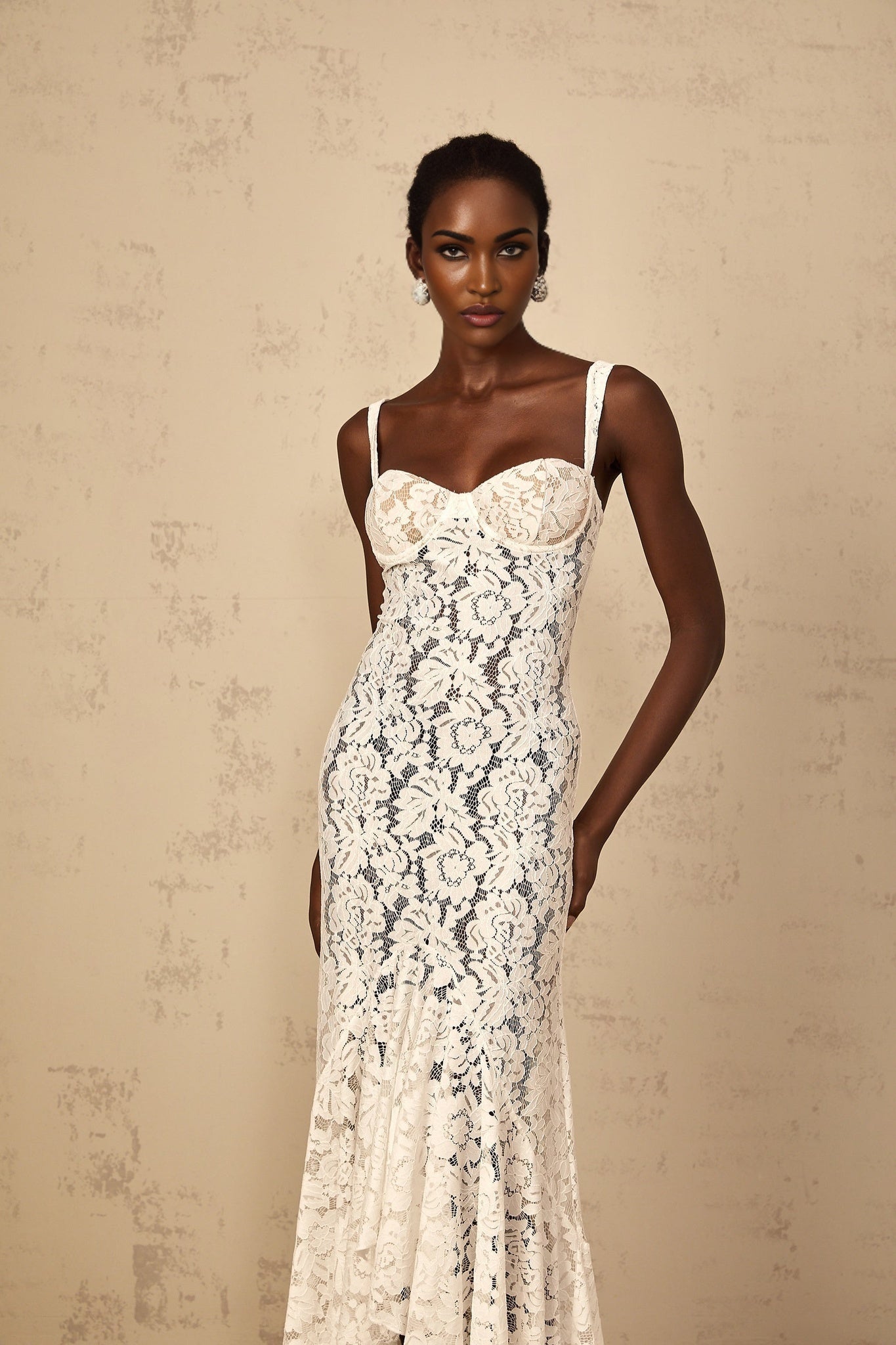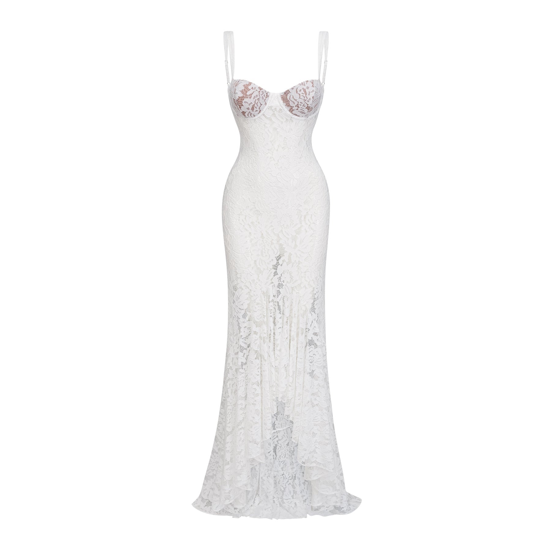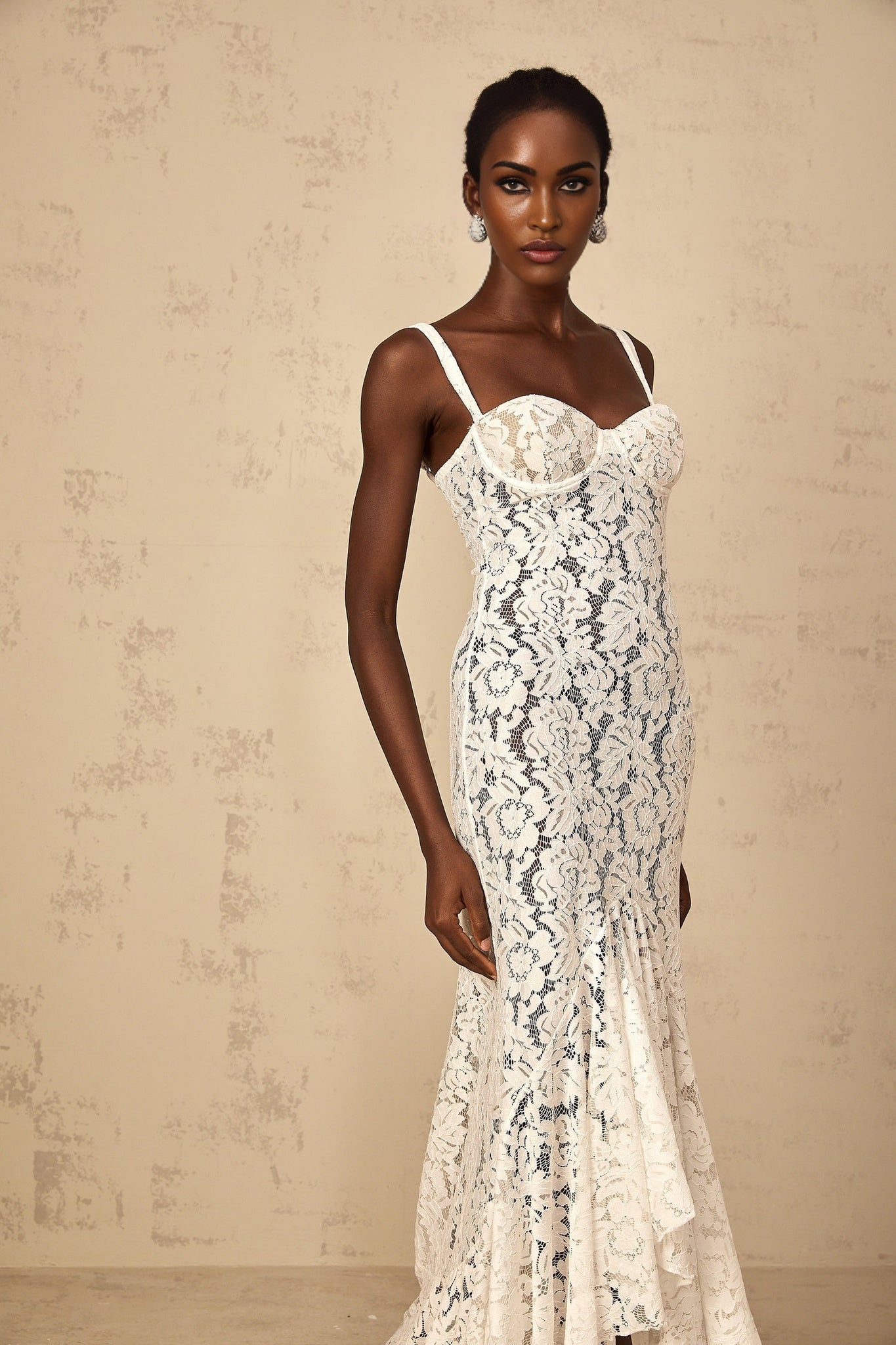 Exude unparalleled elegance in the Avery Maxi Dress, a mesmerizing ensemble crafted with floral lace and intricate ruffled detailing. This sleeveless masterpiece features a push-up bra with underwire for a flawless silhouette, complemented by adjustable wide straps for a bespoke fit. The bustier style exudes sophistication, while the semi-sheer construction adds a hint of allure. Completed with a rear zip fastening, this maxi length dress in pristine white is a showcase of opulence. Composition: 90% Terylene fiber, 10% Spandex. Elevate your style with this divine creation.