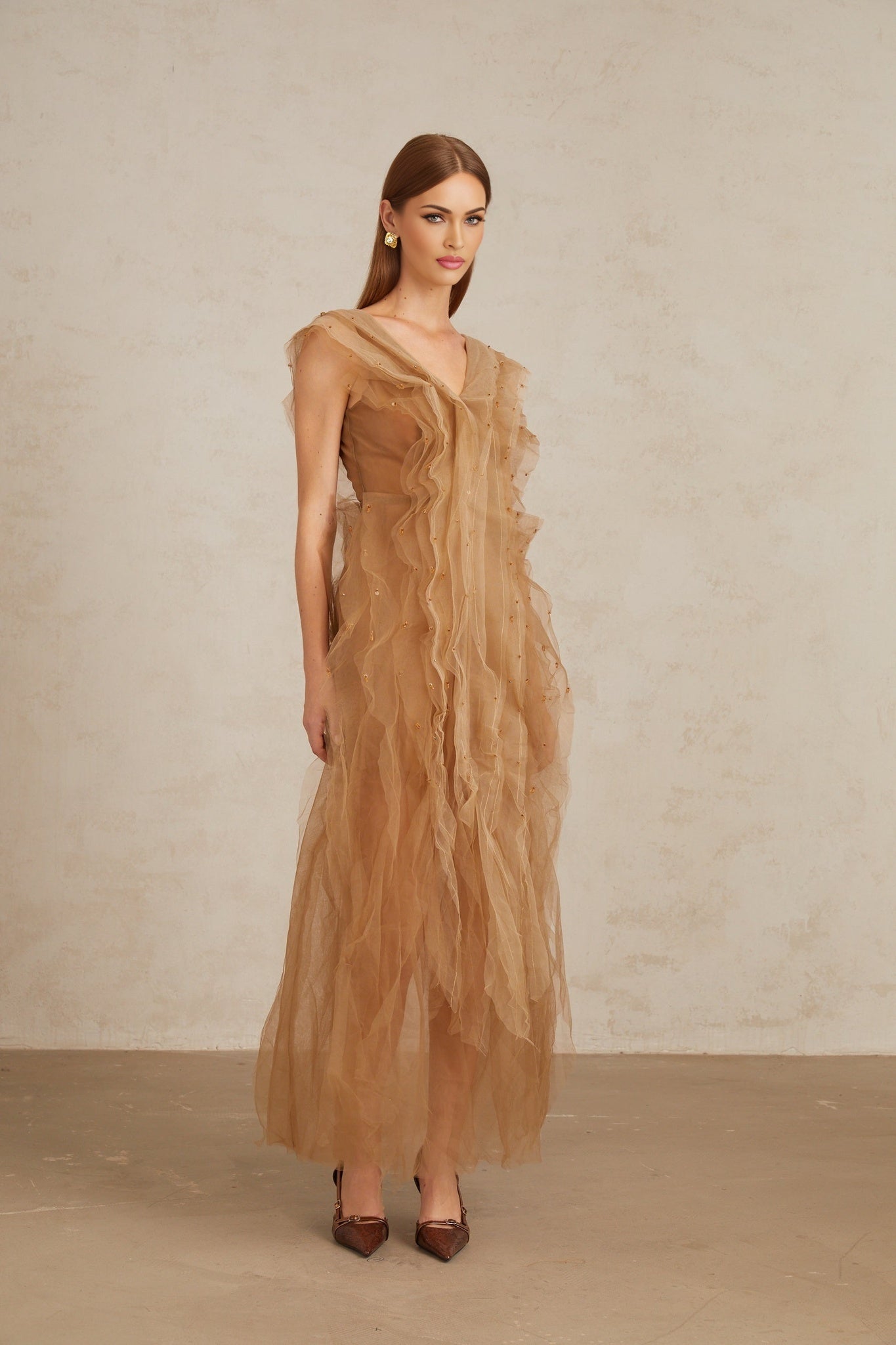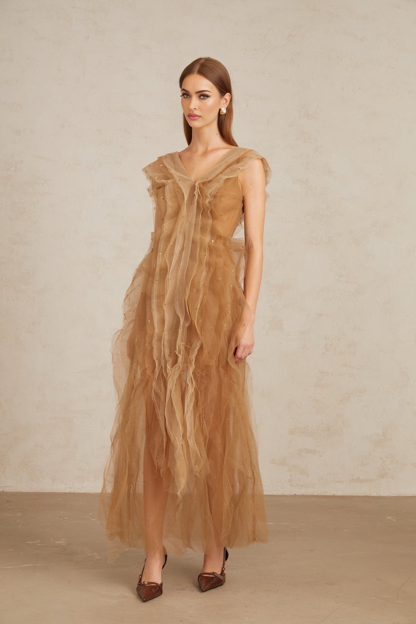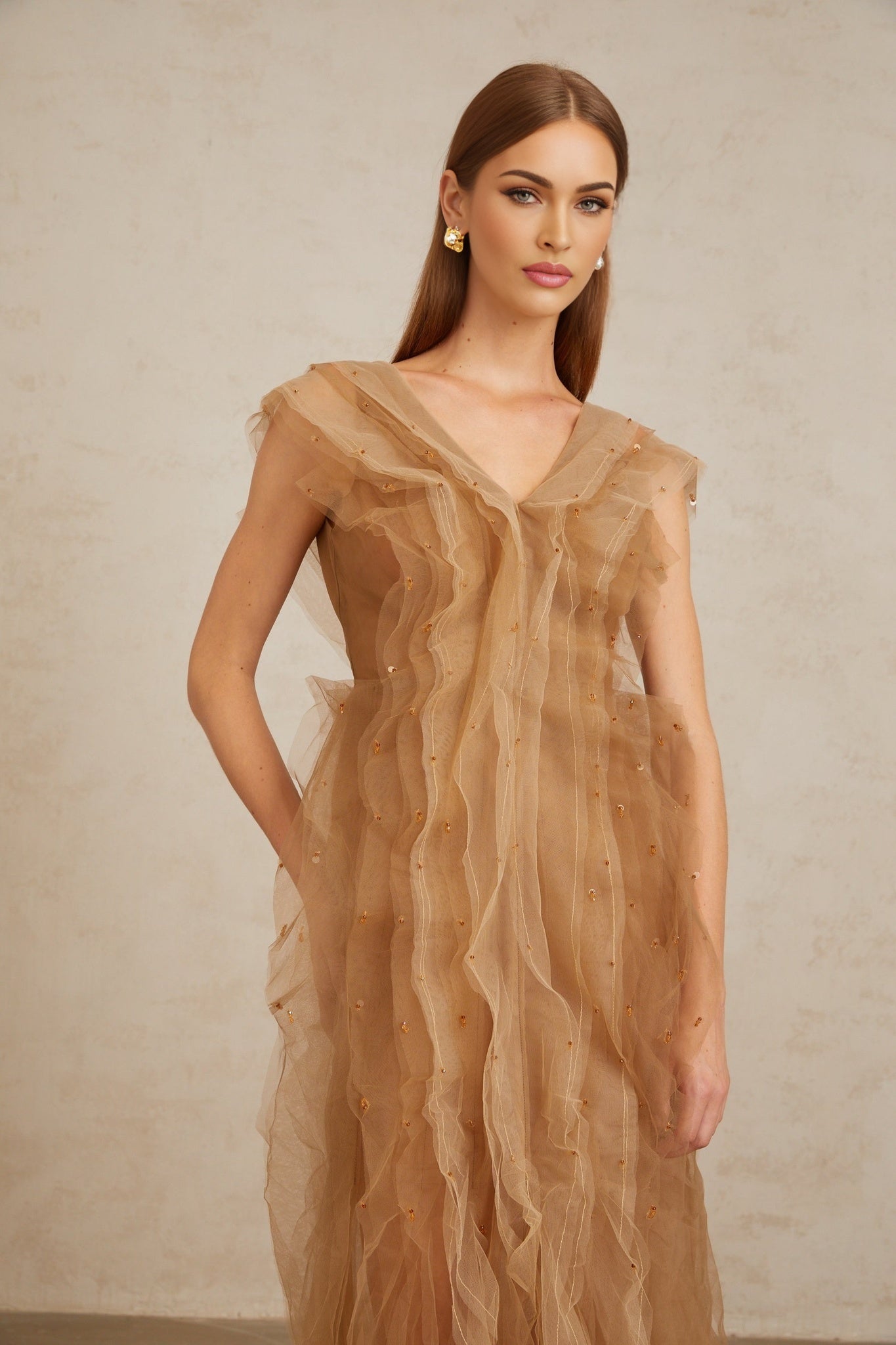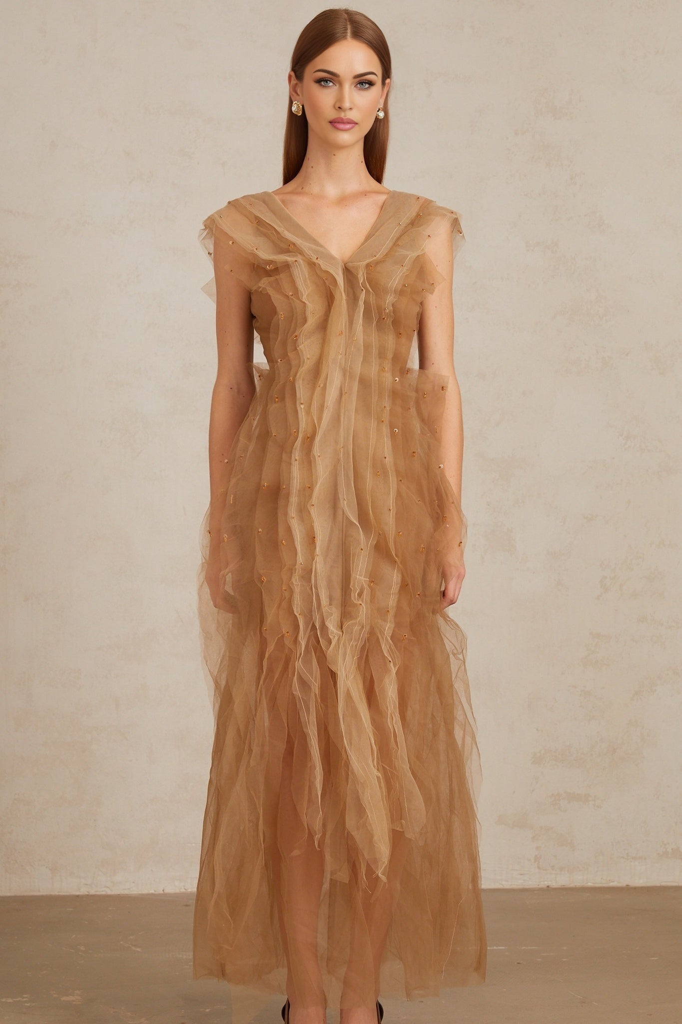 Exude elegance in the Céleste Brown Layered Tulle Maxi Gown, a maxi-length masterpiece featuring a mesmerizing layered tulle design with intricate rhinestone embellishments that catch every glimmer of light. Crafted with a V-neckline and cap sleeves, this gown accentuates the figure with a fitted waistline for a flattering silhouette. The rear zip fastening ensures a seamless fit, making it a perfect choice for sophisticated evening affairs. Elevate your ensemble with this stunning piece, ideal for those who appreciate luxury and refinement.