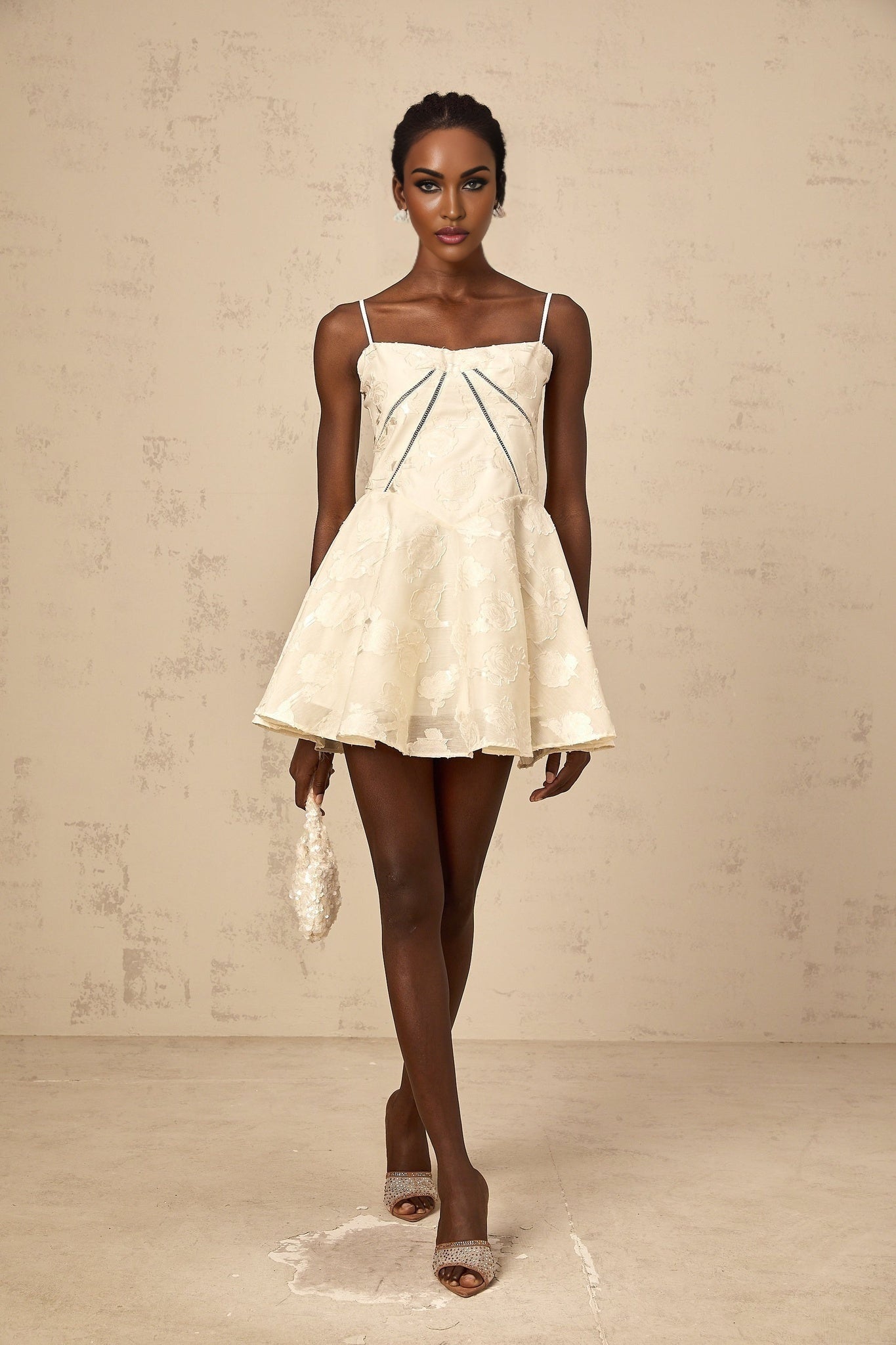 Charleigh Mini Dress - Patterned Jacquard - Sleeveless - Adjustable Spaghetti Straps - Puff Skirt