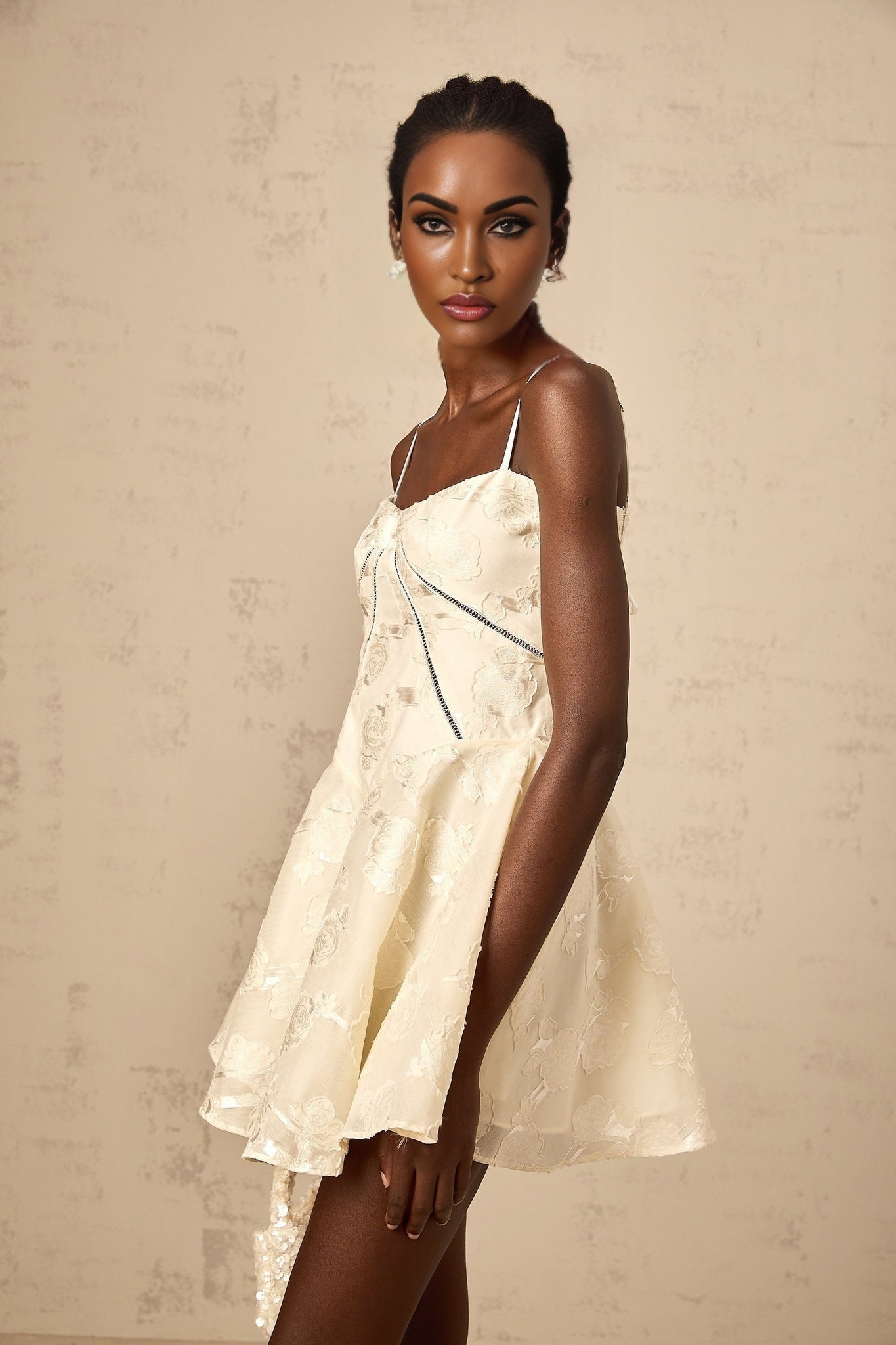 Elevate your wardrobe with the Charleigh Mini Dress that exudes sophistication and charm. Crafted from a luxurious blend of 79% Polyamide and 21% Cotton, this dress boasts a white patterned jacquard fabric that catches the light beautifully. The sleeveless design features adjustable spaghetti straps for a personalized fit and a puff skirt that adds a touch of drama. Adorning the back, a lace-up fastening and rear zip closure ensure a flawless silhouette. Perfect for special occasions, this mini dress is a timeless piece that will make you stand out effortlessly.