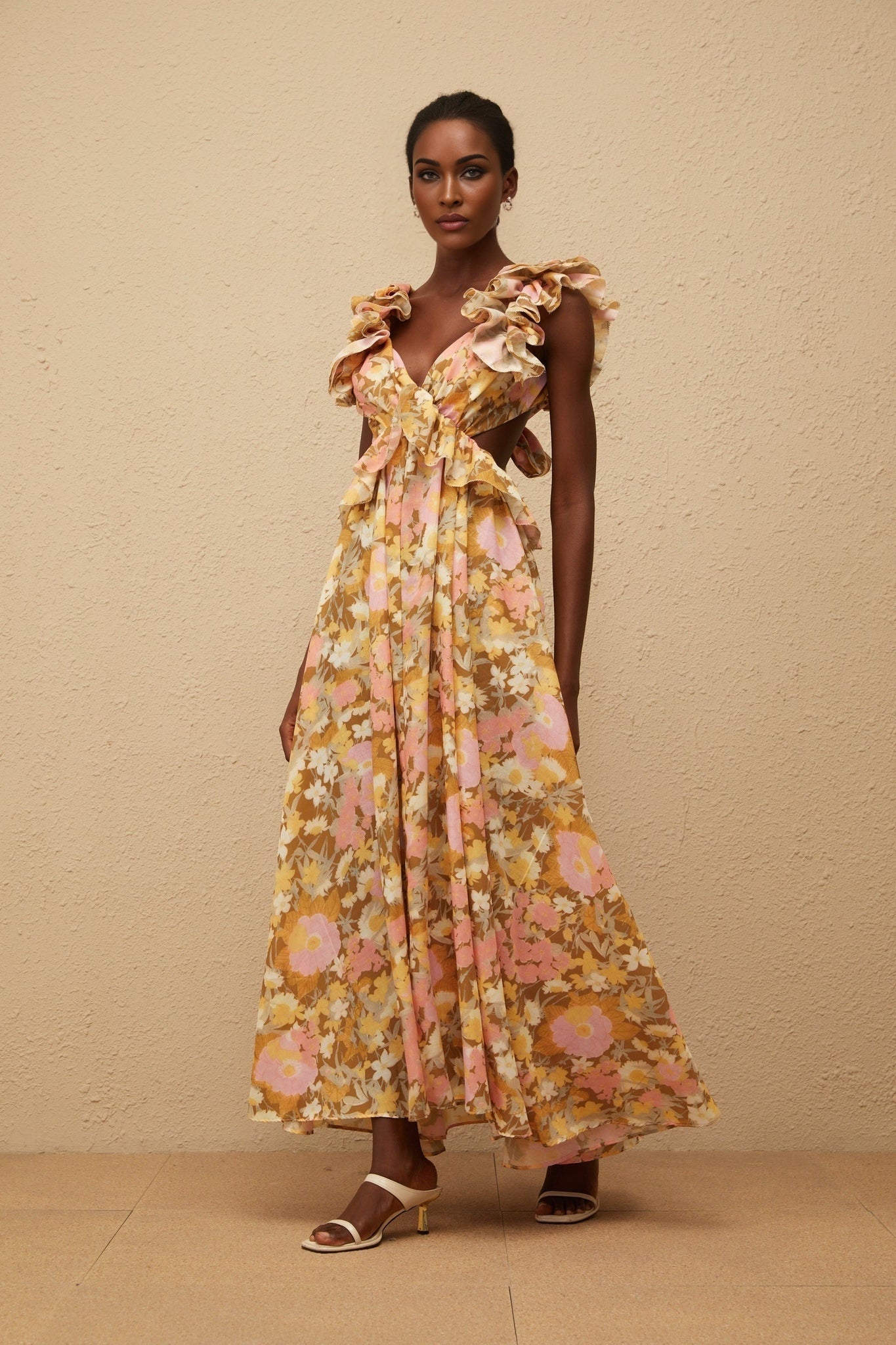 Indulge in the captivating allure of the Cristina Maxi Dress, a masterpiece merging sophistication and whimsical charm. Crafted to perfection, this opulent creation features a mesmerizing floral print on sumptuously soft fabric. The V-neck and ruffled cap sleeves exude elegance, while the daring open back adds a touch of allure. Emphasizing a peplum waist for a flattering silhouette, this enchanting garment boasts a shirred effect for added texture. Practicality meets luxury with two side slit pockets, while a rear tie fastening provides a bespoke fit. Revel in the maxi length and revelry of 100% Terylene fiber composition. Elevate your wardrobe with this exquisite piece.