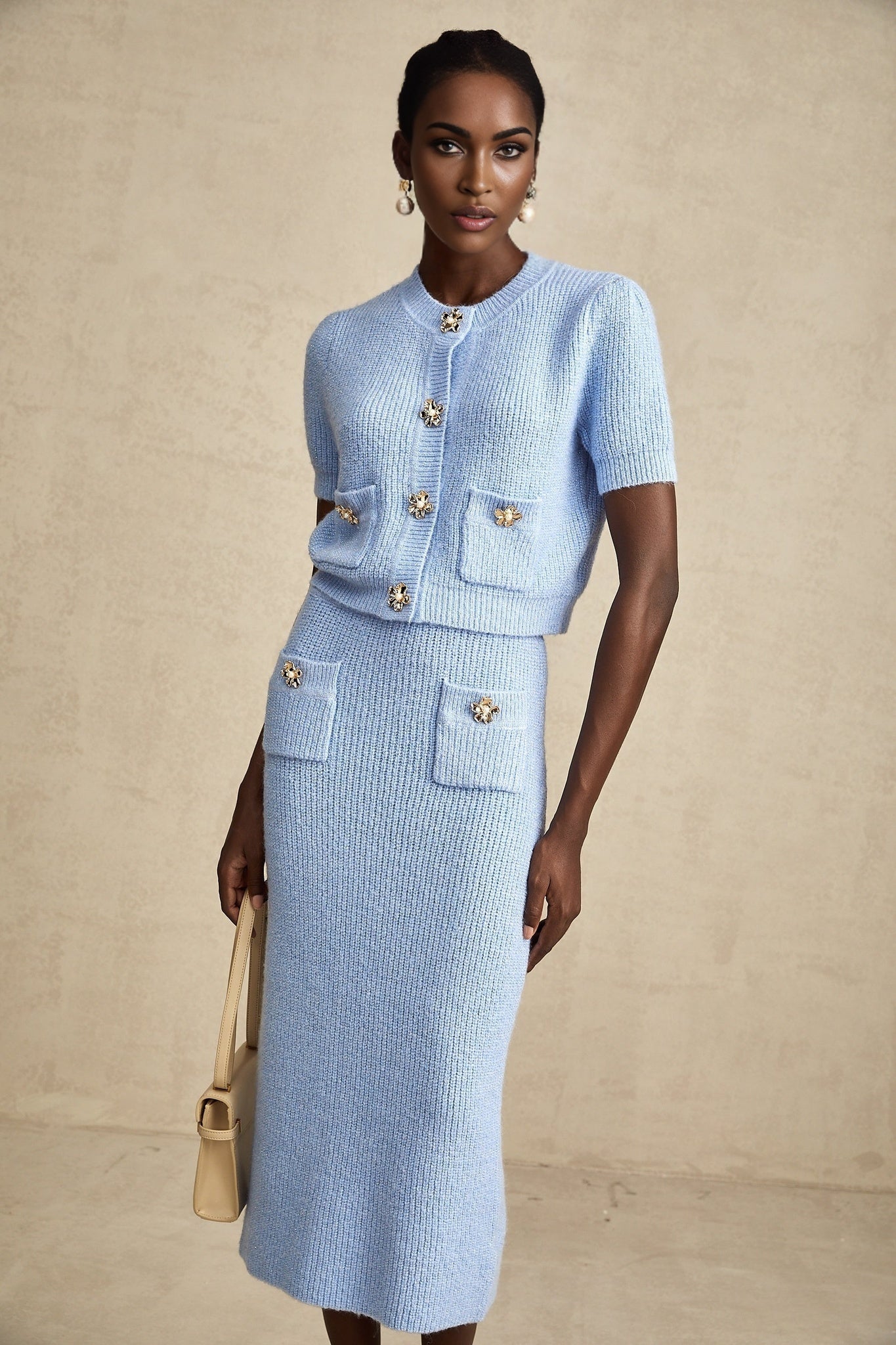Elevate your wardrobe with the Daria Blouse & Skirt Knit Matching Set. Crafted for the discerning fashionista, this exquisite ensemble exudes sophistication and style. The stretch knit fabric hugs your curves effortlessly, while the decorative flower-shaped buttons add a touch of elegance. The blouse features a crew neck, short sleeves, and two front patch pockets, complemented by a front press-stud fastening for a polished finish. Meanwhile, the coordinating skirt boasts a slip-on style and falls gracefully below the knee. Make a statement in 100% Acrylic luxury with this stunning matching set.