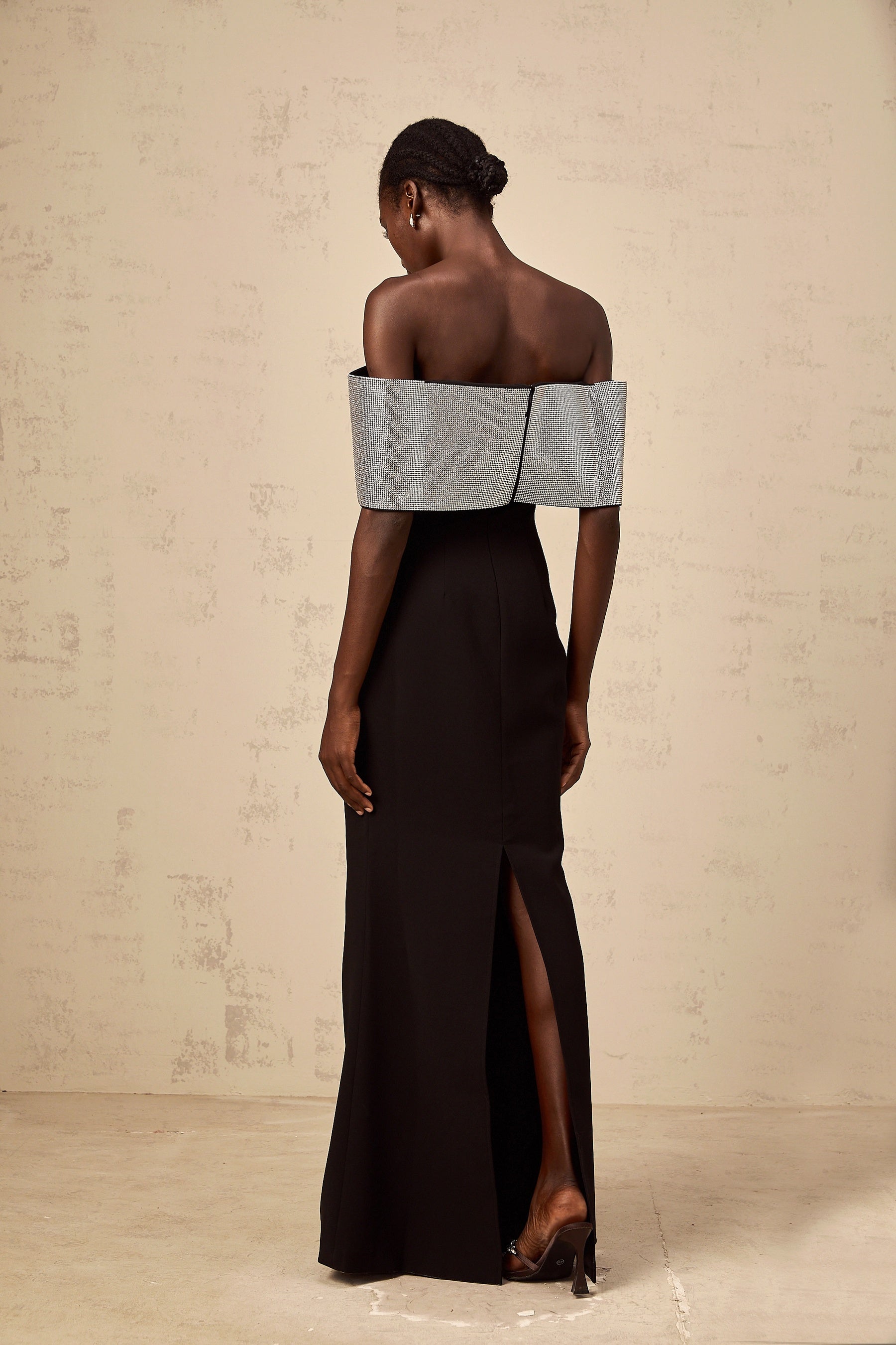 Indulge in sheer elegance with the Delia Maxi Dress, a captivating ensemble that exudes sophistication and charm. Crafted with meticulous attention to detail, this black and silver dress features an alluring off-the-shoulder design accented by a stunning rhinestone bow detail. The fitted silhouette effortlessly accentuates your figure, while the rear slit adds a touch of allure. Designed for the modern woman, this dress boasts a maxi length and a rear zip fastening for ease of wear. Made from a luxurious blend of 75% cotton and 25% terylene, this dress is a statement of refined taste and effortless style.