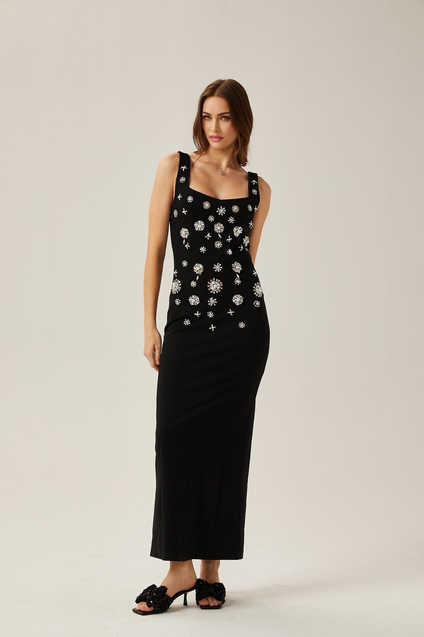 Emanuela Maxi Dress - Scoop Neck Design - Crystal Embellishment - Rear Slit - Rear Zip Fastening