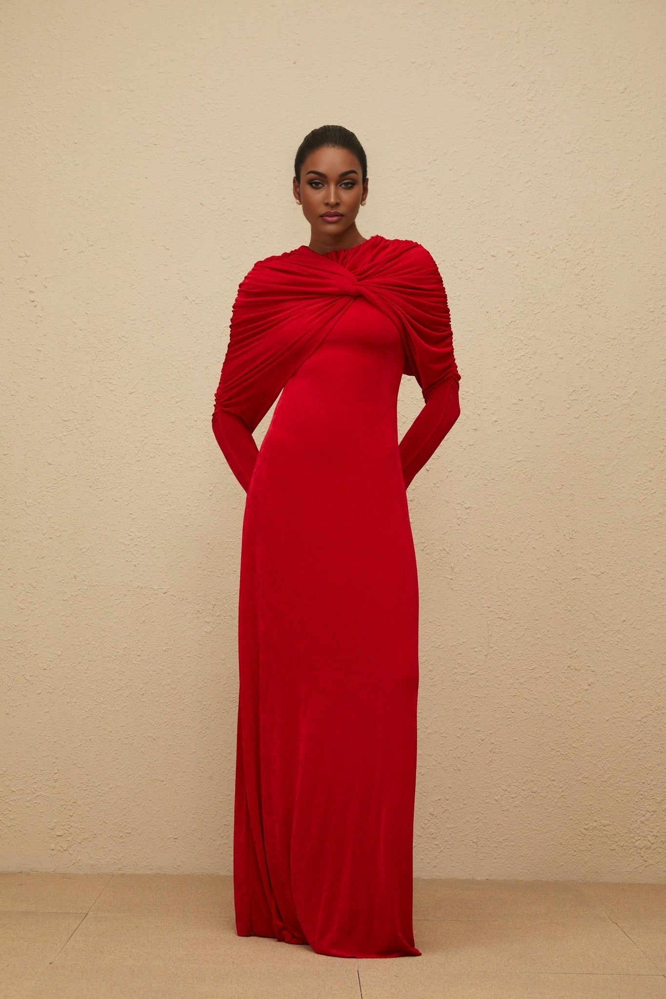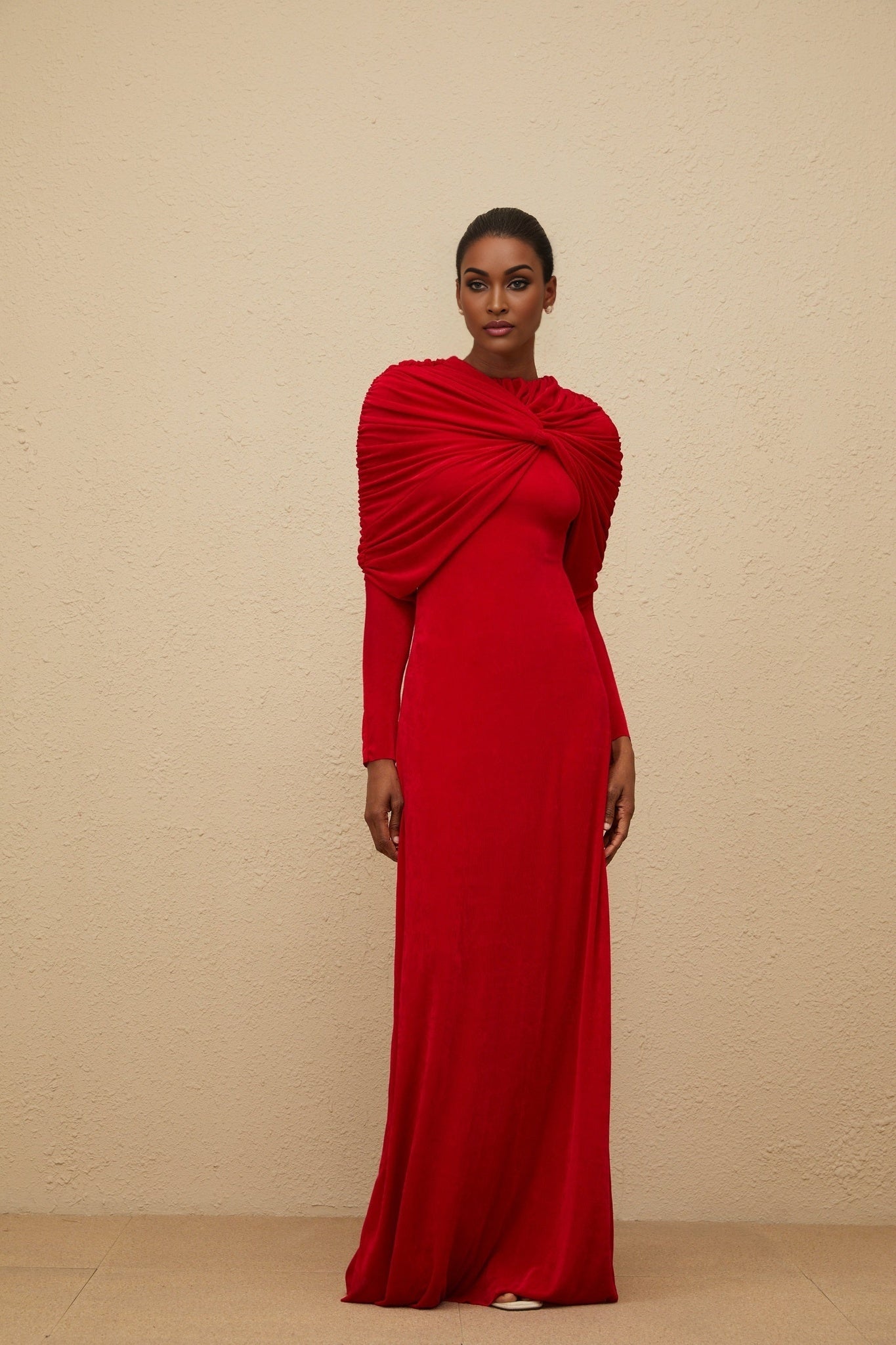 Federica Maxi Dress - Red Cape Design - Ruched Detail - Long Sleeves