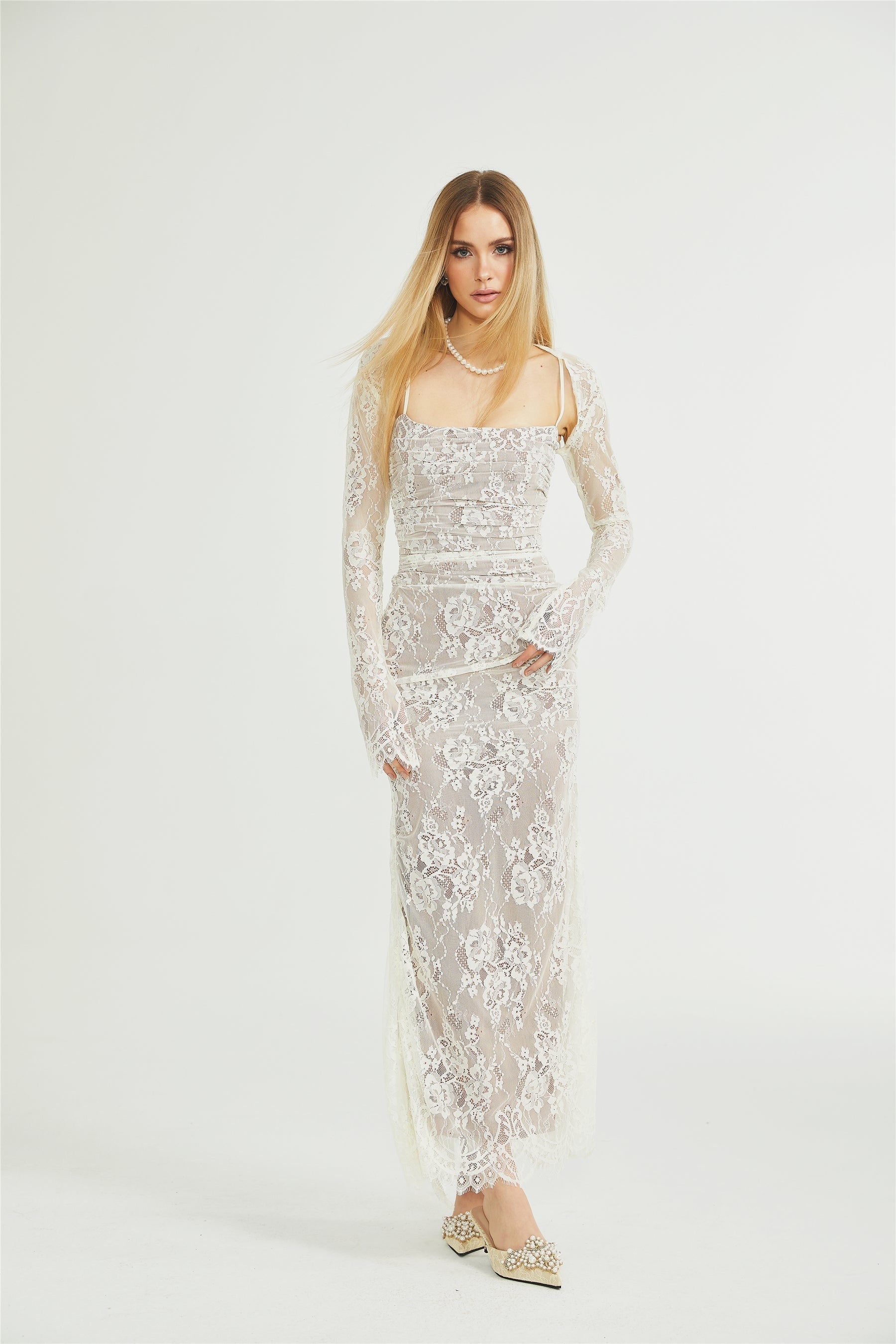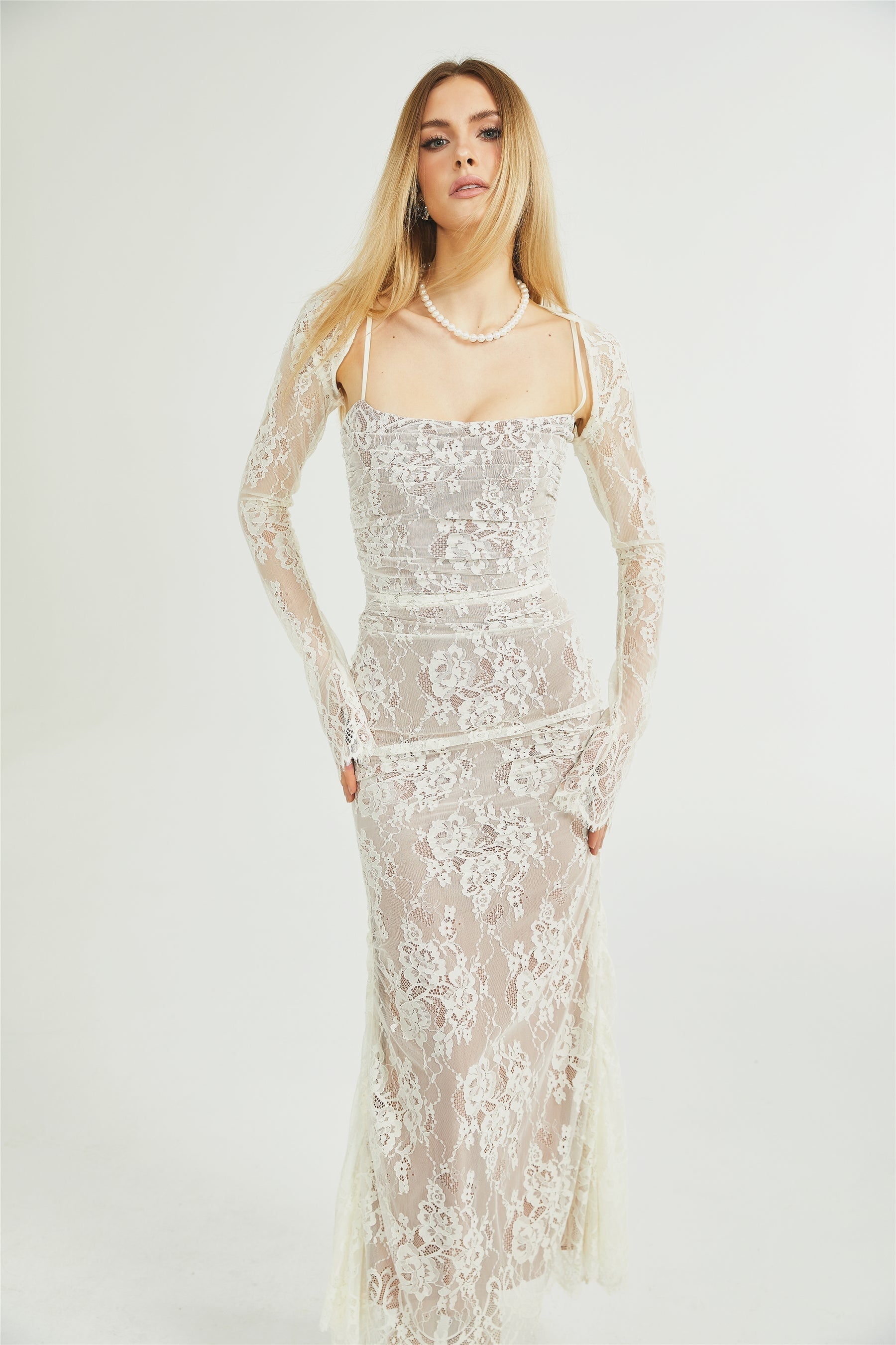 Elevate your style with the Flaminia Floral Maxi Dress. Crafted to perfection, this exquisite piece features delicate spaghetti straps, intricate pleating, and mesh detailing that adds a touch of elegance. Adorned with captivating floral-lace accents, this dress is a true embodiment of sophistication. The side zip fastening ensures a seamless fit, while the rear tie fastening adds a charming detail. Complete with a matching shawl, this maxi length dress is made from 100% luxurious polyester fiber, making it a must-have for any special occasion.