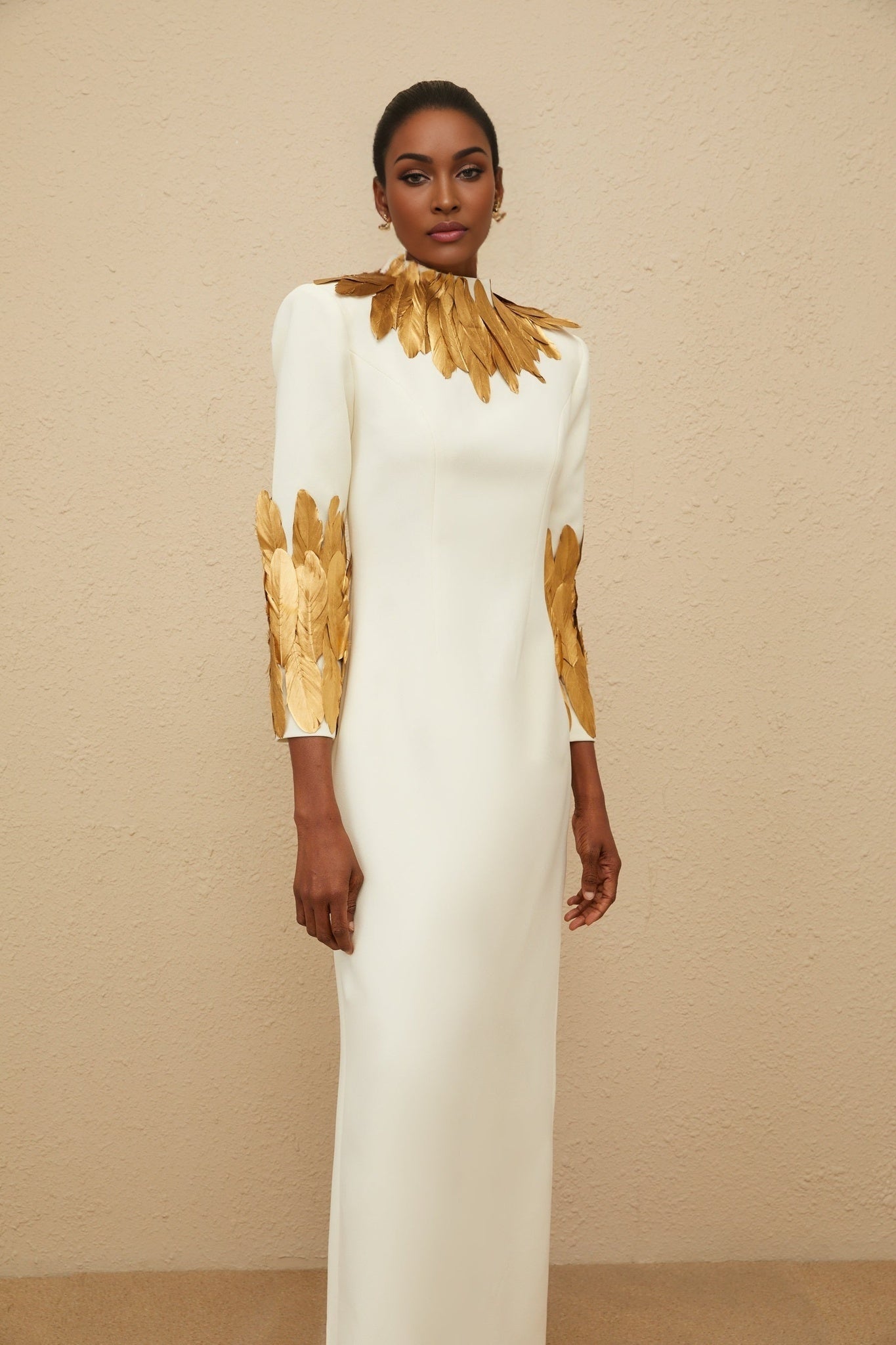 Flora Maxi Dress - White & Gold Feather Trim Long Sleeve Elegant Slit Zip Floor-Length