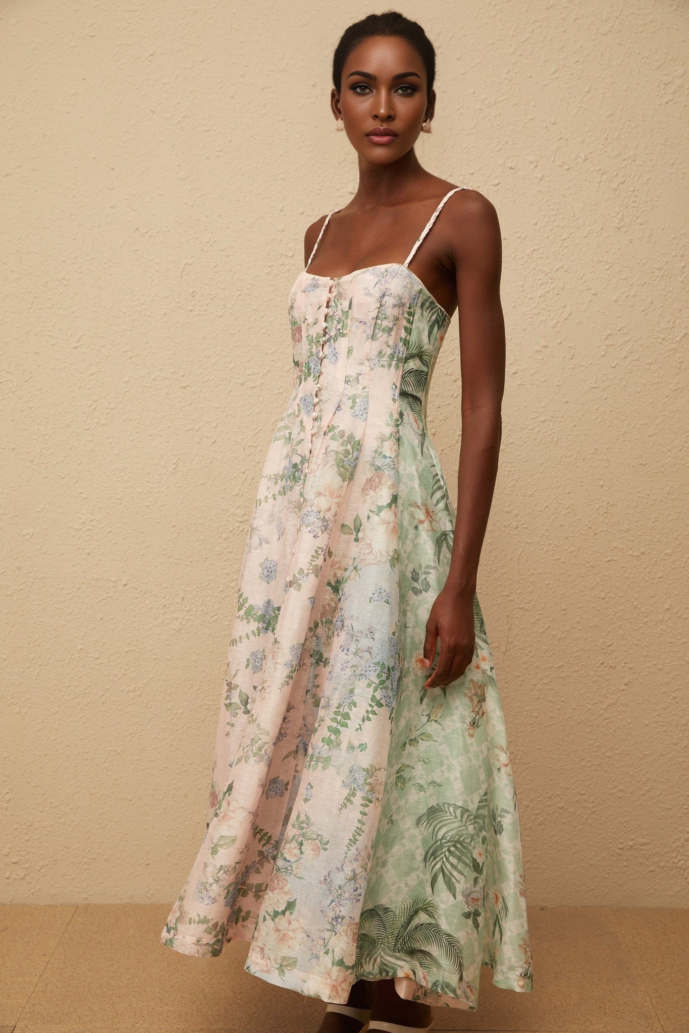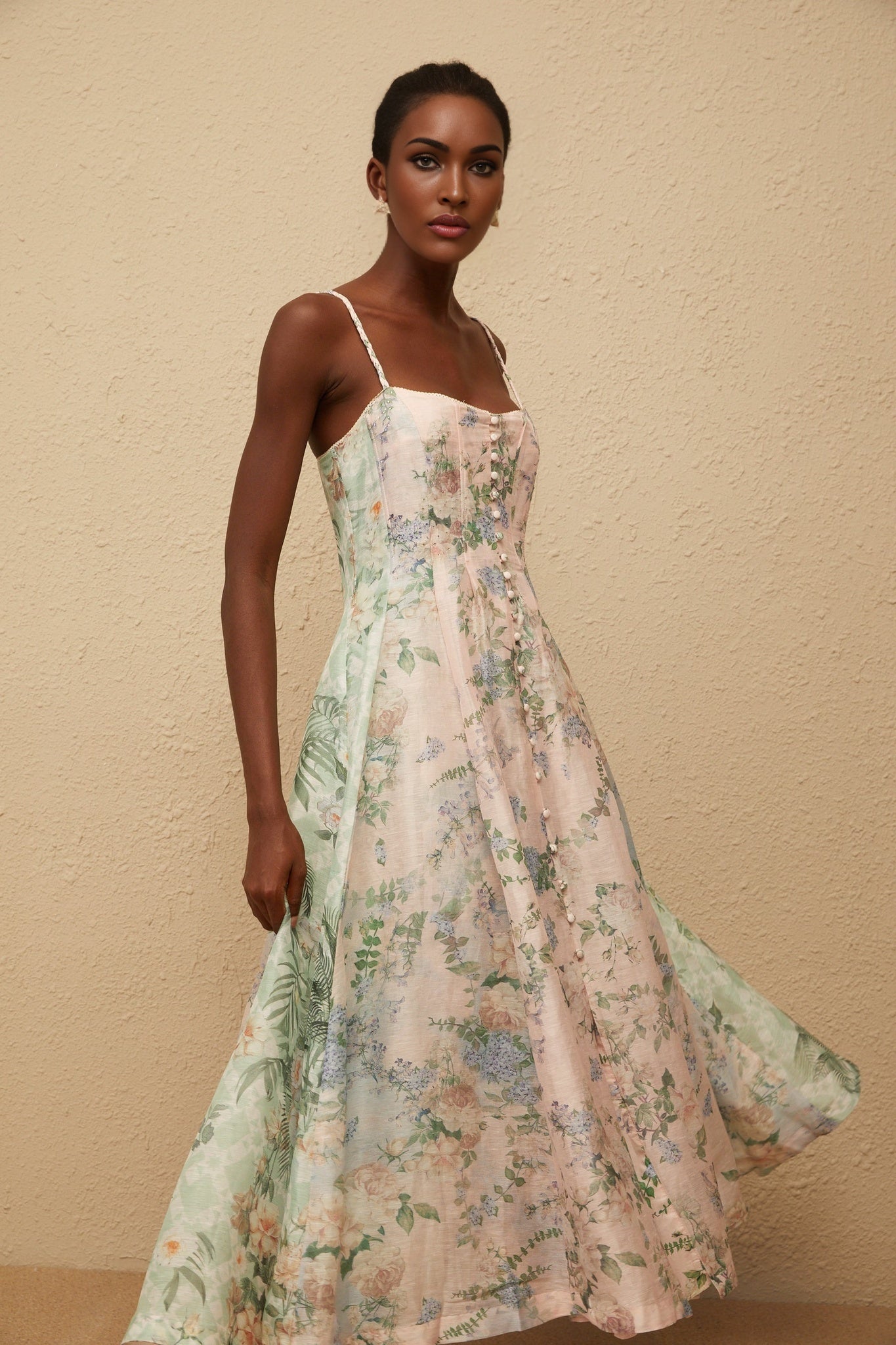 Freya Maxi Dress - Square Neckline - Sleeveless with Adjustable Straps - Boned Bodice - Floral
