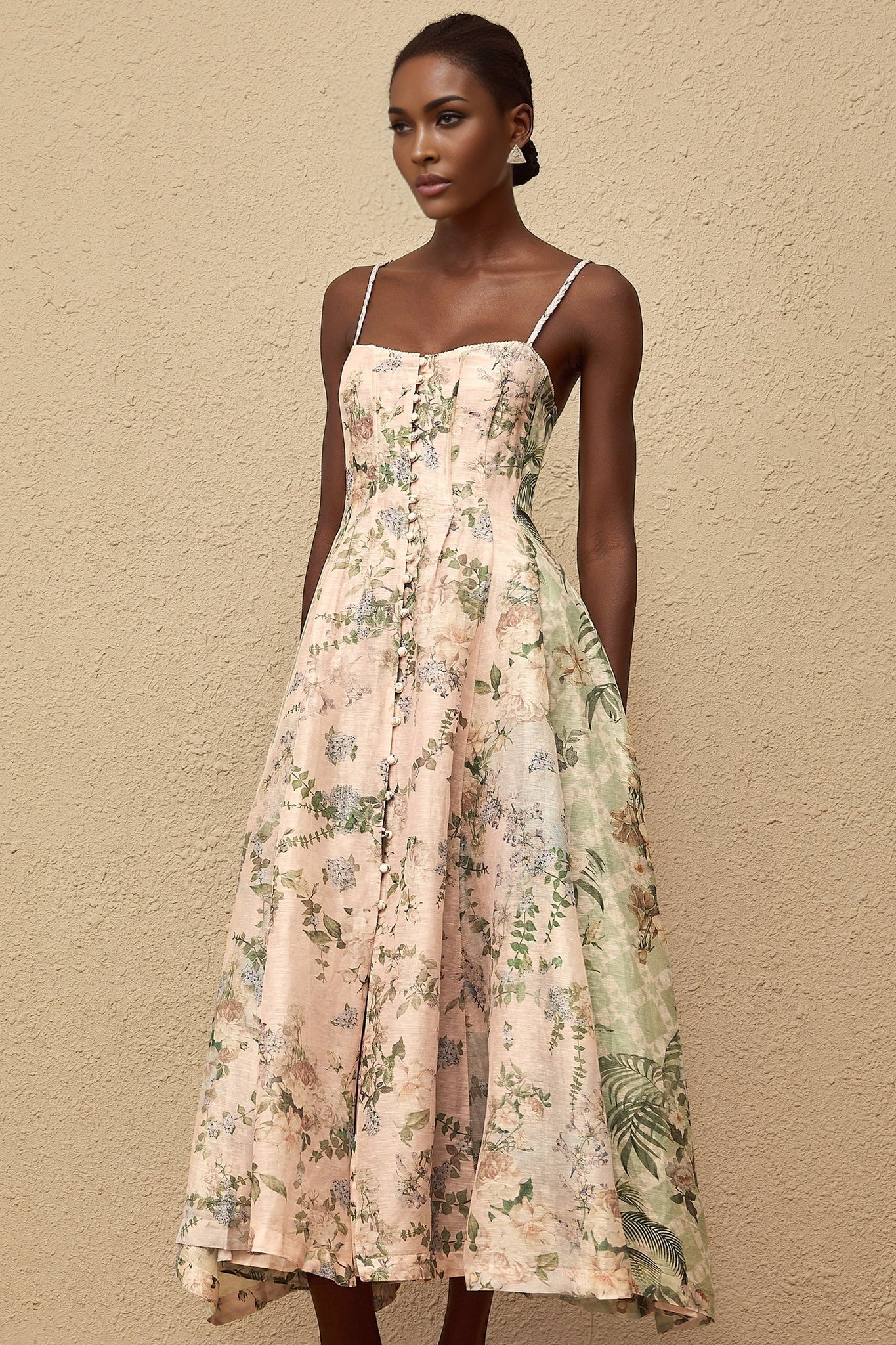 Emanate elegance in the Freya Maxi Dress in Pink Floral with Rhinestone Embellished Bouquet. This exquisite piece, seen on a 1.77m model in size M, boasts a boned bodice and fitted waistline for a flattering silhouette. The floral print is accentuated by delicate rhinestone detailing, while a voluminous skirt adds a touch of drama. Featuring a square neck and sleeveless design with adjustable spaghetti straps, this dress exudes sophistication. With a front button fastening and rear zip closure, this maxi length dress is crafted from 82% polyester and 18% linen for a luxurious feel.
