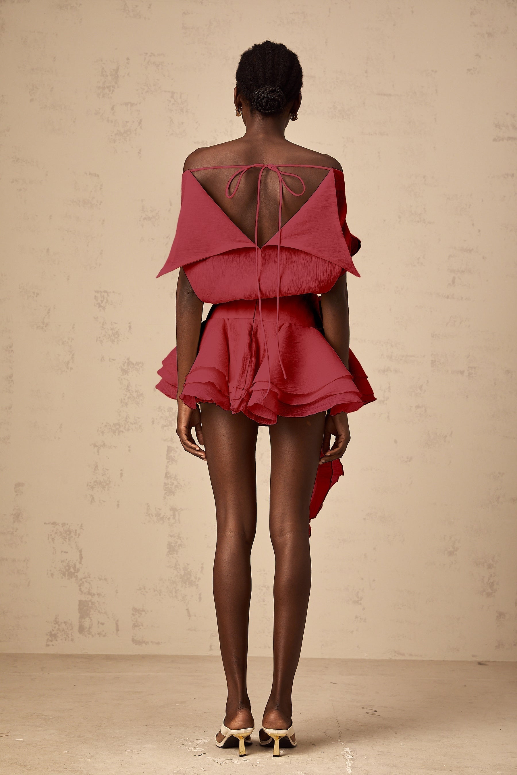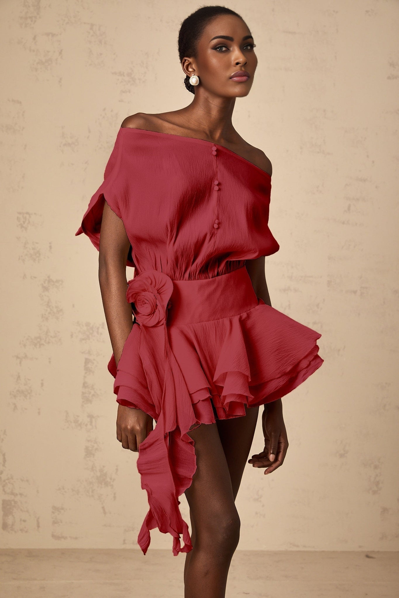 Indulge in elegance with the Giorgia Mini Dress, a masterpiece boasting exquisite floral appliqué and a mesmerizing off-shoulder silhouette. Crafted with a cinched waist for a flattering fit, this dress features delicate pleated detailing and ribbon accents for a touch of opulence. Adorned with charming decorative buttons, a flounce hem, and a tiered skirt, this piece exudes sophistication at every turn. Complete with internal shorts, a rear tie, and zip fastening, this thigh-length dress is a vision of modern glamour. Made from 100% luxurious Terylene fiber, it is a timeless ensemble for your upscale wardrobe.