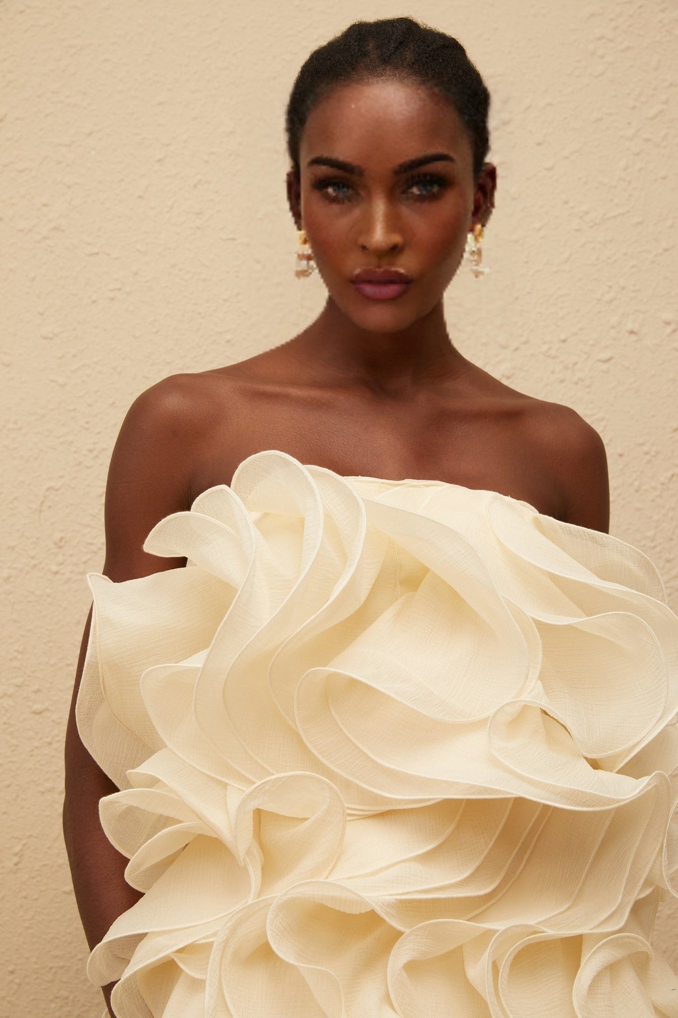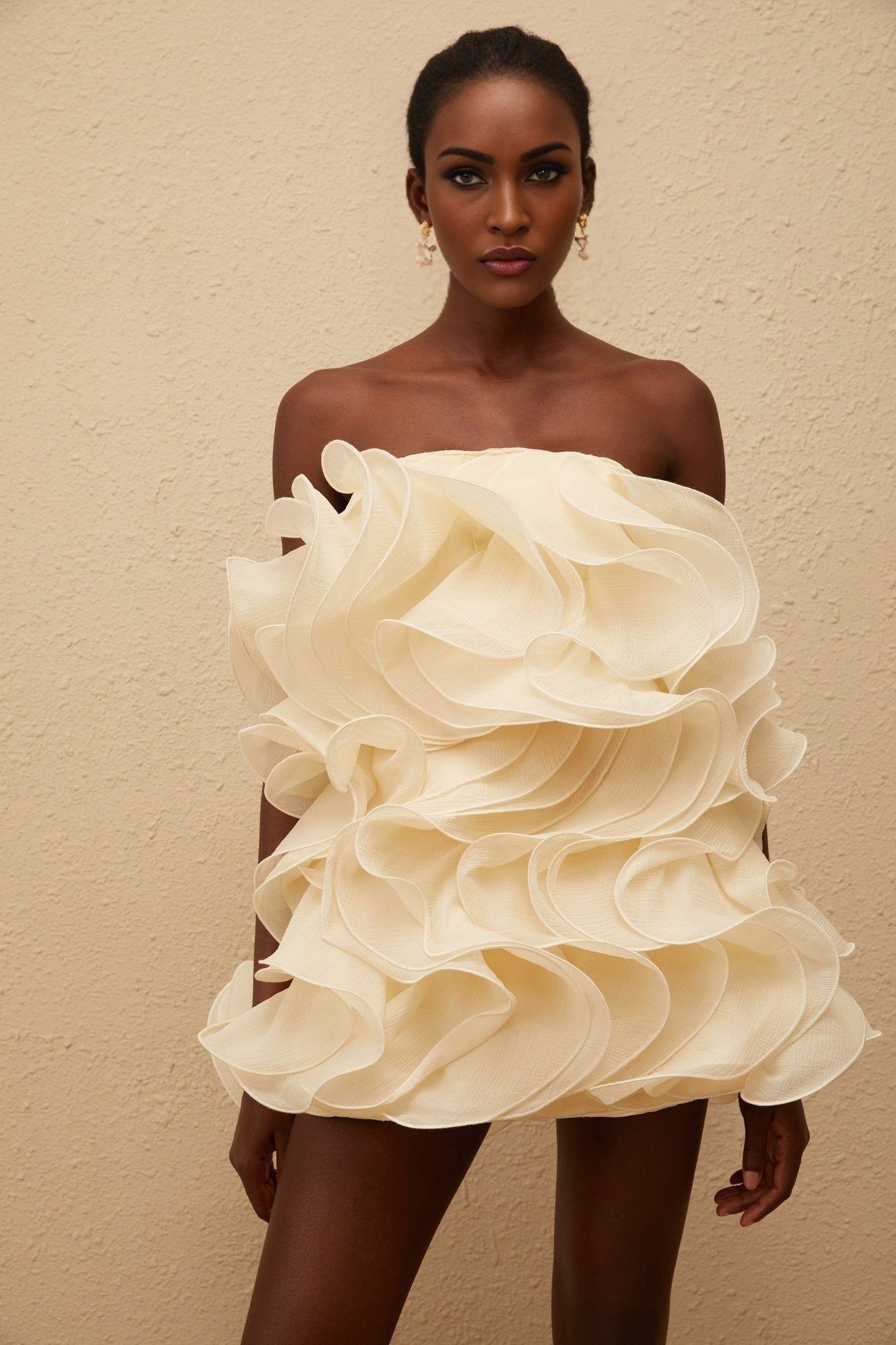 Exude ethereal elegance in the Helena Mini Dress in a pristine cream white hue. Designed with a chic off-the-shoulder silhouette and sleeveless cut, this dress features a luxurious layered design with exquisite 3D-petal detailing that adds a whimsical touch. Crafted for a perfect fit, it showcases a flattering mini length and a sophisticated rear zip fastening. This dress, made from 100% Terylene fiber, is a symbol of sophistication and feminine grace, making it an essential piece for any special occasion.