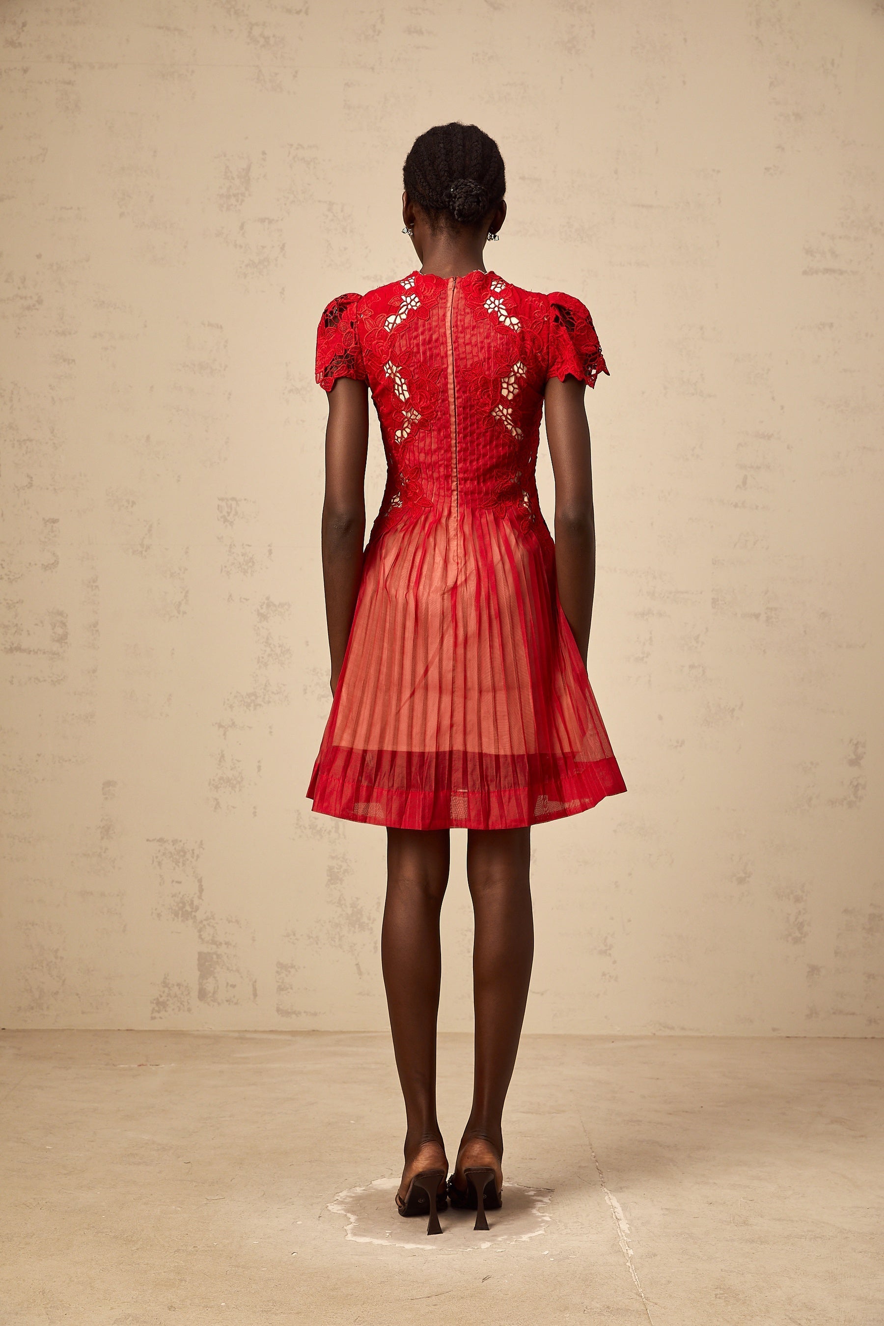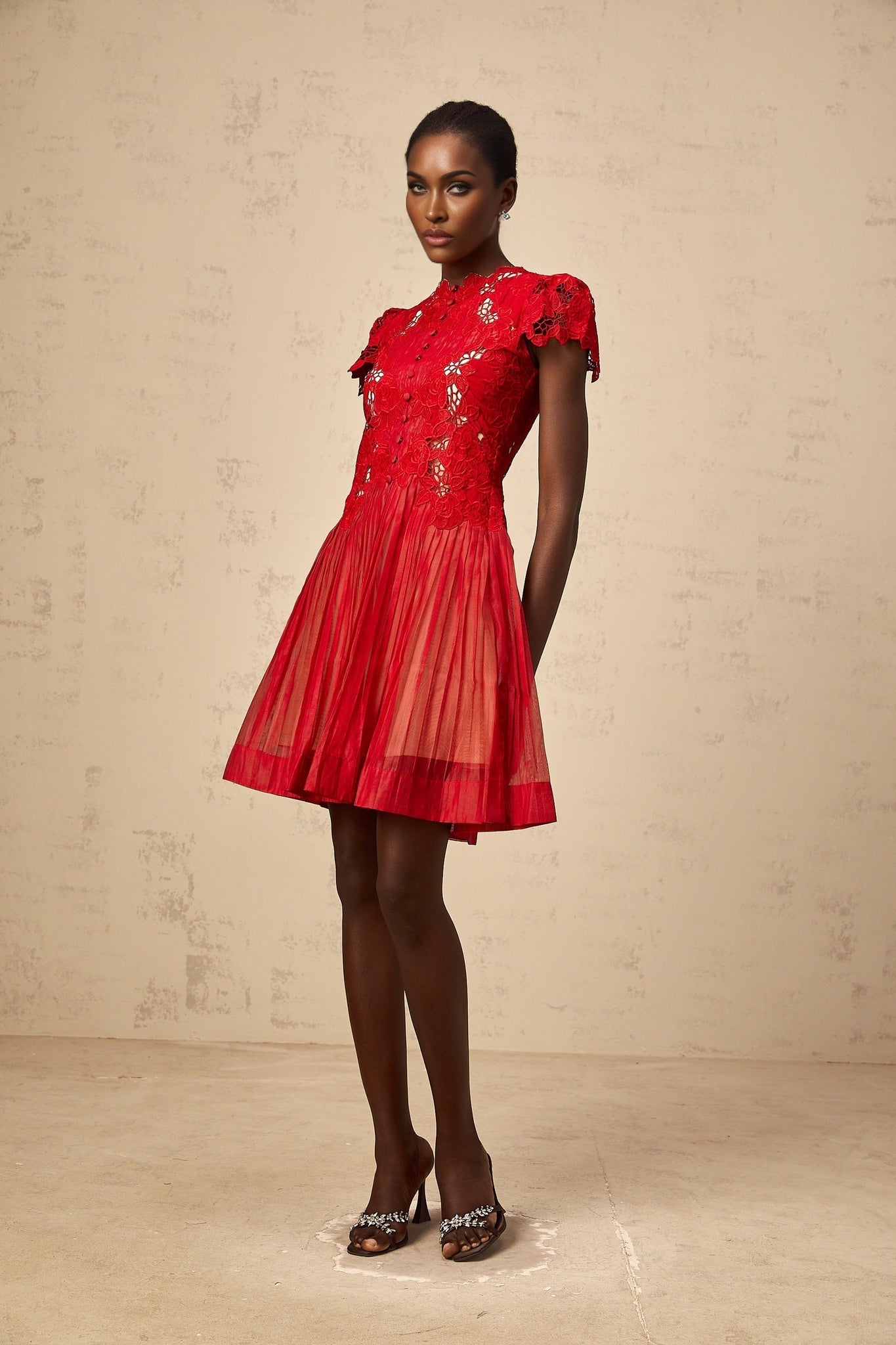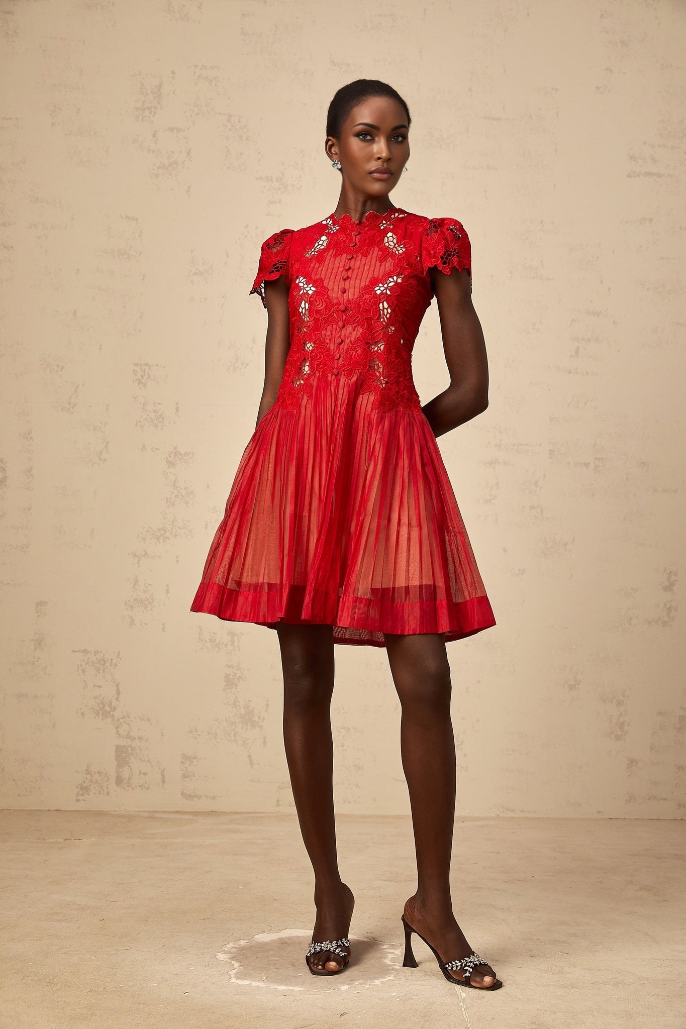 Exude elegance in the Holly Mini Dress adorned with intricate flower embroidery and delicate pleats. Crafted for sophistication, this thigh-length dress features a flattering crew neck and cap sleeves, accentuated by a graceful flounce hem. The exquisite design is complemented by a rear zip fastening and half lining for a luxurious feel. Made from 100% premium Terylene fiber, this red masterpiece is a timeless addition to your wardrobe. Elevate your style with the Holly Mini Dress, a symbol of refined taste and impeccable craftsmanship.