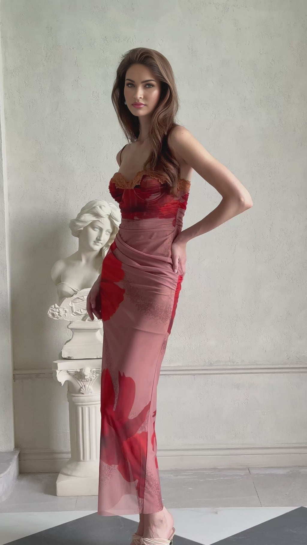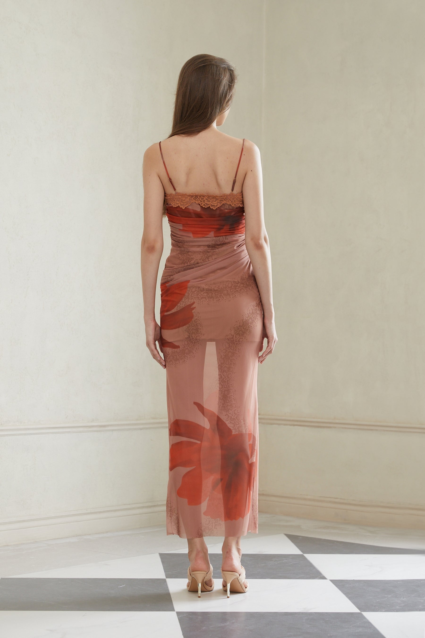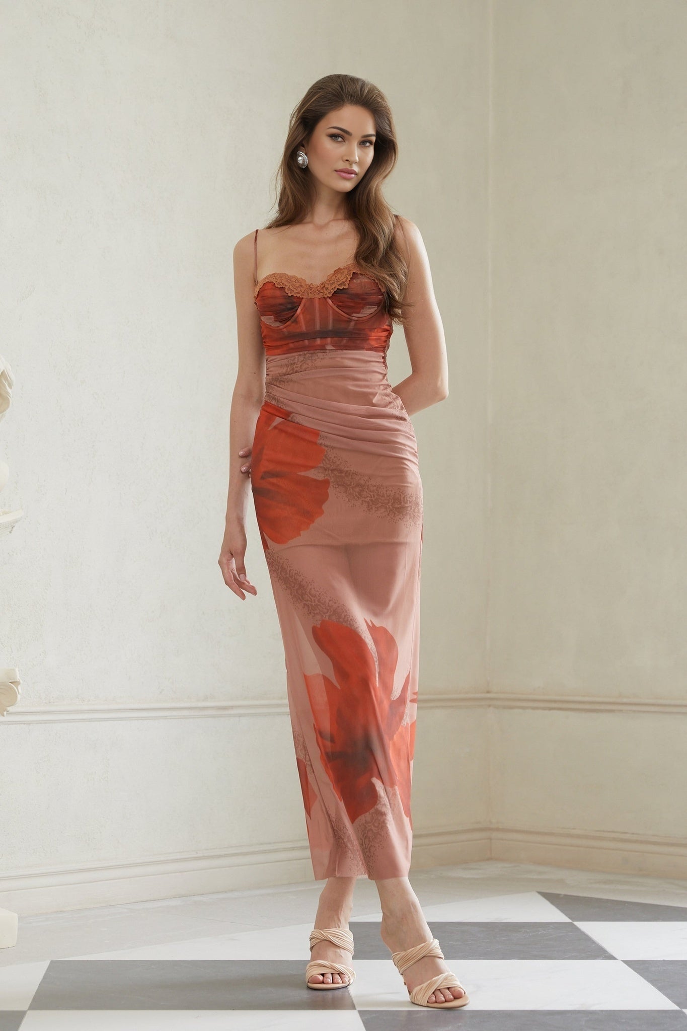 Isla Maxi Dress in Brown Floral Mesh & Lace Trim exudes elegance with its fitted silhouette and sweetheart neckline. Made from a luxurious blend of 92% Terylene fiber and 8% Spandex, this ankle-length dress features intricate floral print mesh, delicate lace trim, and flattering ruched detailing. The built-in underwire cups and adjustable spaghetti straps provide a perfect fit, while the side zip fastening ensures easy wear. Ideal for special occasions, this sleeveless dress, available in Brown & Red, is a timeless wardrobe staple that effortlessly combines sophistication with modern charm.
