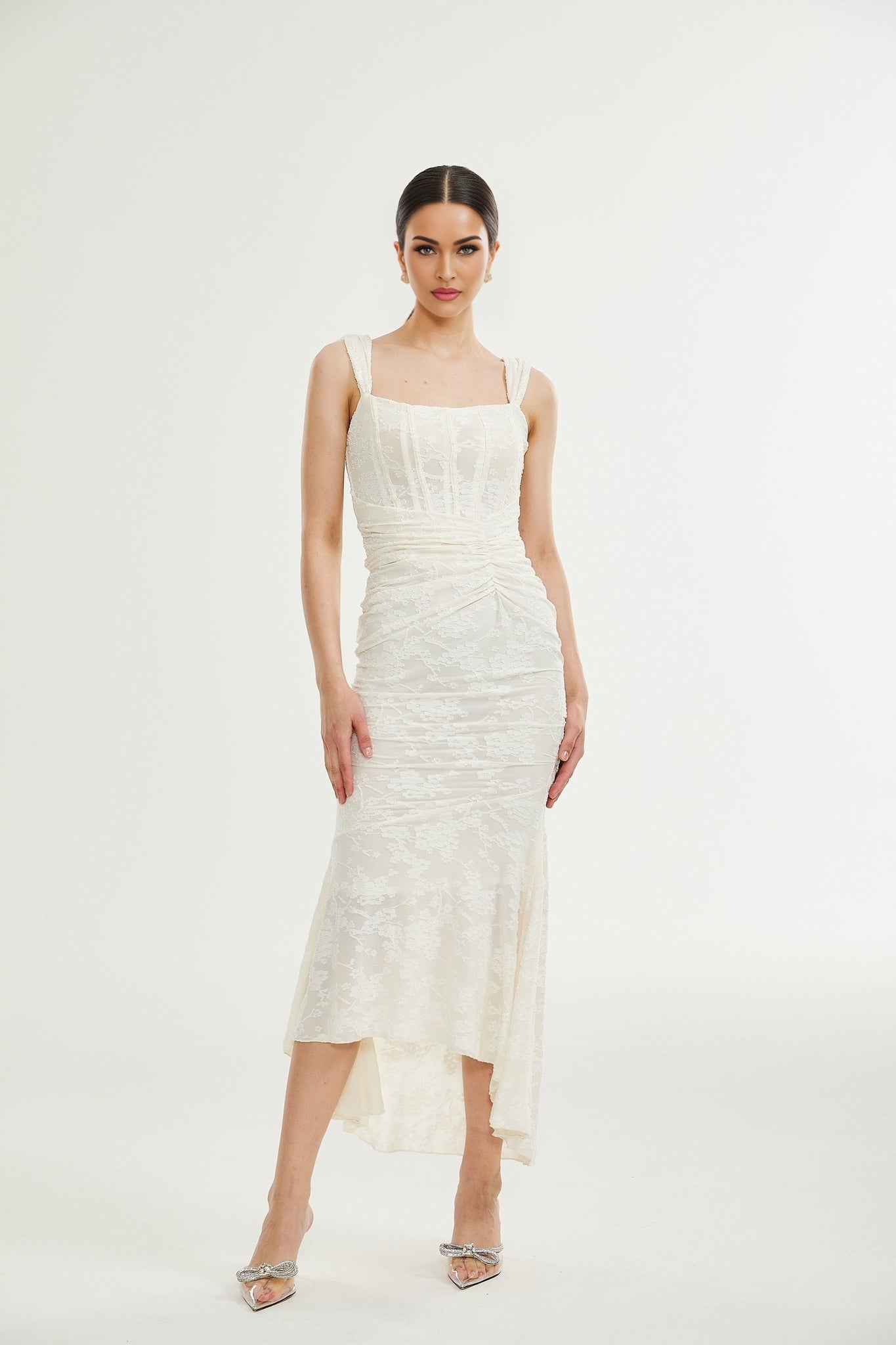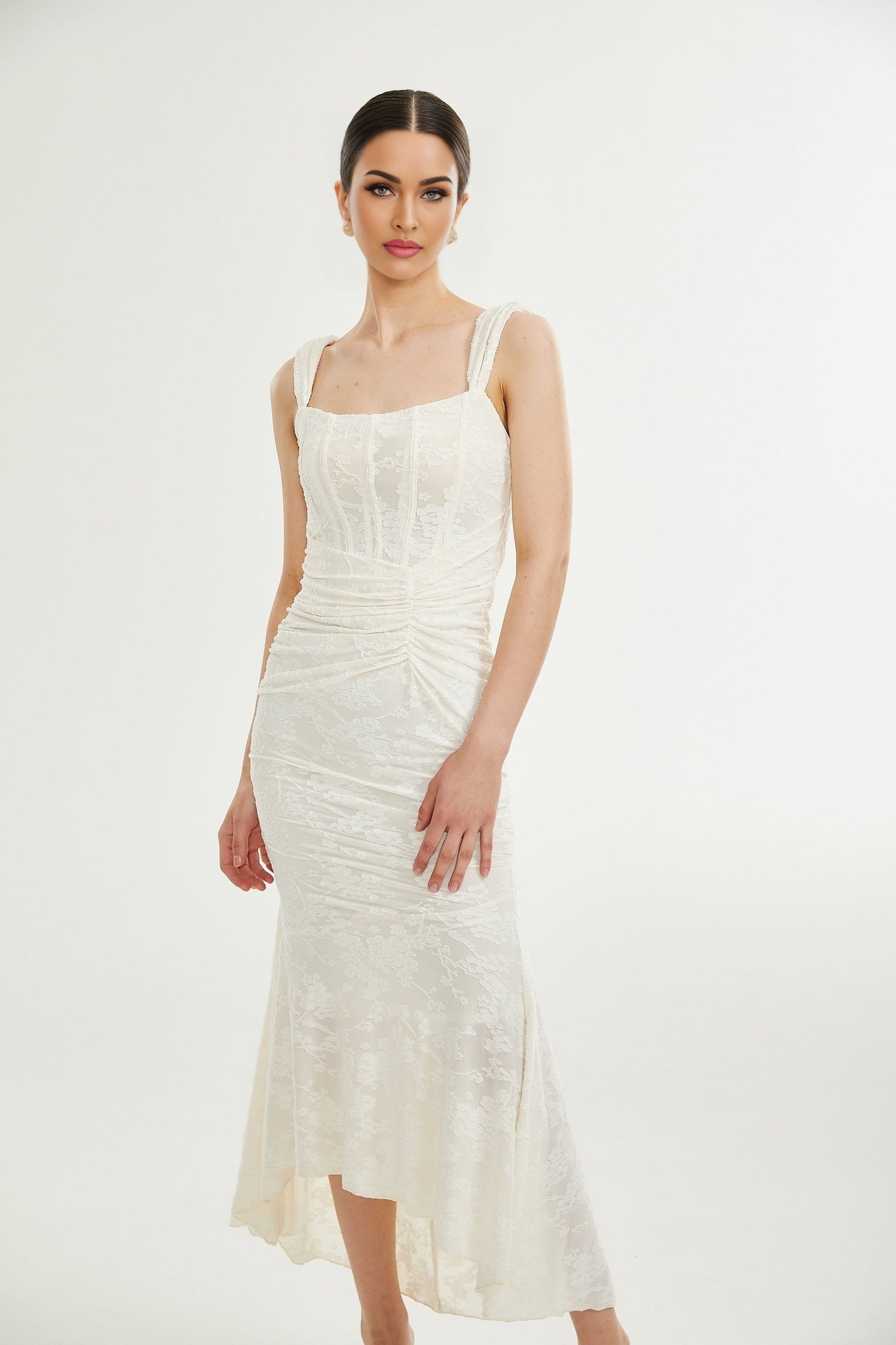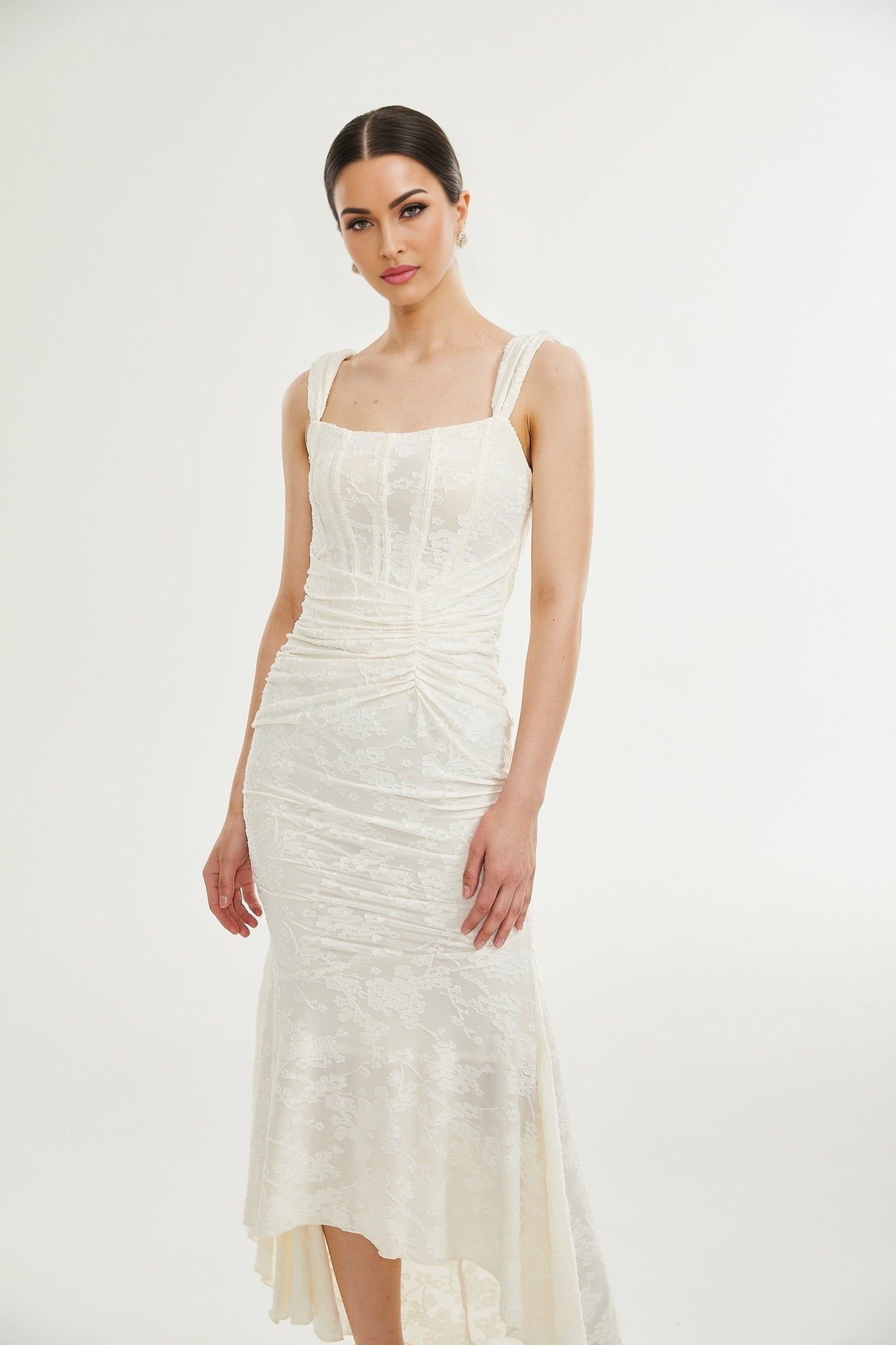 Ivory Maxi Dress - Spaghetti Straps - Square Neck - Corset Style - Gathered Detailing - Jacquard Fabric
