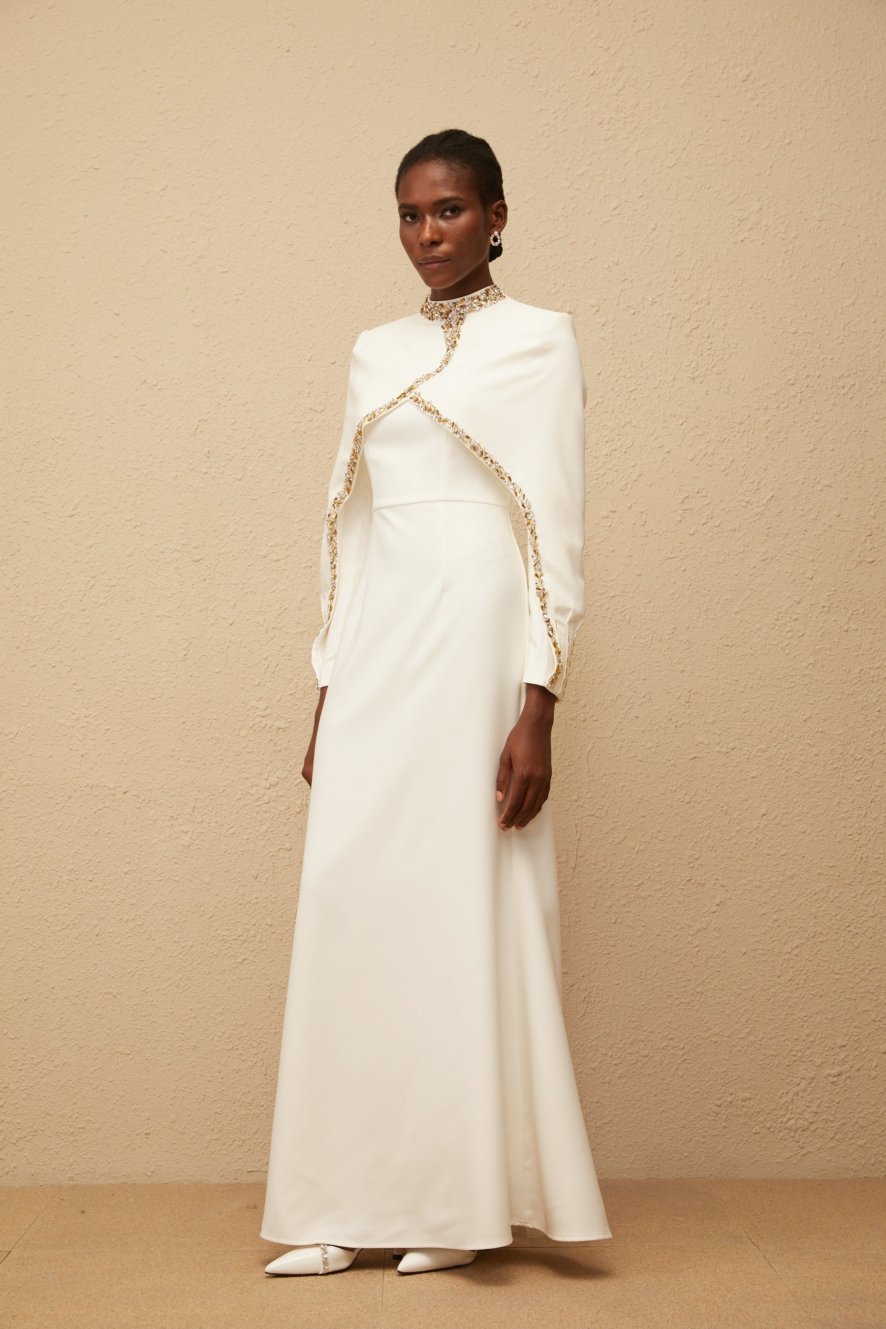Lune Gown – Embellished – Shawl Design – Crew Neck – Long Sleeves – Fitted Waist – Flared Hem – Rear Zip – Maxi Length
