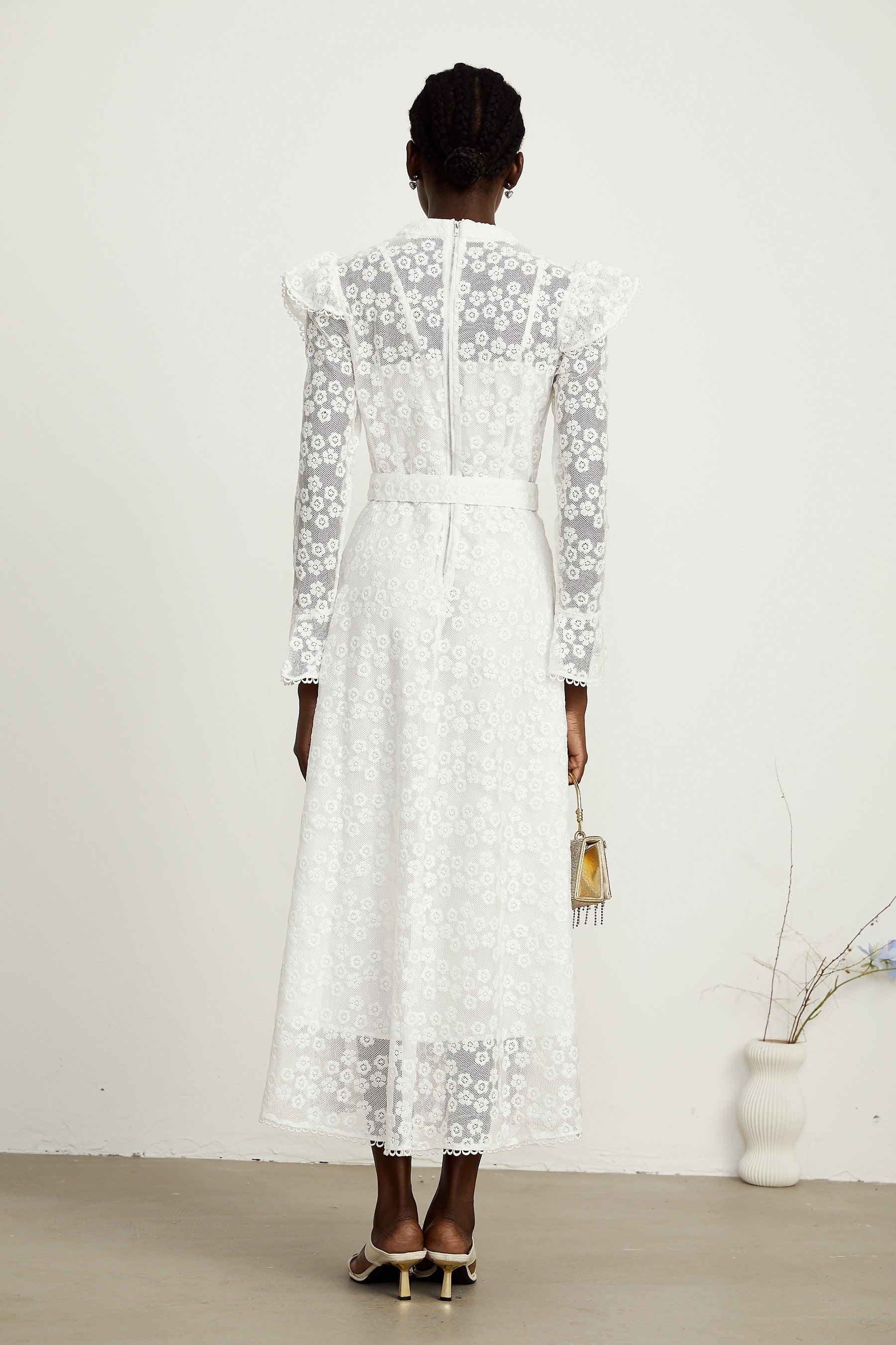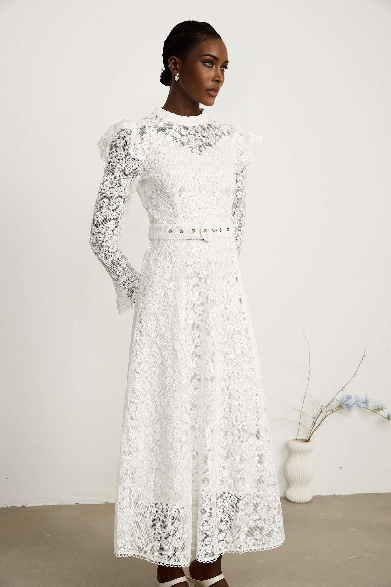 Macy Floral Midi Dress - Long Sleeved - Round Neck - Detailed Embroidery - Detachable Waist Belt