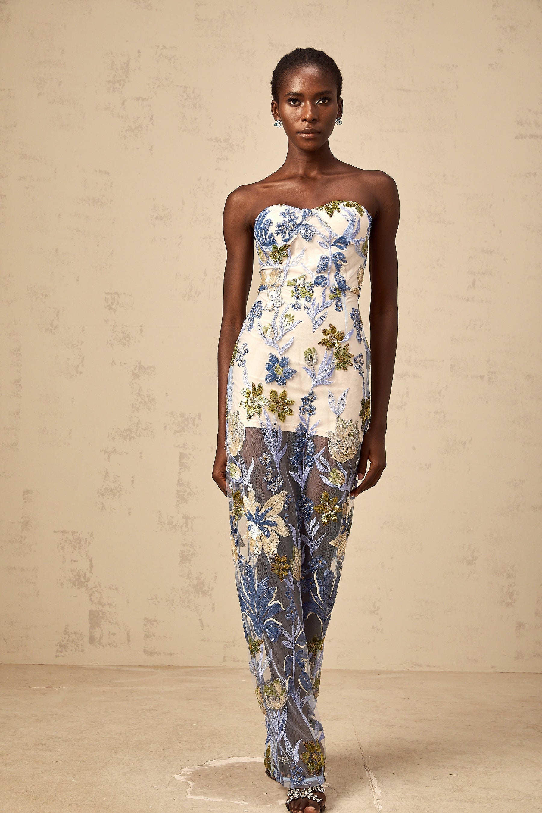 Mckenna Maxi Dress - Blue Sequined Flower Embroidered Sweetheart Corset