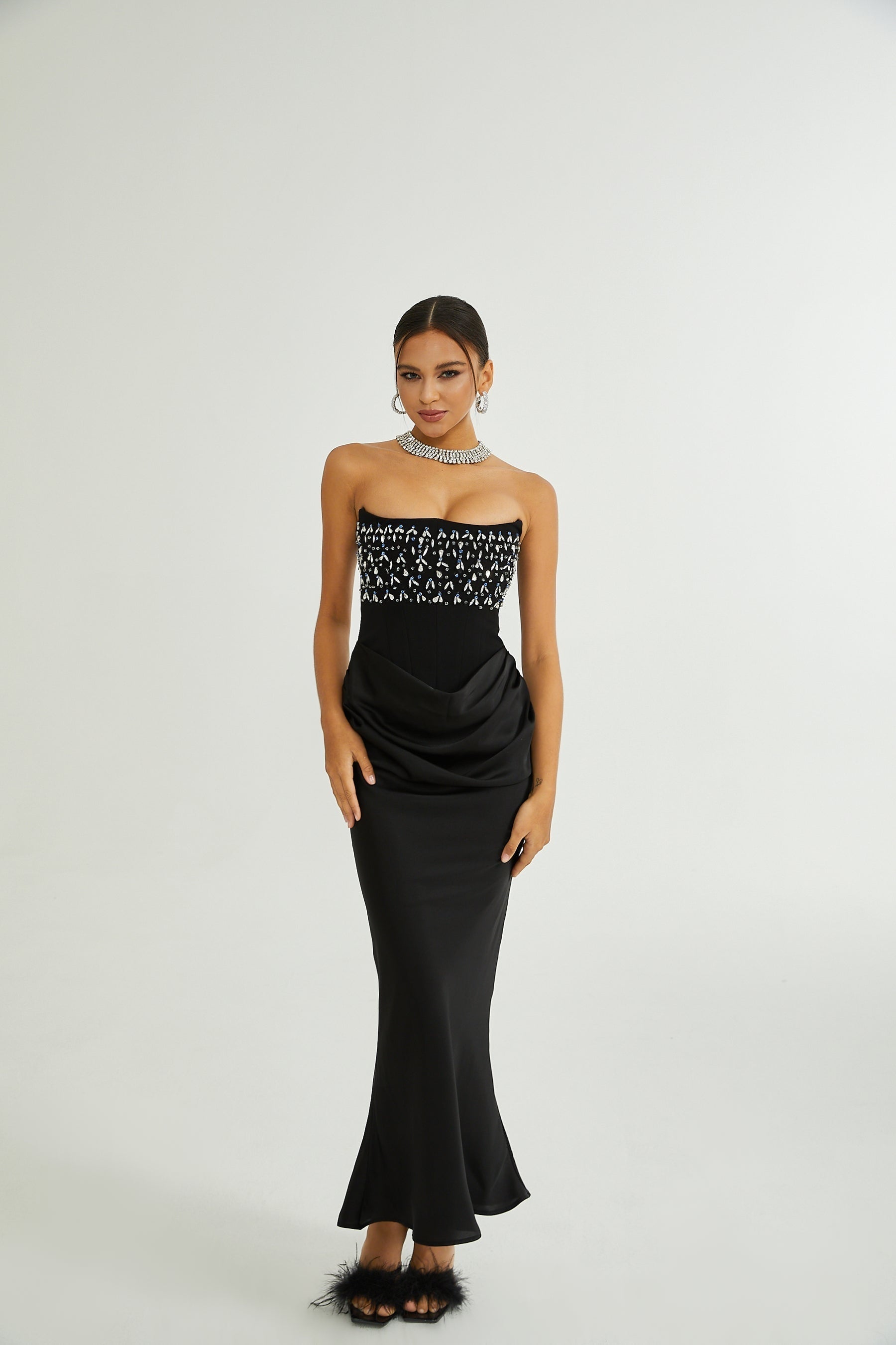Elevate your evening attire with the Melissa Maxi Dress in Timeless, exuding sophistication and elegance. This black off-the-shoulder masterpiece features exquisite pleating and dazzling crystal embellishments that catch the light effortlessly. The flared hem adds a touch of drama while the rear zip fastening ensures a seamless fit. Crafted from 100% luxurious Terylene fiber, this maxi length dress epitomizes refined glamour, making it a timeless addition to your wardrobe for special occasions. Make a statement in the Melissa Maxi Dress, a true embodiment of luxury and style.