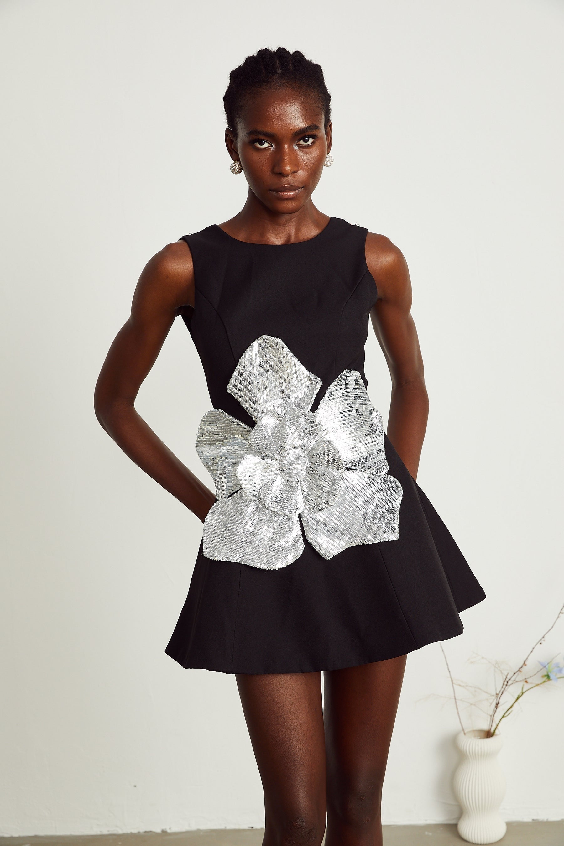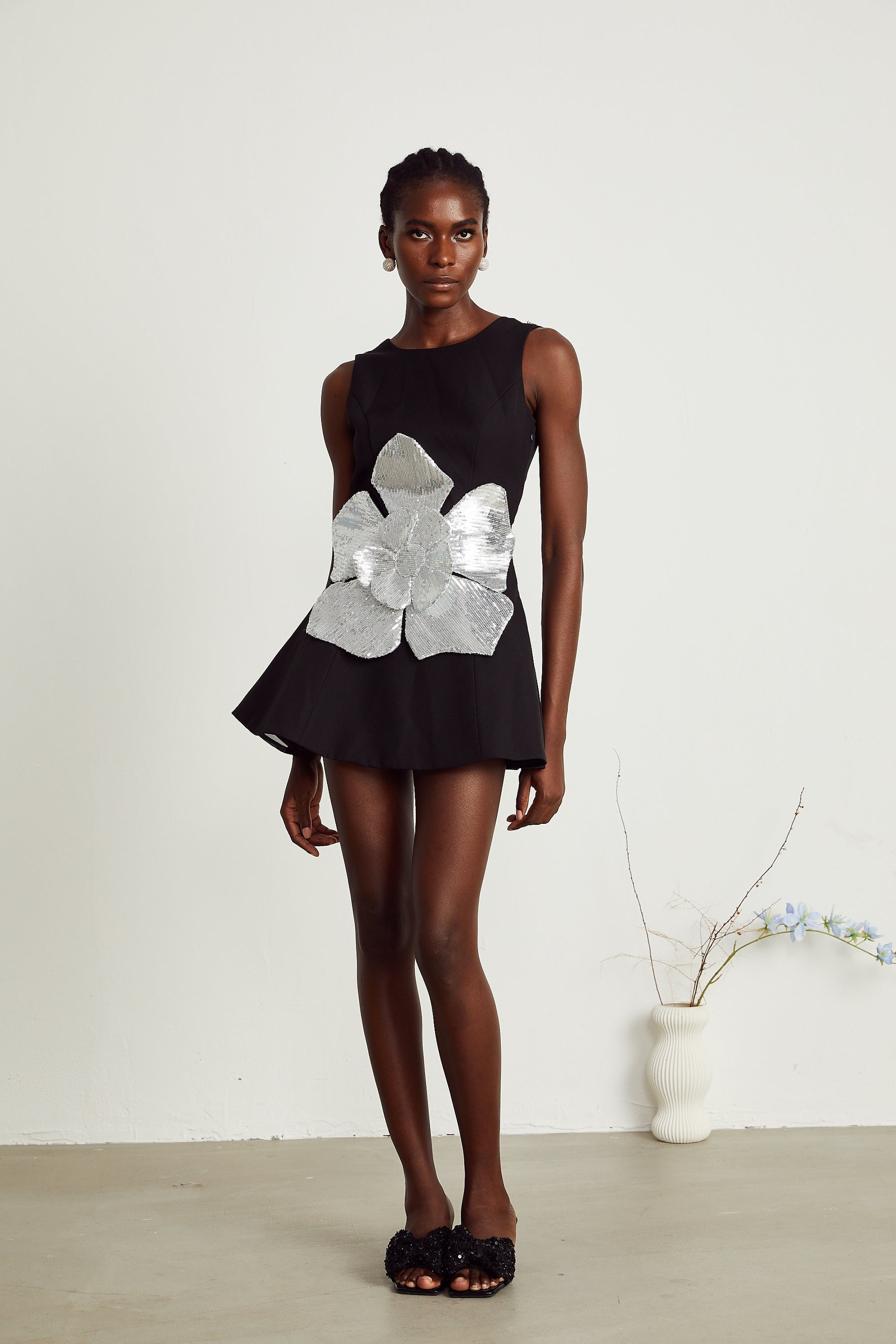 Monica Mini Dress – Sleeveless – Round Neck – Open Back – Floral Appliqué – A-Line Skirt – Sequin Embellishment – Rear Zip