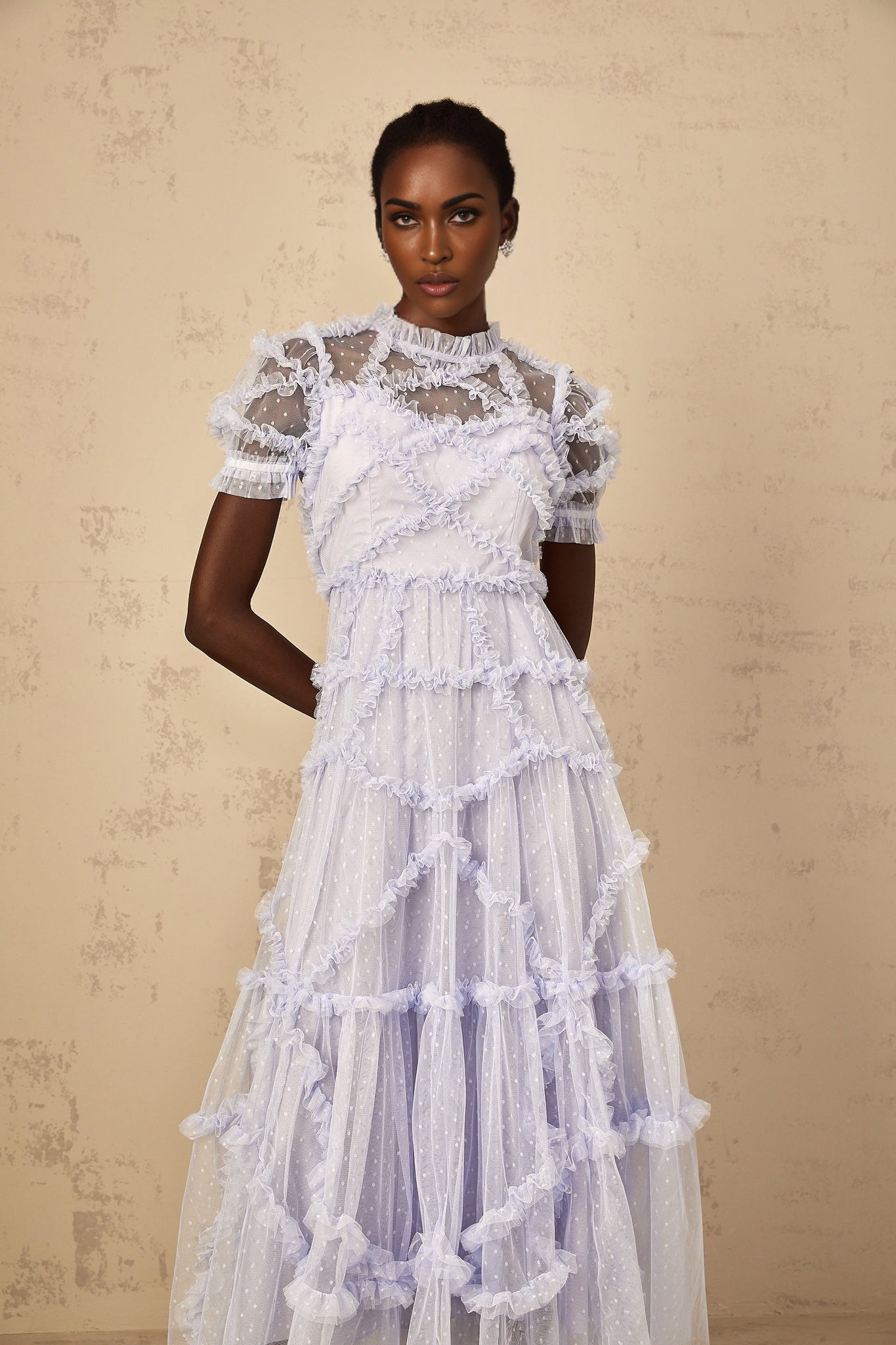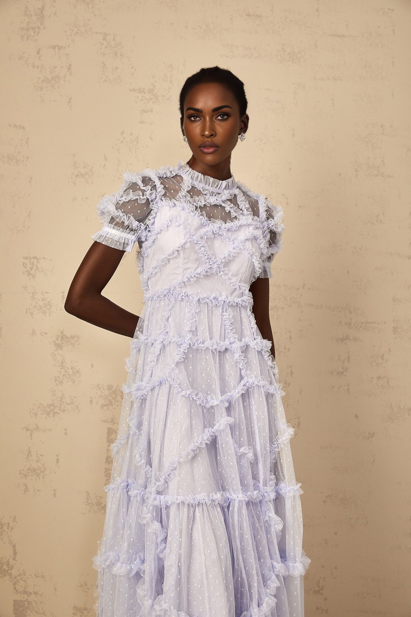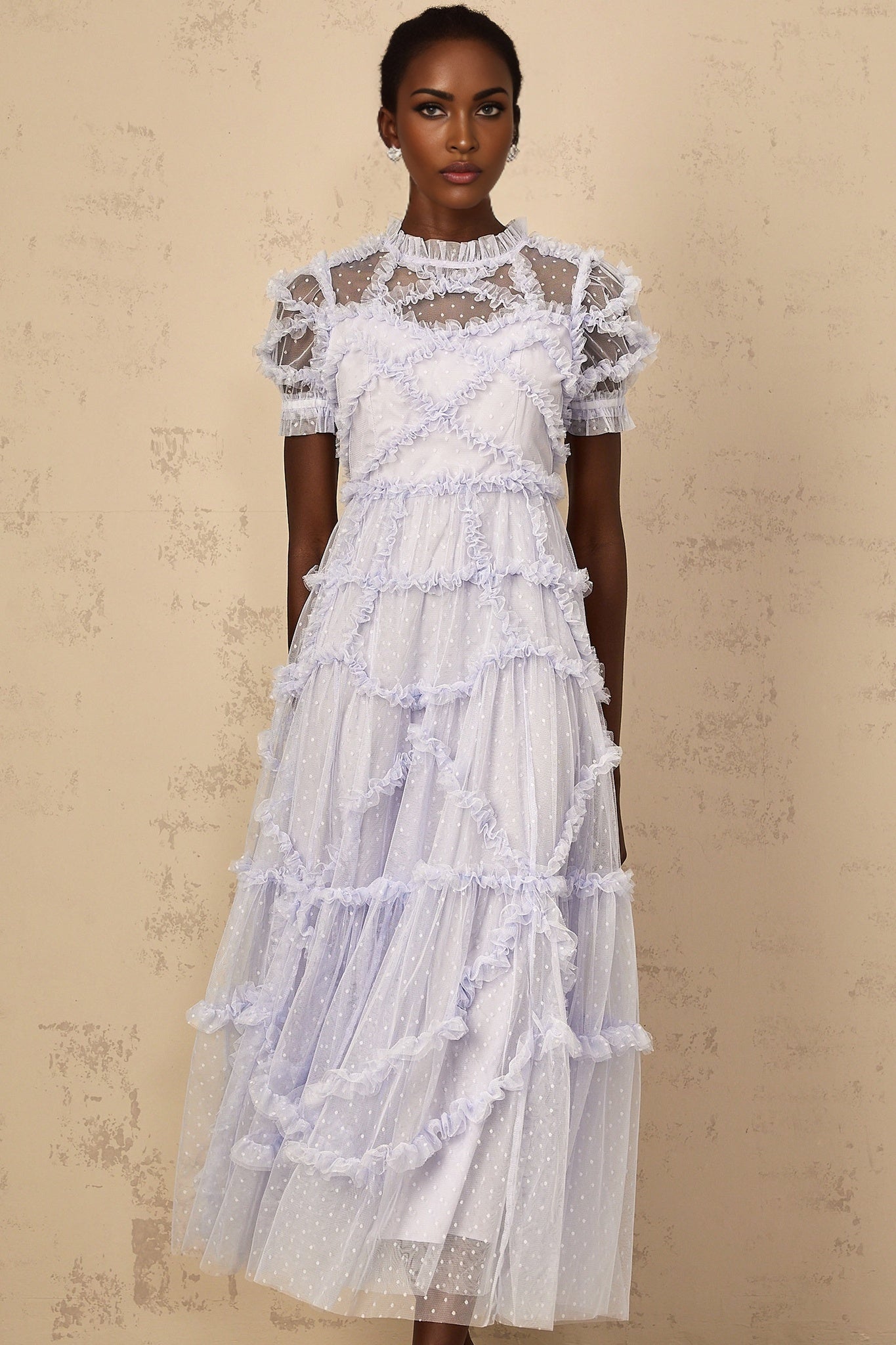 Elevate your style with the Nadia Maxi Dress, a vision of elegance and sophistication. Crafted from luxurious tulle in a mesmerizing polka-dot print, this dress exudes charm and grace. The tiered ruffle design and frilled neck add a whimsical touch, while the cinched waist beautifully accentuates your silhouette. Featuring short sleeves and a maxi length, this dress is perfect for special occasions. The shirred effect and rear zip fastening provide comfort and ease of wear. Embrace a sense of enchantment and beauty in every step with this exquisite piece, a true manifestation of timeless glamour.