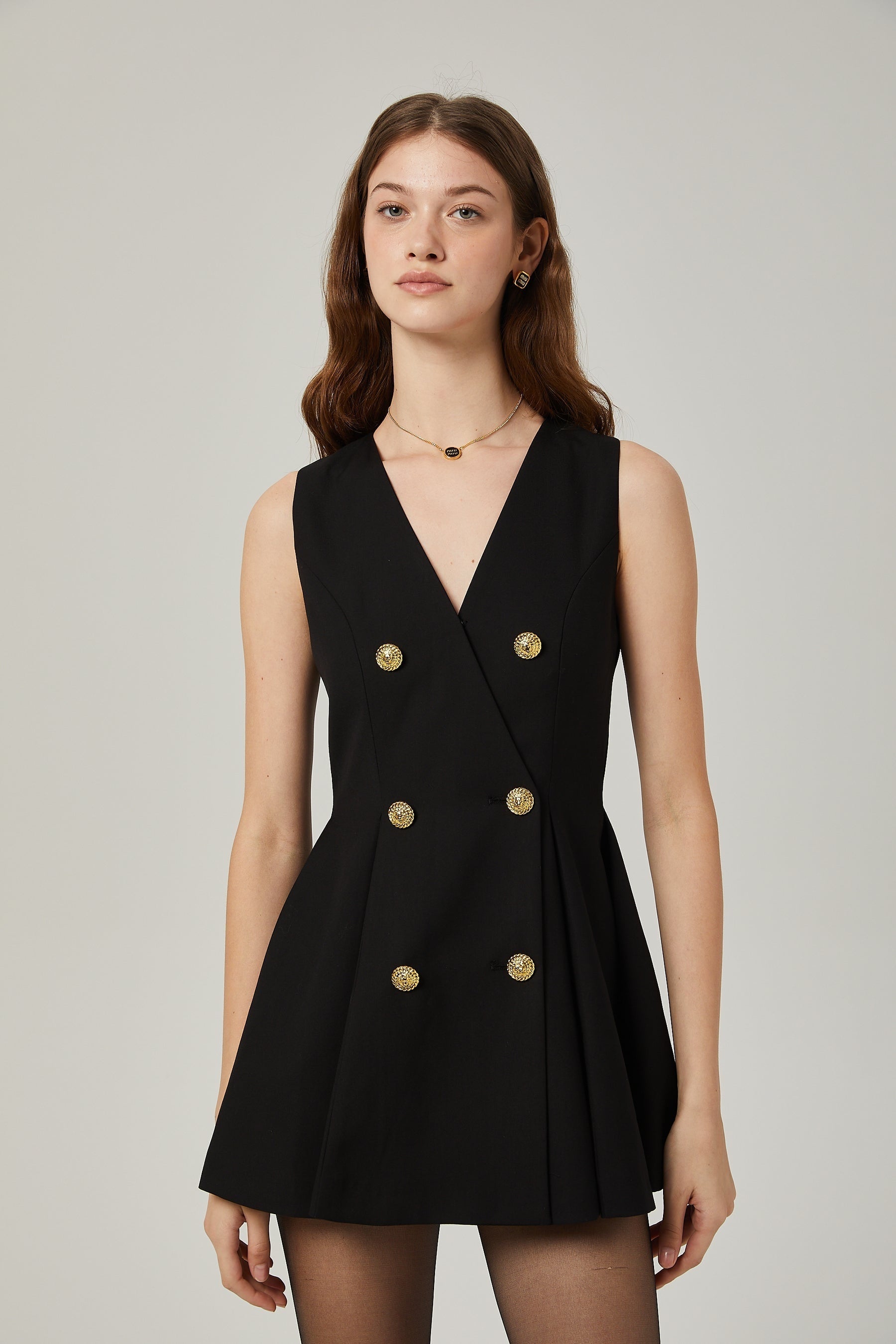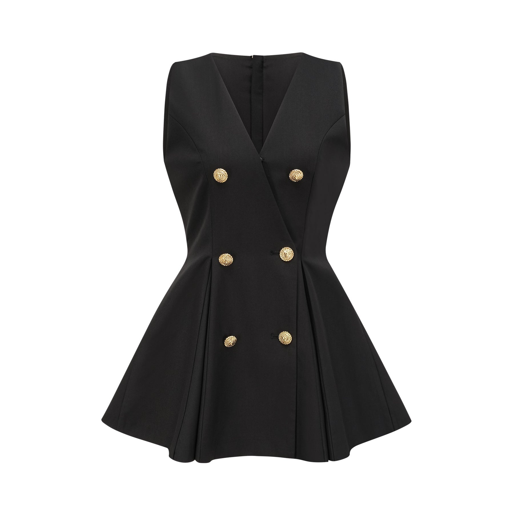 Nora Flared Mini Dress - Sleeveless Crossover Neck - Pleat Detailing - Gold-tone Hardware - Double-breasted Button Fastening