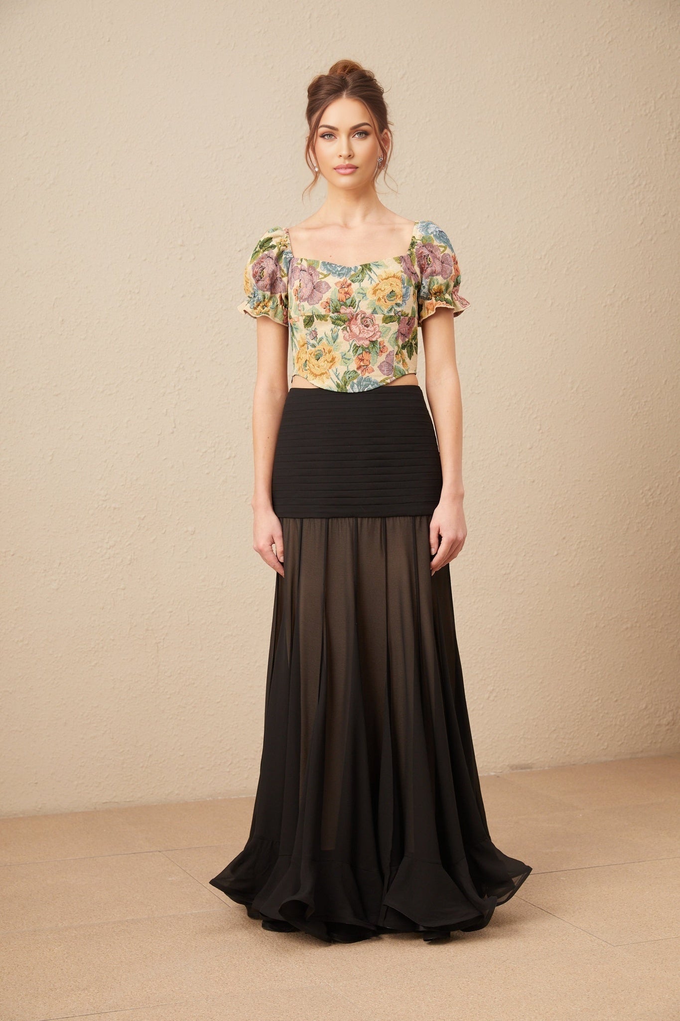 Elevate your wardrobe with the Ofelia Cropped Top & Shirred Hem. Crafted for modern sophistication and charm, this piece showcases a bustier style silhouette adorned with delicate short puff sleeves and intricate shirred panels, all complemented by an exquisite all-over floral print. Designed with a curved hem and a convenient side zip fastening, the cropped top exudes a blend of elegance and playfulness. Made from a luxurious blend of 70% Polyester and 30% Cotton, this top is a timeless addition to your collection, ensuring effortless style and sophistication for every occasion.
