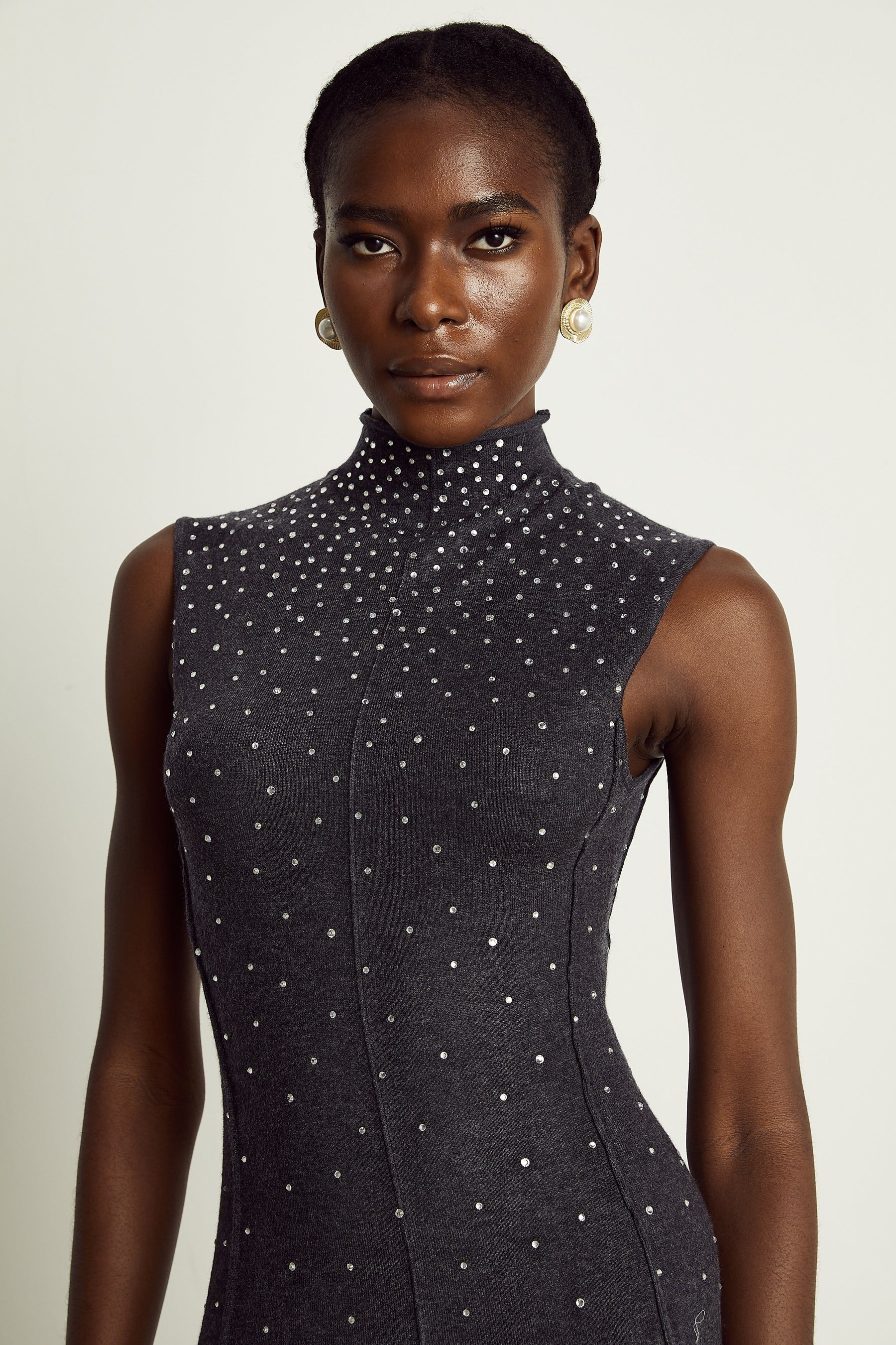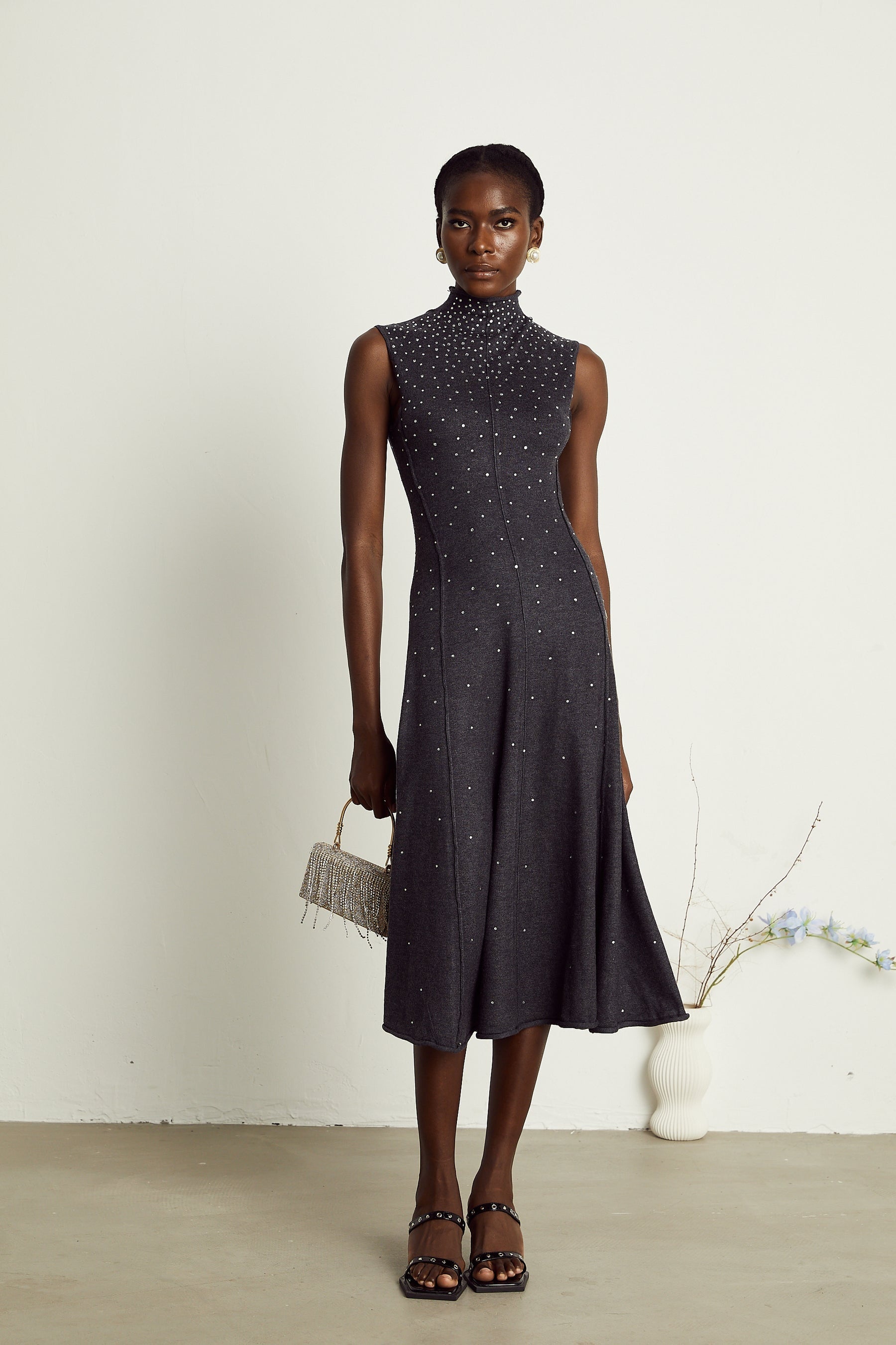 Elevate your wardrobe with the Paola Midi Dress, a stunning piece that exudes elegance and sophistication. Crafted from a luxurious blend of 50% Wool and 50% Acrylic, this dress boasts a flattering silhouette with a mock neck, sleeveless design, and a flared skirt that cascades beautifully at calf length. The ribbed knit texture and intricate rhinestone embellishments add a touch of glamour, while the raised seam detail and straight hem offer a refined finish. Perfect for both formal events and upscale gatherings, this Anthracite grey dress is a timeless addition to any fashion-forward wardrobe.