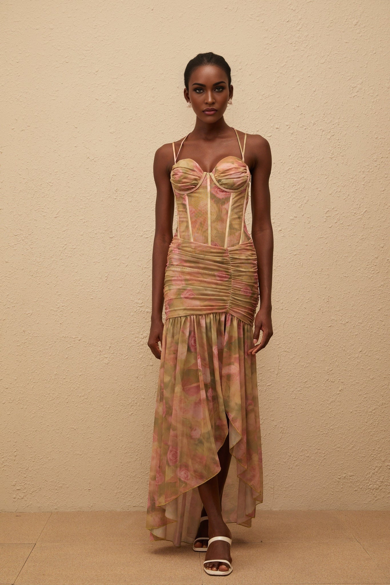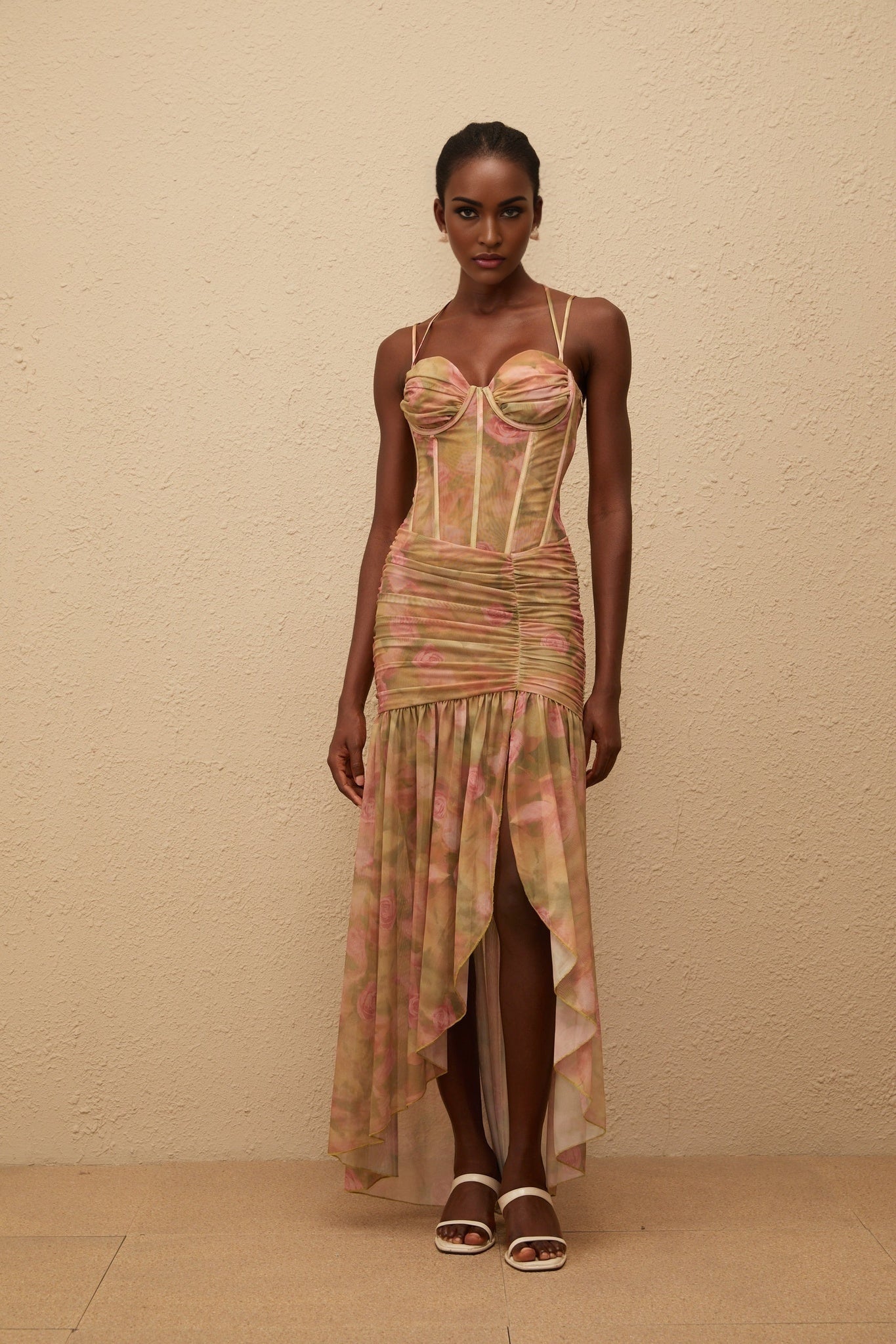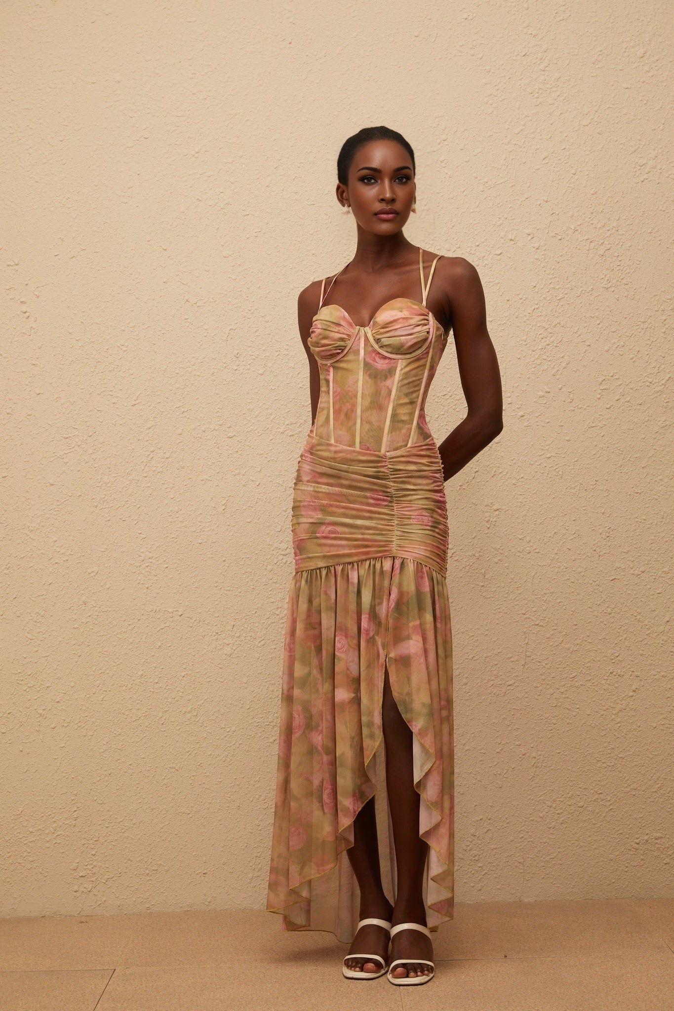Pasquina Maxi Dress in Green Floral Mesh embodies elegance and sophistication. Crafted from a luxurious blend of 94% Terylene fiber and 6% Spandex, this maxi dress features a mesmerizing floral print on delicate mesh fabric. The boned bodice and sweetheart neckline enhance the feminine silhouette, while intricate ruched detailing adds a touch of drama. With adjustable straps and a side zip fastening, this dress ensures a perfect fit. The asymmetrical hem with a side slit and ruffled pleated detailing exudes charm and grace, making it a standout piece for any special occasion.