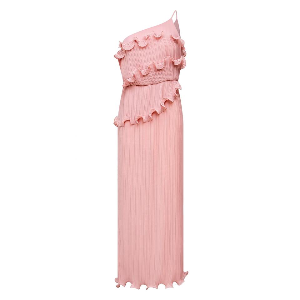 Add a touch of elegance to your wardrobe with this chic pleated pink ruffle one-shoulder dress. Perfect for special occasions, this dress features a solid pattern and a midi length silhouette. Made from a blend of Spandex and Polyester, this dress is not only stylish but also comfortable to wear. The dress is suitable for multiple seasons including summer, spring, and fall. The design includes an elegant one-shoulder sleeve style and a natural waistline. It is anti-wrinkle, breathable, environmentally friendly, and washable, making it a versatile and practical choice for your wardrobe.