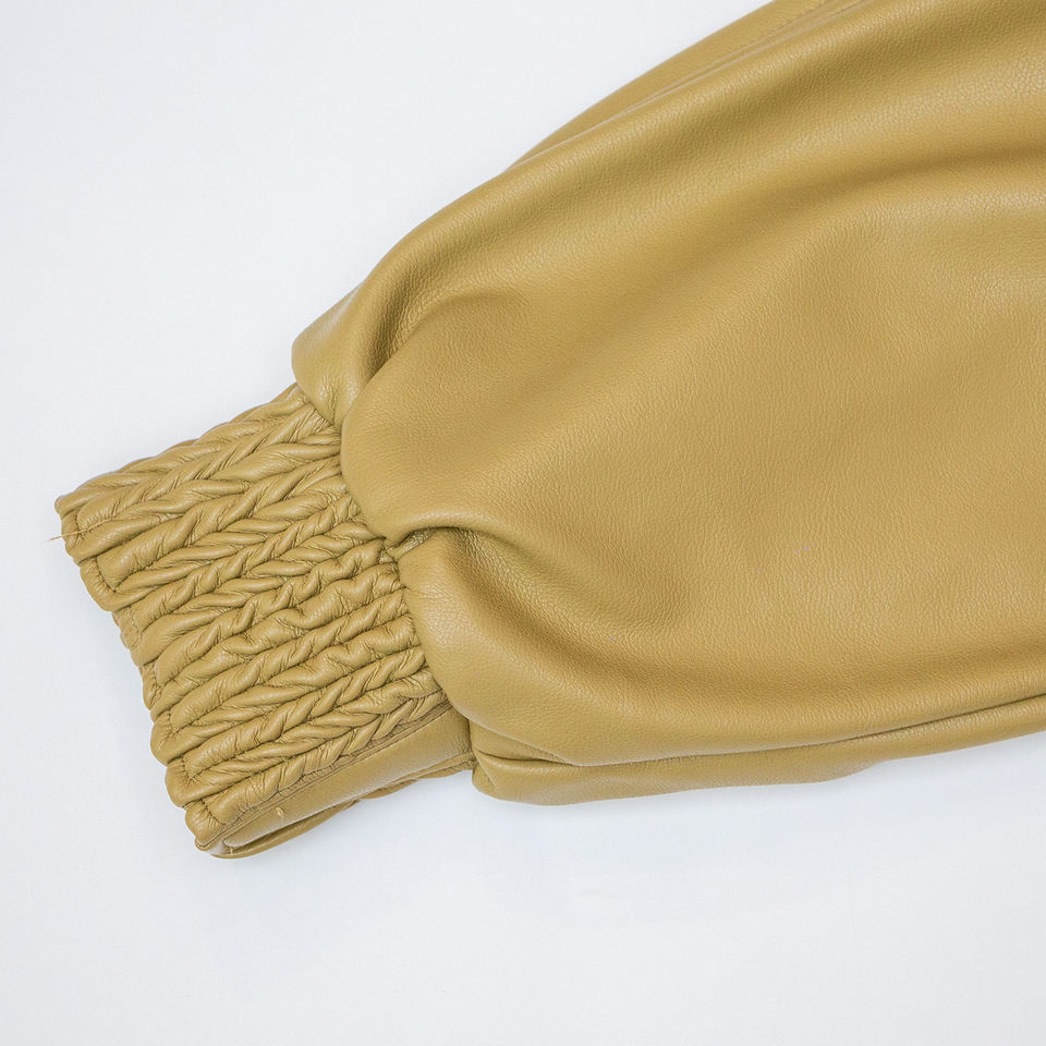 This premium green zipper faux leather bomber jacket is a luxurious addition to any woman's wardrobe. Made with breathable and eco-friendly materials, this jacket is perfect for the winter and fall seasons. Featuring a regular fit and O-neck collar, it is a versatile piece suitable for various occasions. The jacket is lined with standard polyester and the shell material is PU leather, providing both style and comfort. With seamless fusing and needle detection, this jacket offers high-quality craftsmanship and attention to detail.
