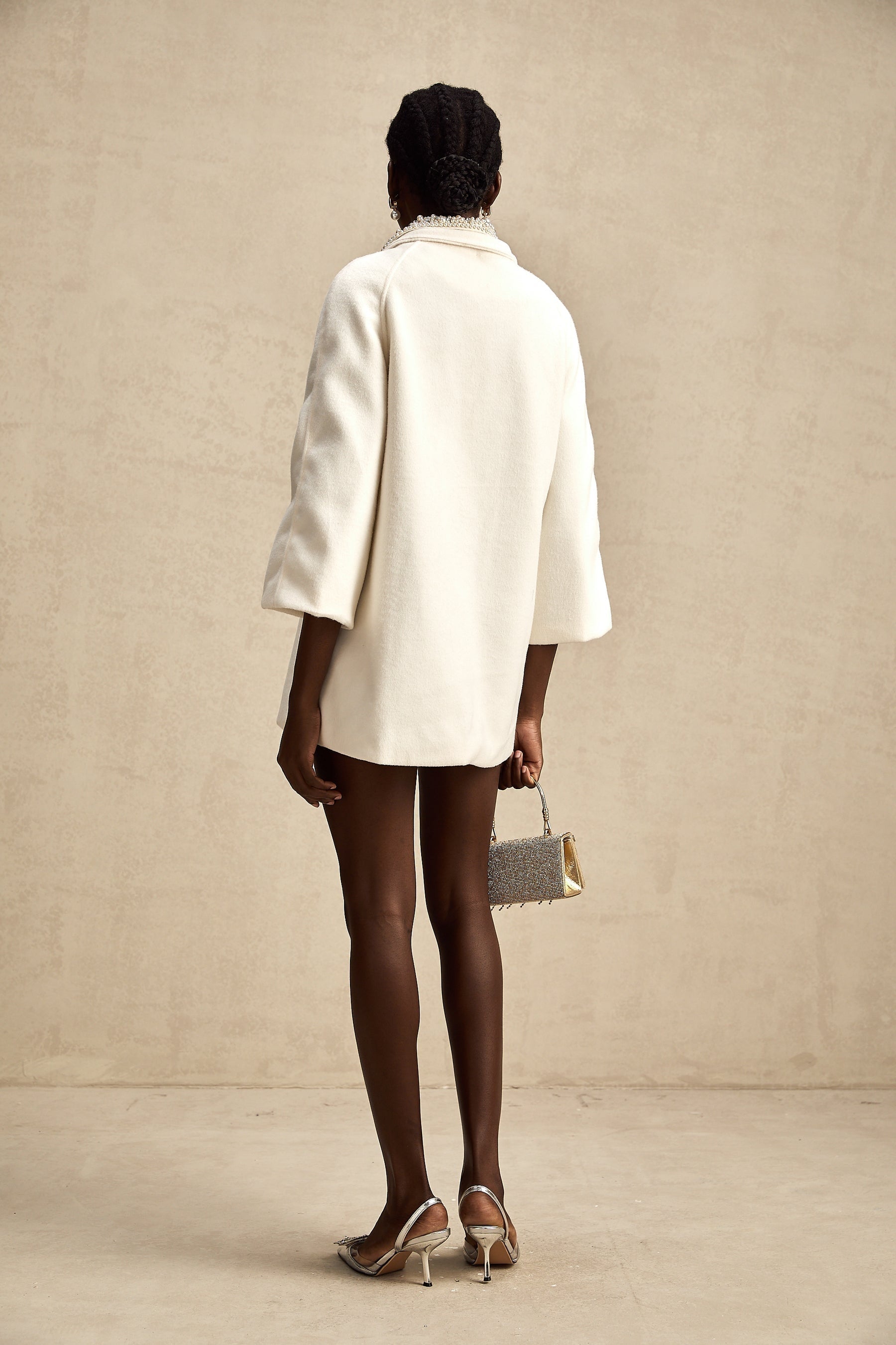 Priscilla Coat - Long Sleeves - Lapels - Crystal & Faux Pearl Embellishment - Double-Breast Button Fastening