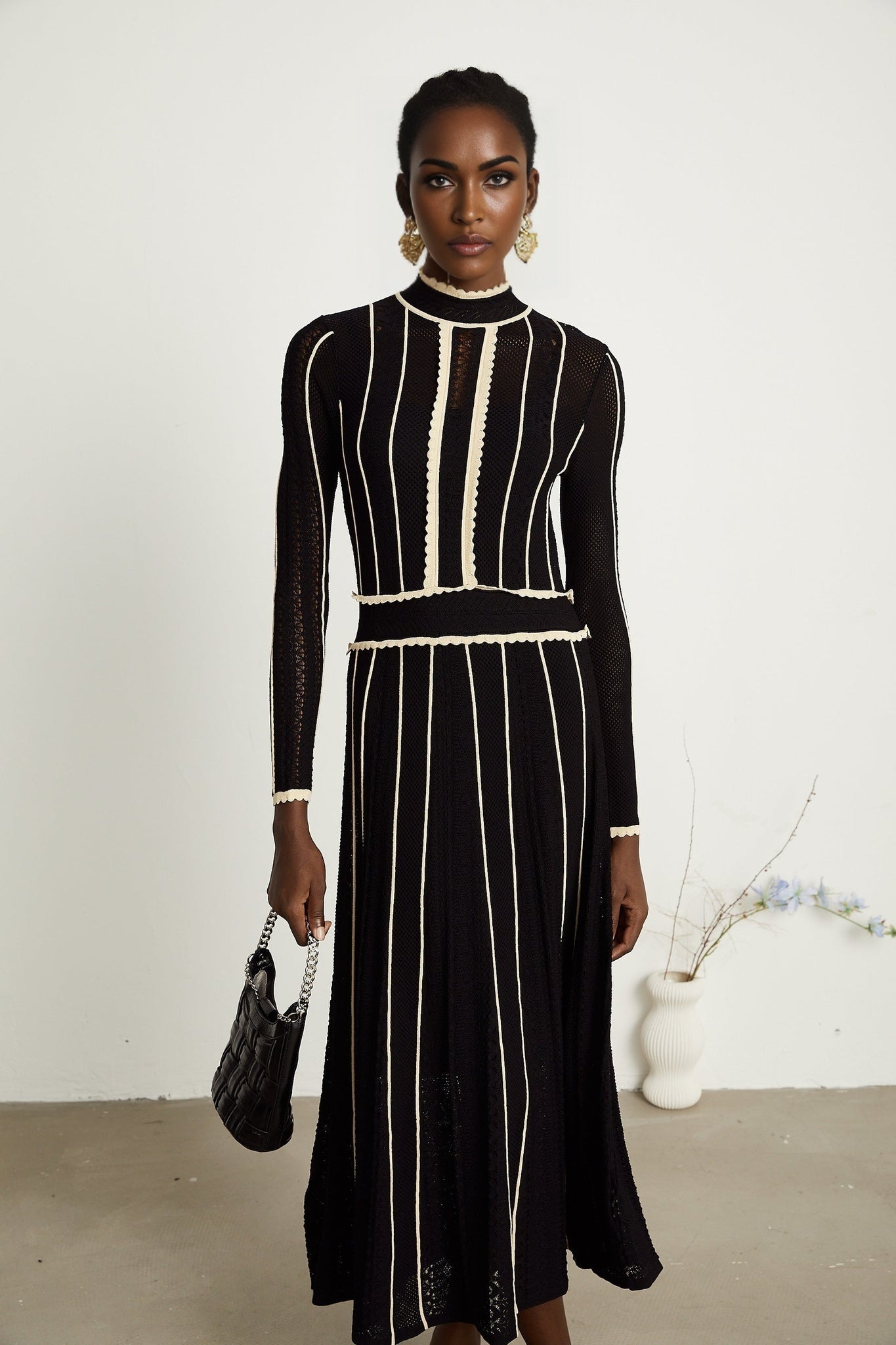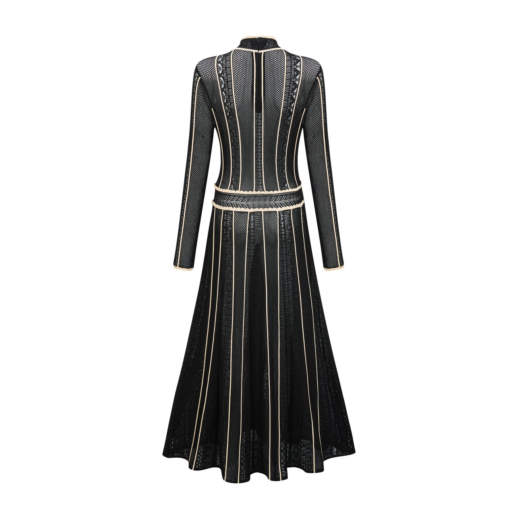Raffaelina Maxi Dress - Vertical Stripes - Netted Design - Ruffled Detailing - Round Neck