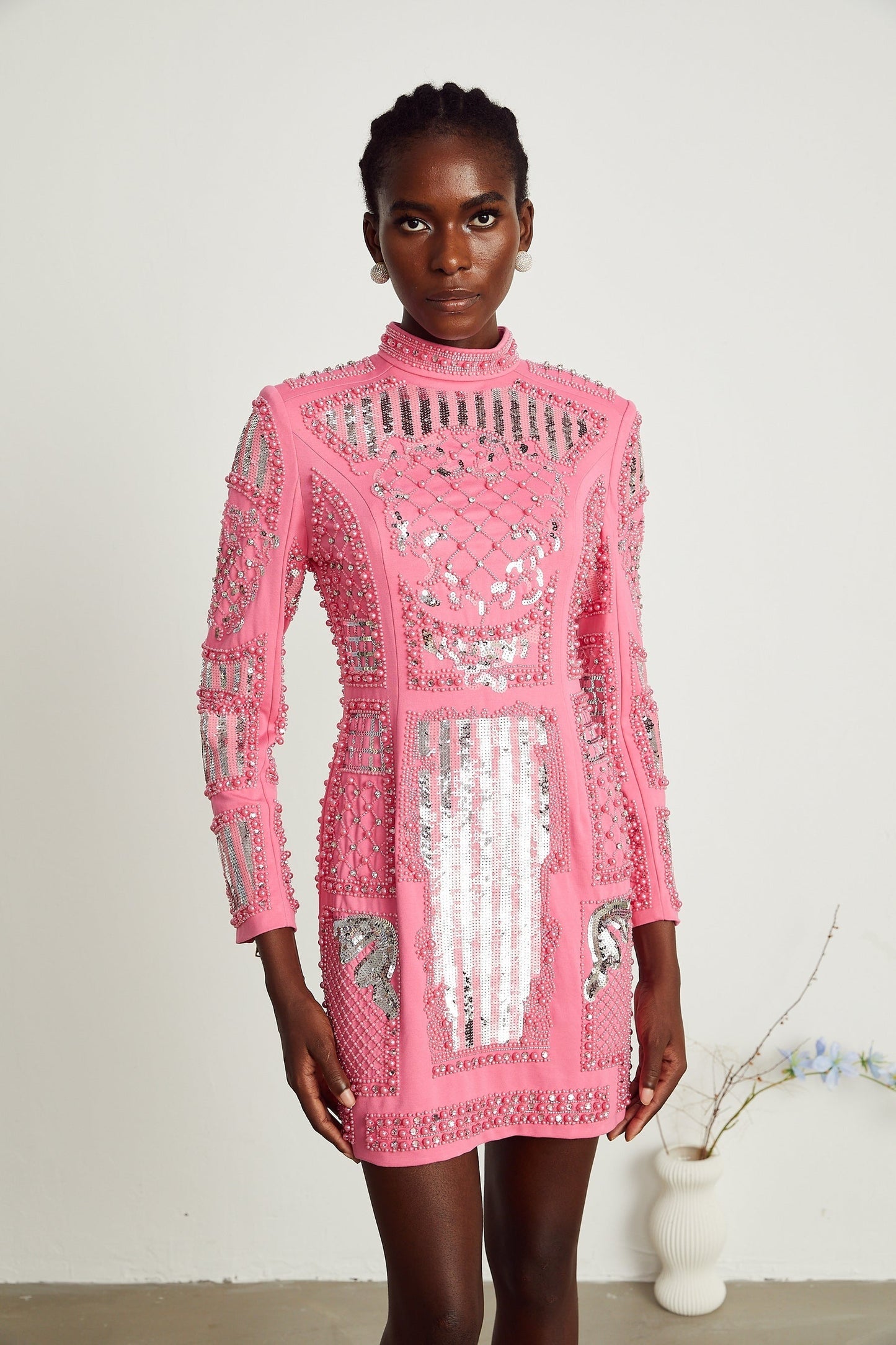 Elevate your style with the Rita Mini Dress, a stunning piece that exudes glamour and sophistication. Crafted with precision, this dress features a round neck, long sleeves with zippered cuffs, and exquisite details like sequin, bead, and crystal embellishments. The rear zip fastening ensures a perfect fit, while the thigh-length design adds a touch of allure. Made from a luxurious blend of 80% Polyamide and 20% Spandex, this dress is a statement of refined elegance. Embrace sophistication with the Rita Mini Dress and make a lasting impression wherever you go.