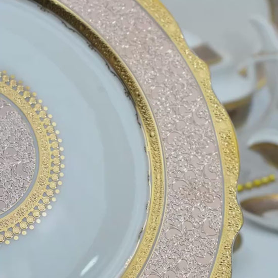 • Elevate your dining experience with the Rosalina Royal Embossed Gold Plates Set . Featuring genuine 24K rose gold embossing and crafted from premium bone china or super white porcelain , this set blends classic royal design with modern elegance. Each piece is handmade with exquisite detailing, perfect for formal events or luxurious everyday use. Dishwasher-safe and eco-friendly, these plates are designed to impress.