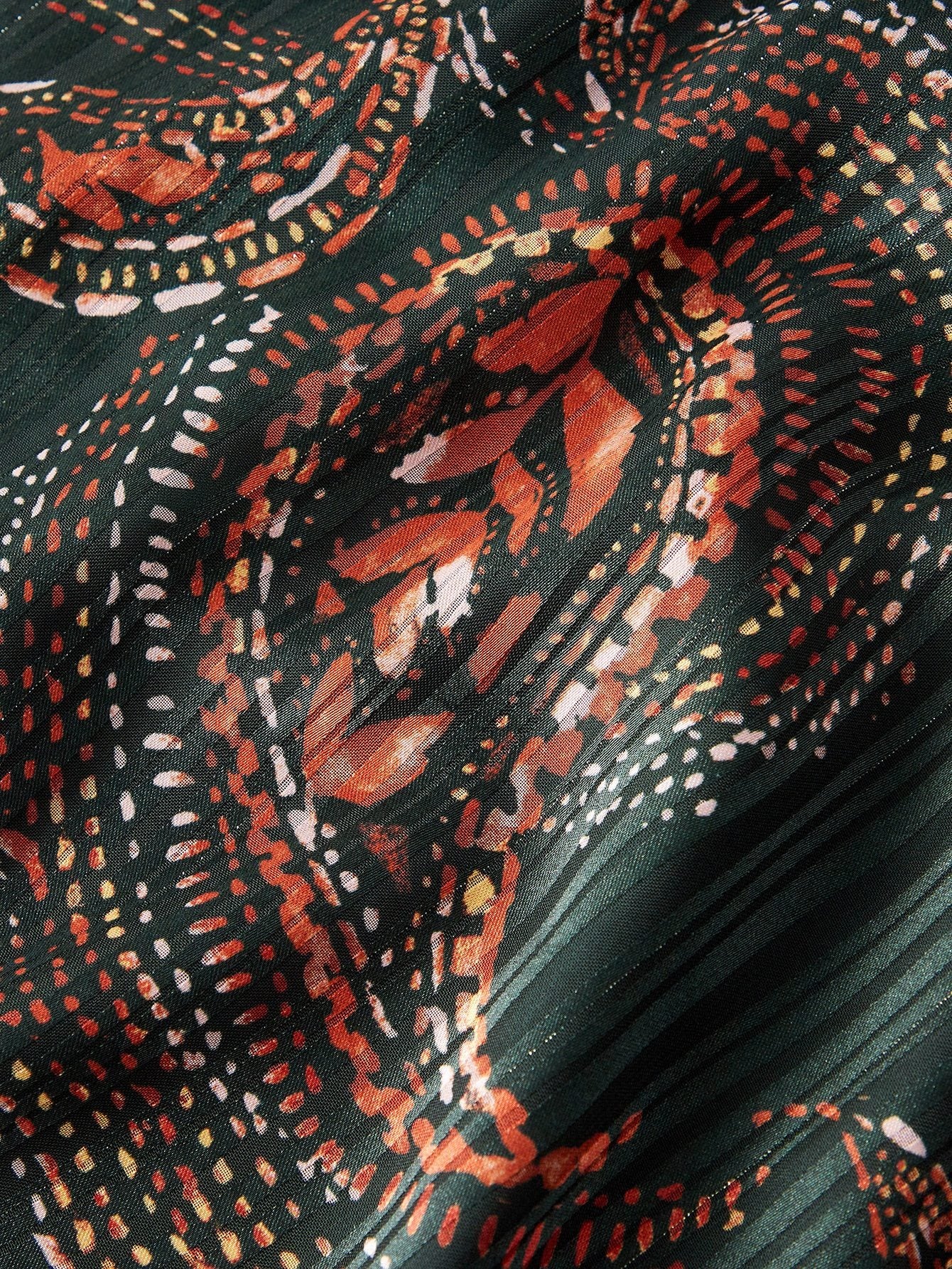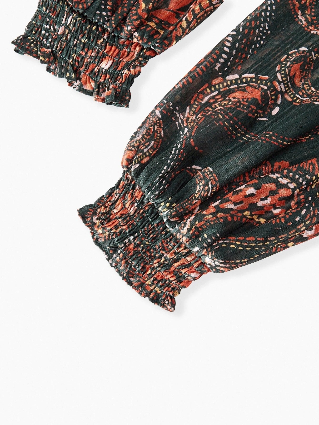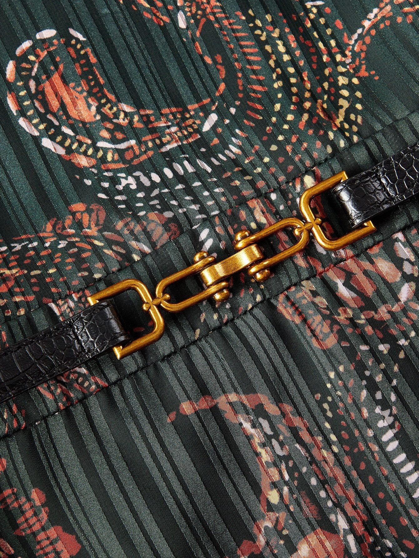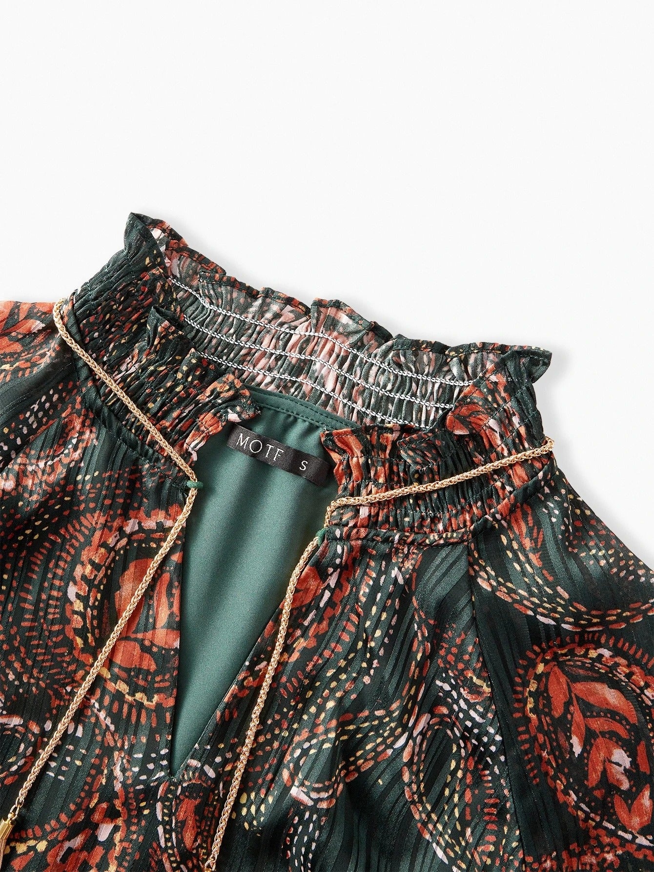 Indulge in the exquisite allure of the Stefania Maxi Dress, where sophistication meets opulence. This sartorial masterpiece features a notched neckline and bishop sleeves that exude regal charm. The high waist effortlessly cinches the silhouette, while the A-line cut offers a flattering drape. Adorned with a belted chain tape detail that adds a touch of glamour, this dress is a nod to folk-custom inspirations. Crafted from a luxurious woven fabric with a lush 100% polyester lining, this garment is a testament to artisanal craftsmanship. Perfect for elegant affairs, this dress in luscious green epitomizes refined style with its long sleeves and flowing silhouette. Elevate your wardrobe with this timeless piece, suitable for any grand occasion.