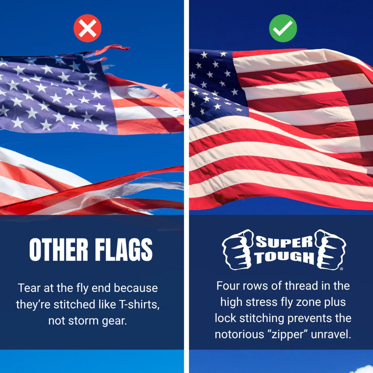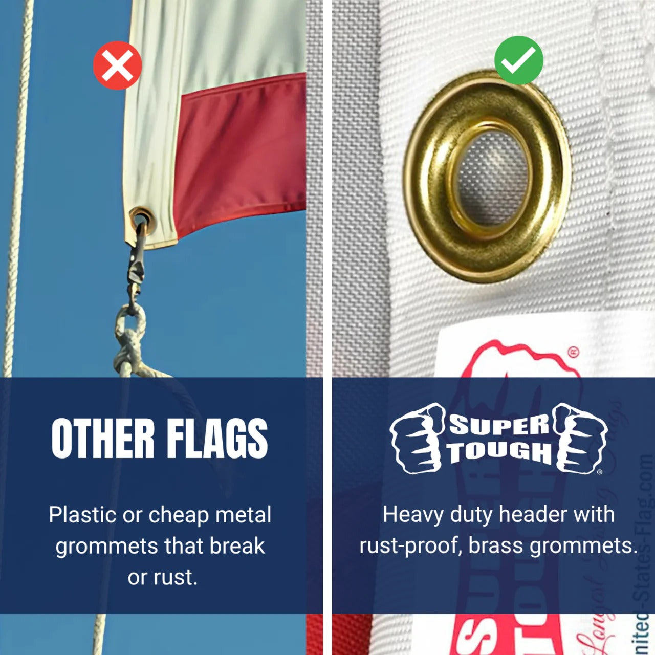 Each star is crafted with military-spec embroidery, while the heavy-duty canvas header and rust-proof brass grommets provide secure attachment to any standard flagpole. With four rows of reinforced stitching on the fly end, this flag prevents unraveling even in challenging weather conditions.