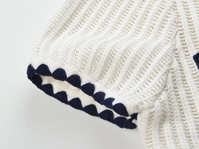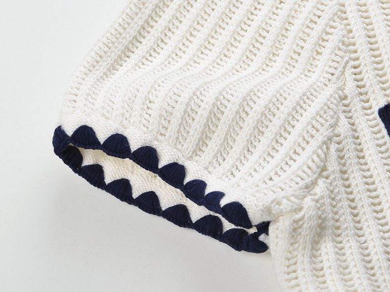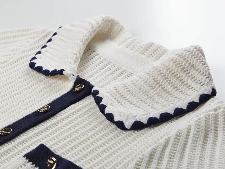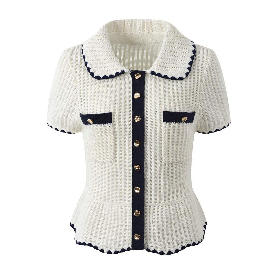 Polished and timeless, this Van Hoef knit top is designed to make everyday styling feel elevated. Crafted in an ivory ribbed knit, it features a classic collar, navy contrast trim, and a clean button-front finished with gold-tone buttons for a refined touch. Decorative pockets add tailored detail, while the subtle peplum hem defines the waist and flatters the silhouette. Pair it with trousers for a chic daytime look or style it with a skirt for effortless sophistication.