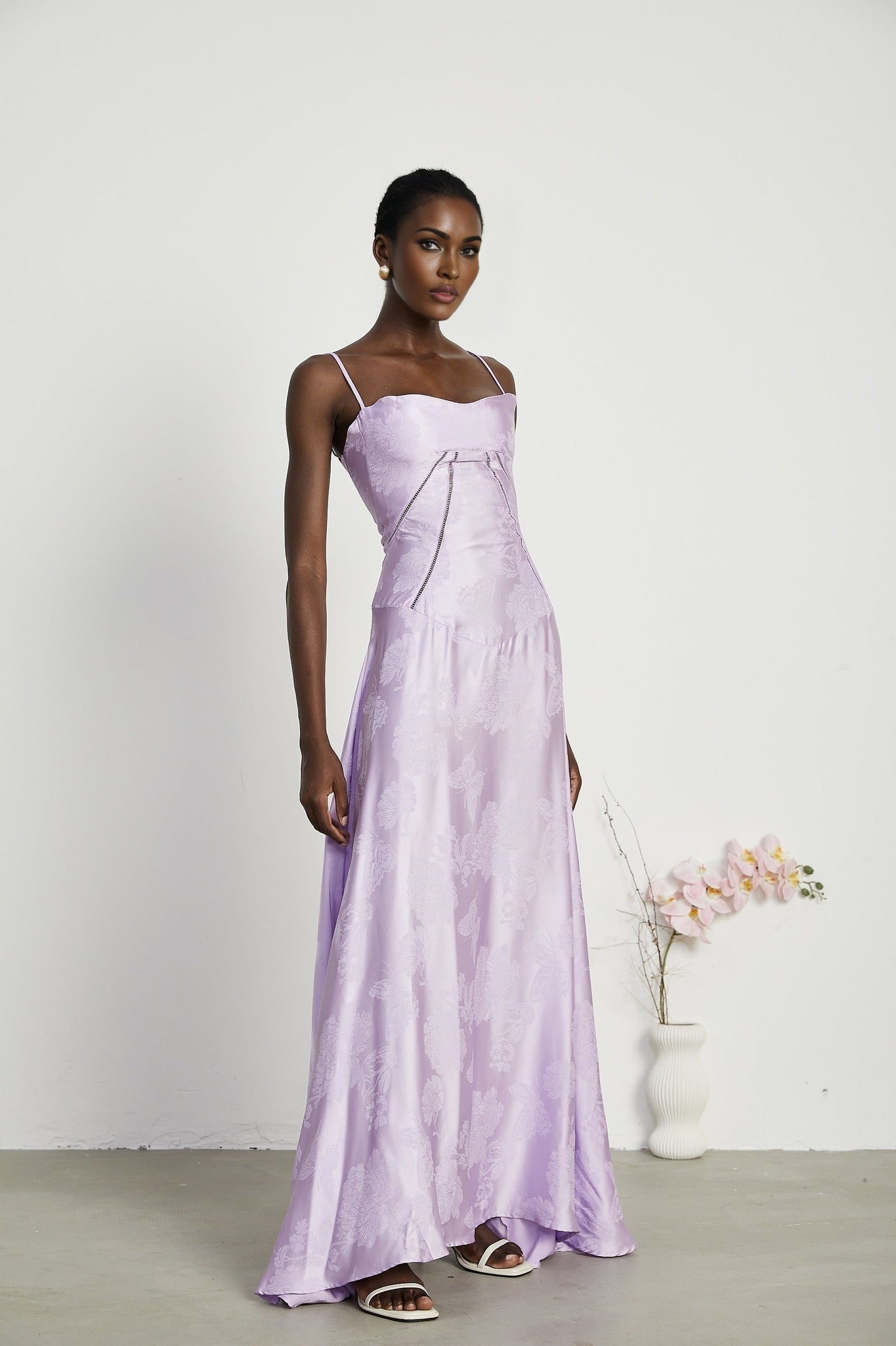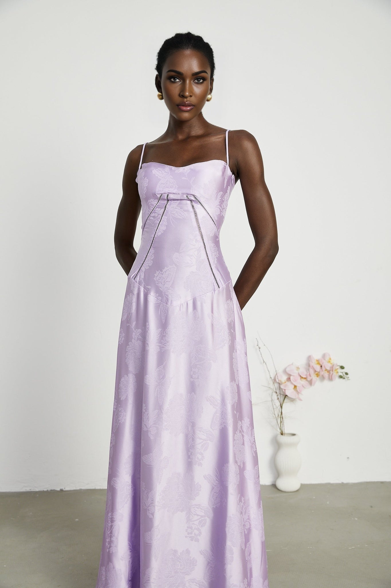 Elevate your presence with the Seraphina Jacquard Maxi Dress, a masterpiece of sophistication and allure. Crafted from a blend of 85% Terylene and 15% Spandex, this sleeveless dress features spaghetti straps that delicately frame your shoulders, a low-cut neckline for a touch of sensuality, and a mesmerizing patterned jacquard fabric. The side zip fastening ensures a seamless silhouette, while the rear tie fastening adds a hint of charm. Embrace the maxi length design, exuding elegance and grace with every step. Available in sizes to suit your individual style, this dress promises to captivate with its effortless glamour.