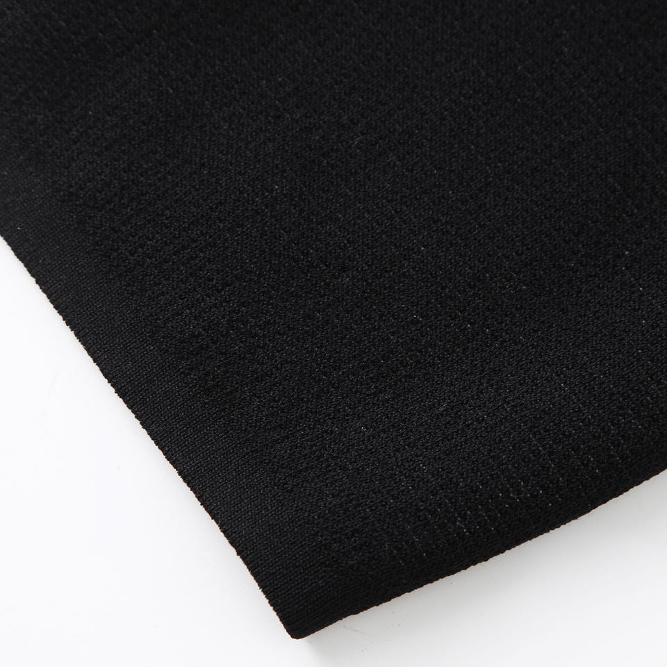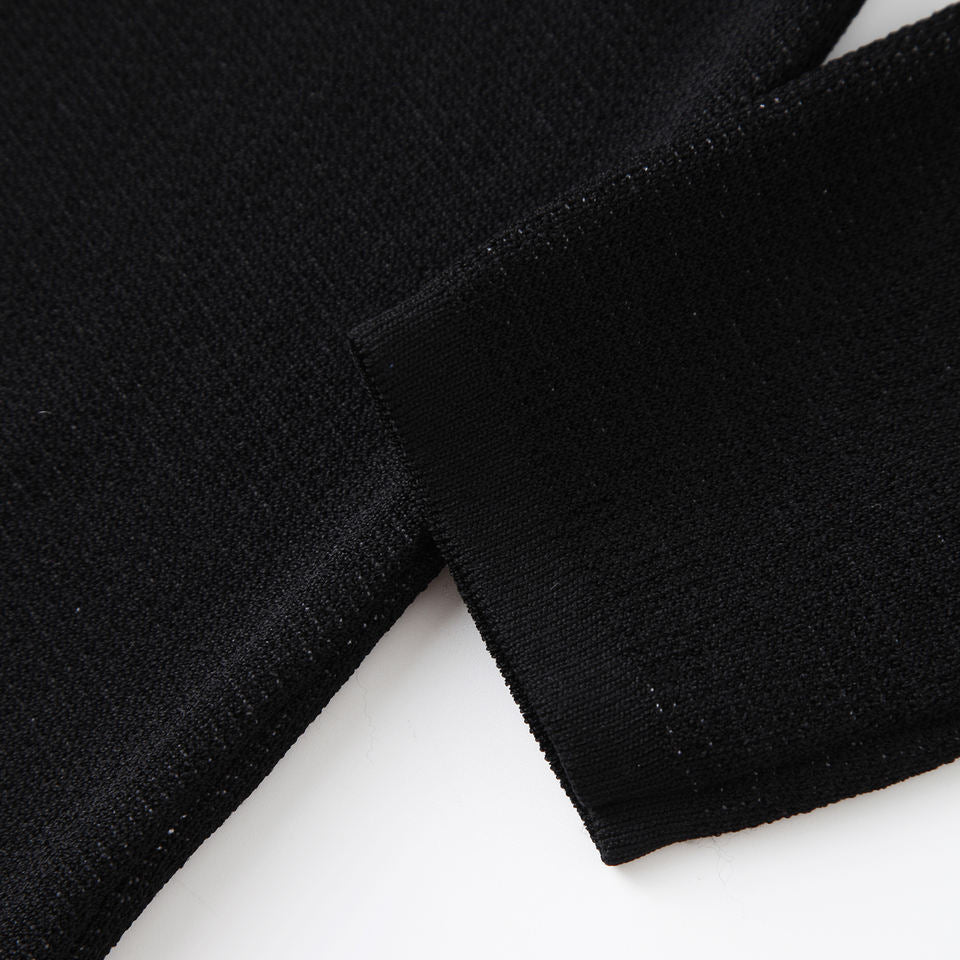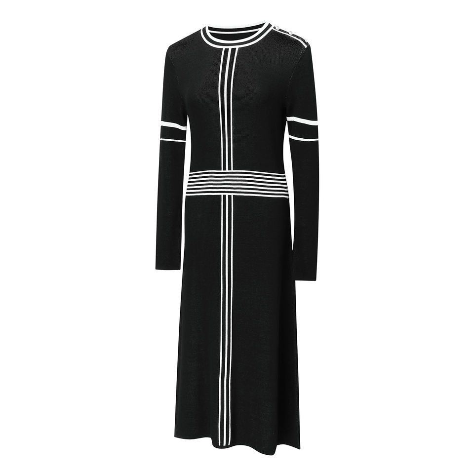 This elegant and modest black and white striped knit dress features a round neckline, long sleeves, and a midi A-line silhouette. Made from 63% Viscose and 37% Nylon, it is anti-static and adorned with rivet decorations. Perfect for spring, this standard thickness dress is a timeless piece with a vintage flair. The full-sleeve design and solid pattern add sophistication to this stylish wardrobe essential.