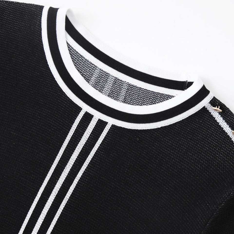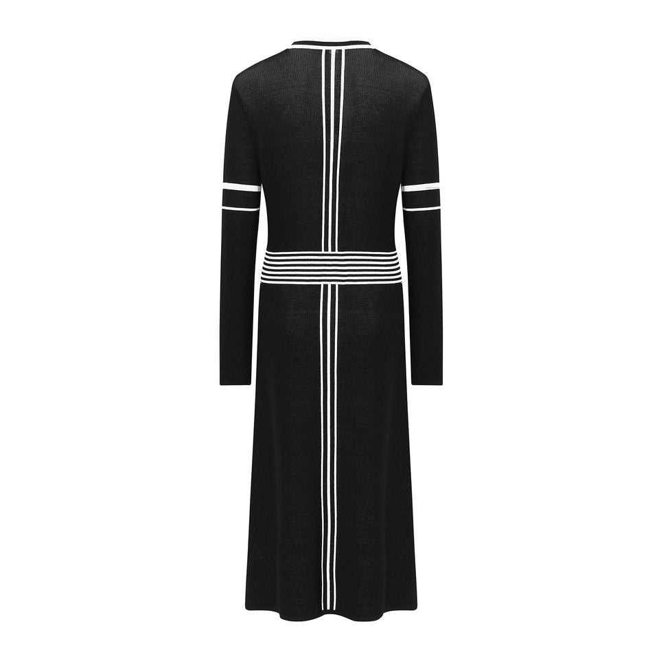 Knit Dress – Black & White Stripes – Round Neckline – Elegant Midi A-Line