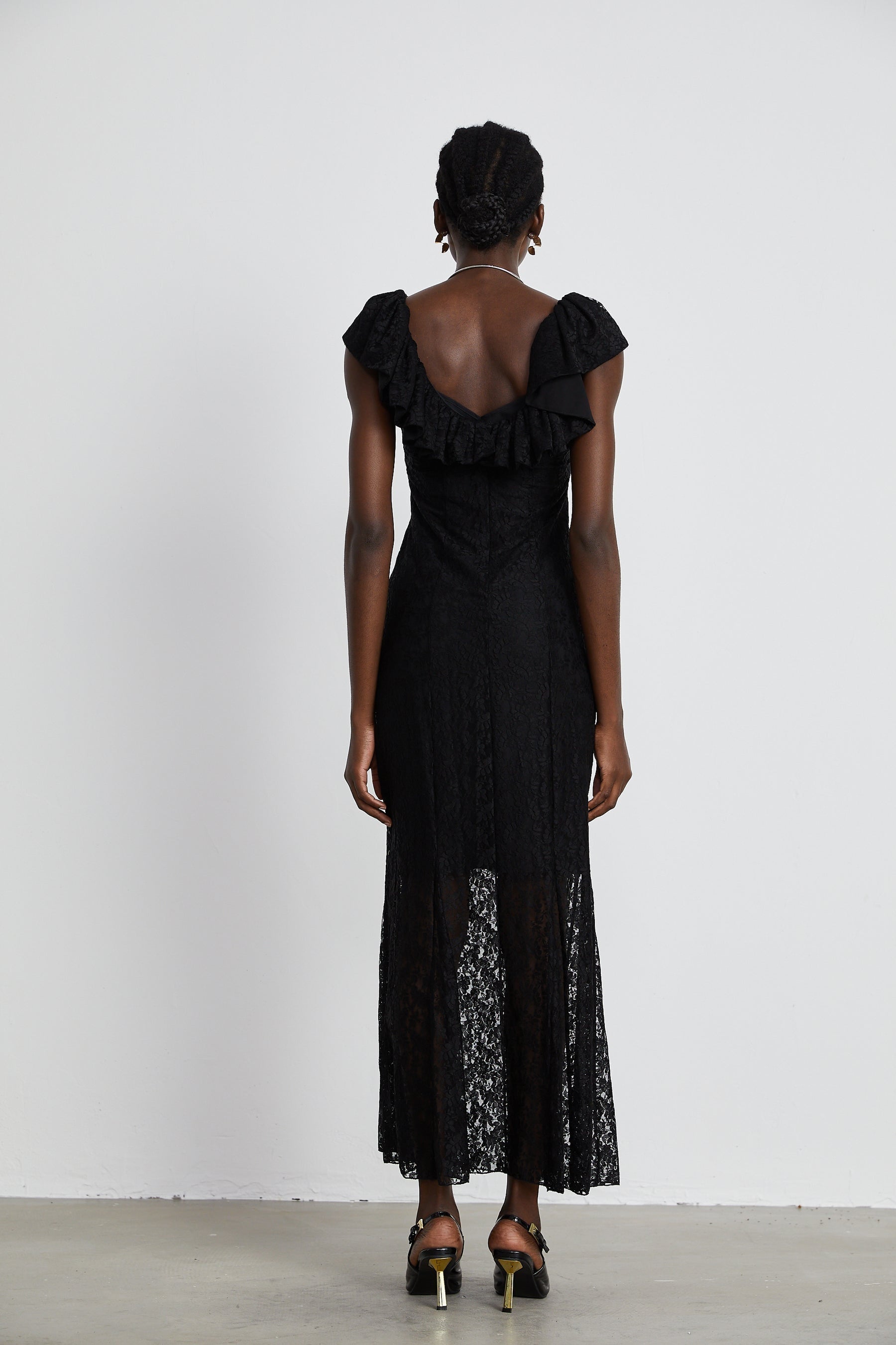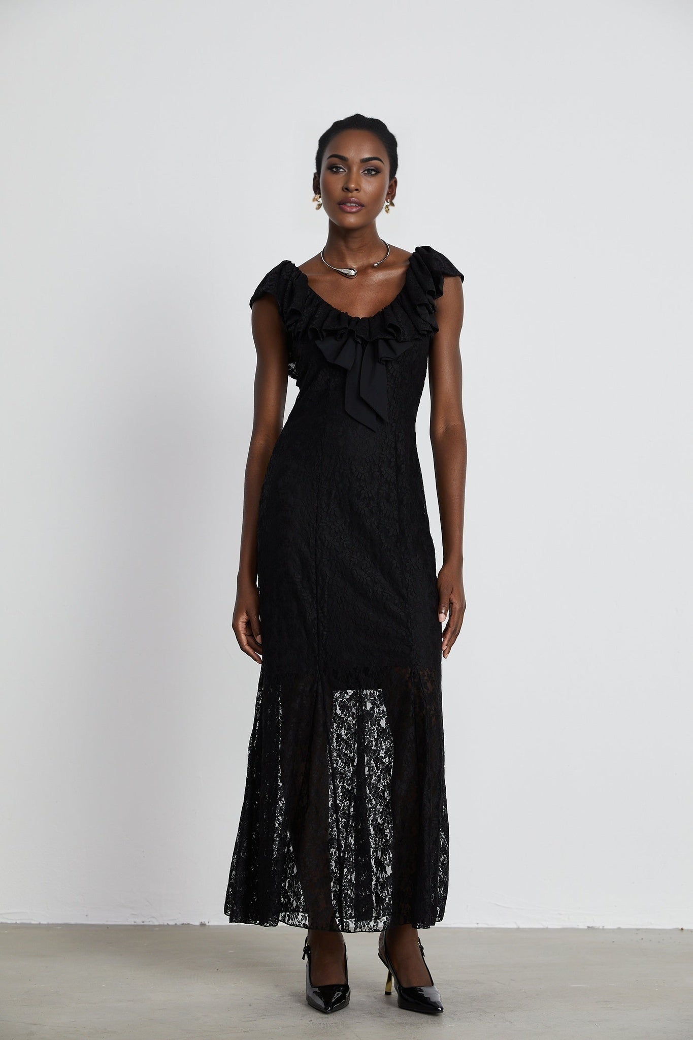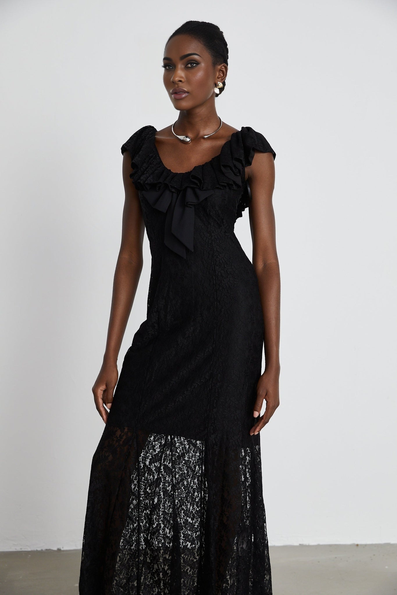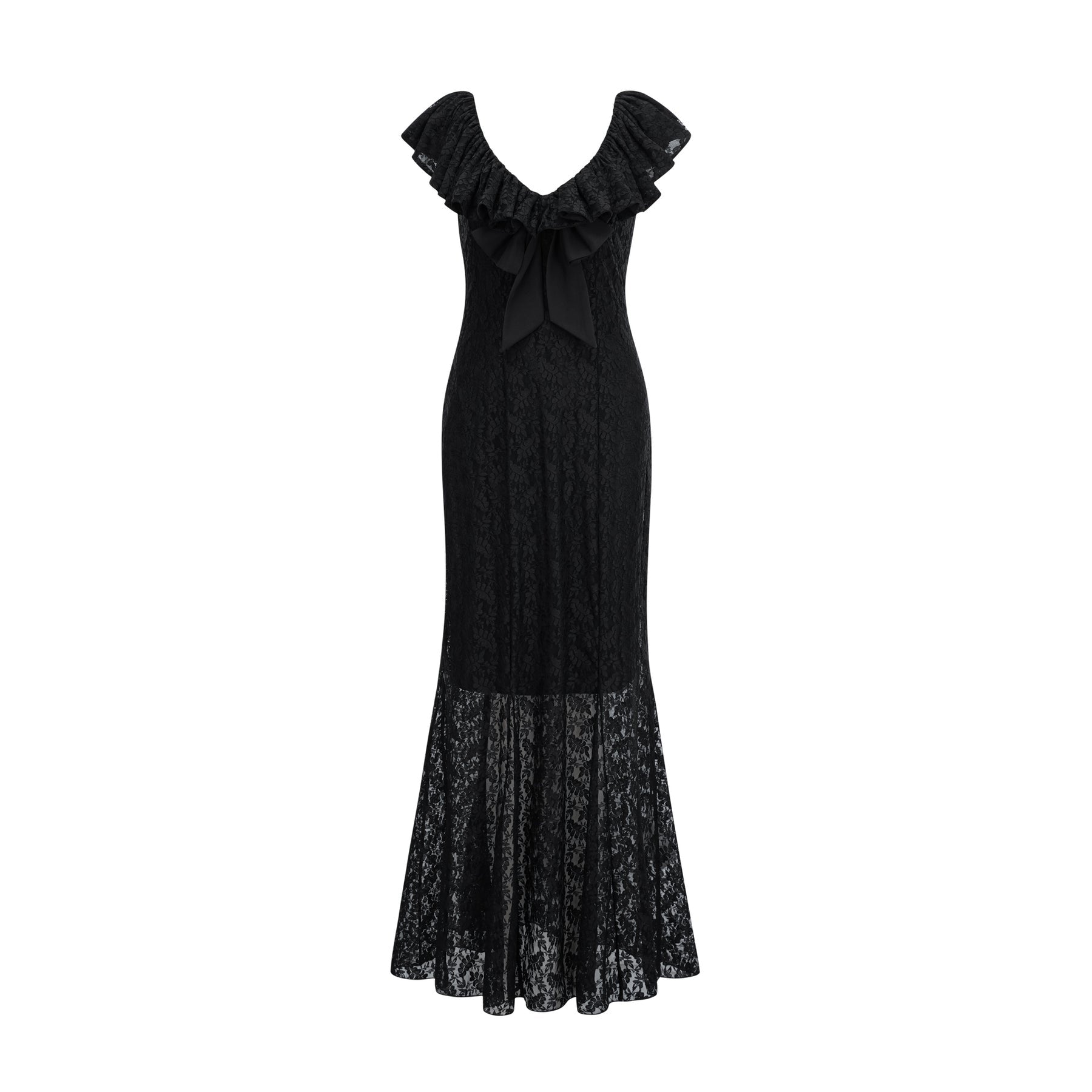 Virginia Gown - Black Chantilly Lace - Bow Trim - Sleeveless V-Neck