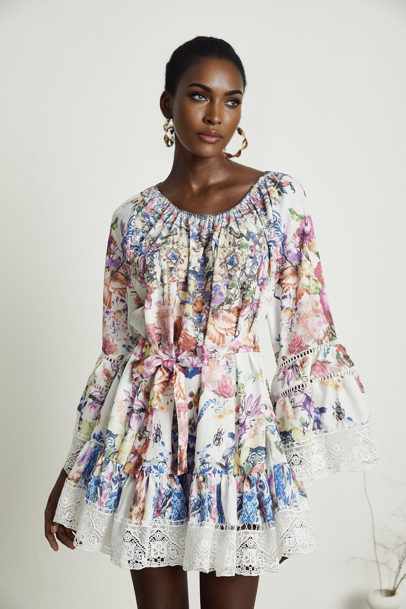 Elevate your wardrobe with the Vivian Mini Dress, a true embodiment of sophistication and charm. Crafted with meticulous attention to detail, this exquisite piece features delicate lace-trim embellishments and a captivating floral print that exudes elegance. The semi-sheer construction and long sleeves add a touch of mystery, while the flared silhouette and mini length create a flattering, feminine look. Designed for the modern woman, this dress boasts a front button fastening for added allure. Made from a luxurious blend of 93% cotton and 7% polyamide fiber, this dress ensures both style and comfort. Embrace timeless beauty with the Vivian Mini Dress.