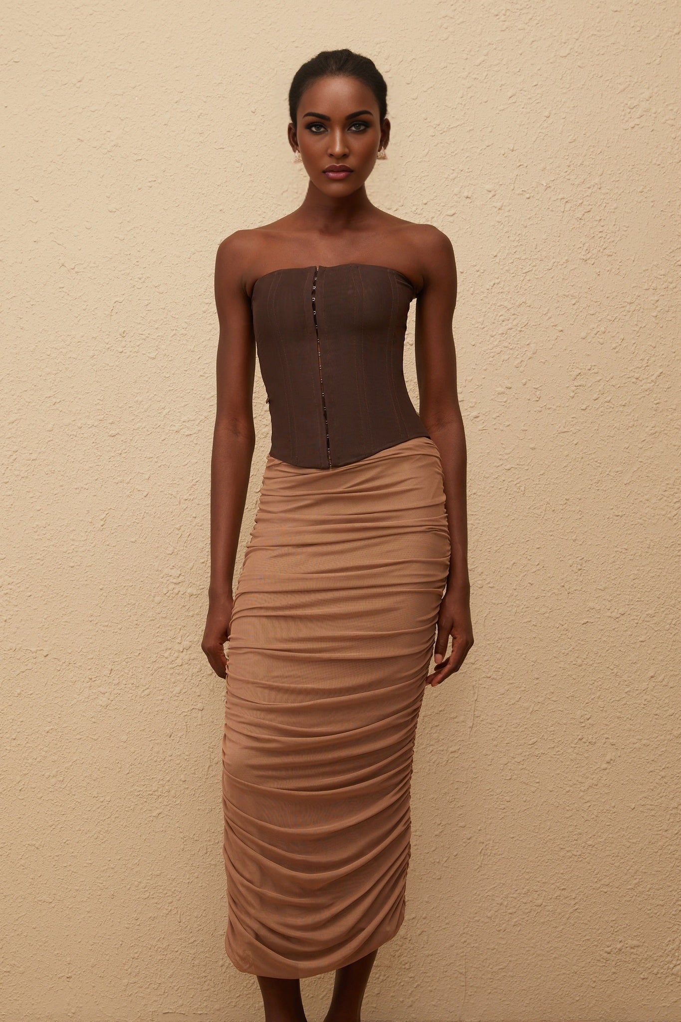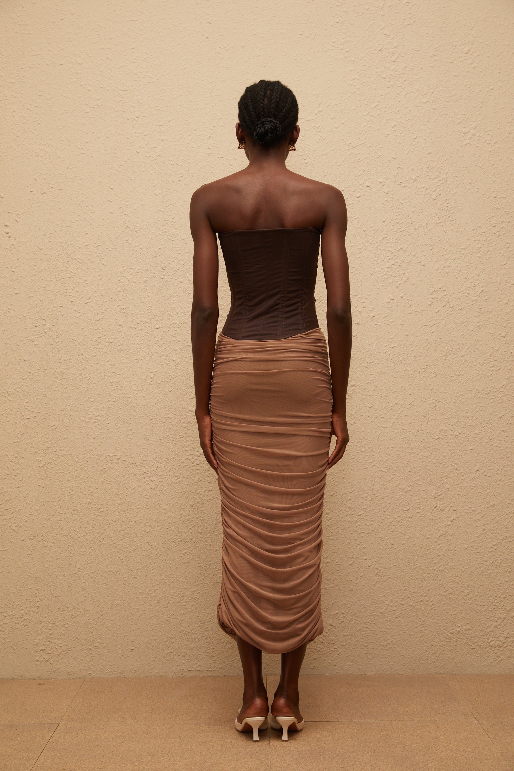 Elevate your wardrobe with the Wendy Midi Dress, a masterpiece in sophistication. Crafted to perfection, this dress features a mesmerizing mesh panelled design and exquisite drape detailing for a glamorous touch. The off-the-shoulder silhouette with a boned bodice exudes elegance, while the fitted calf-length cut accentuates your figure flawlessly. In rich brown, this dress is a timeless classic that exudes luxury. Made from a blend of 95% Terylene fiber and 5% Spandex, it offers both comfort and style. Embrace unparalleled refinement with the Wendy Midi Dress.