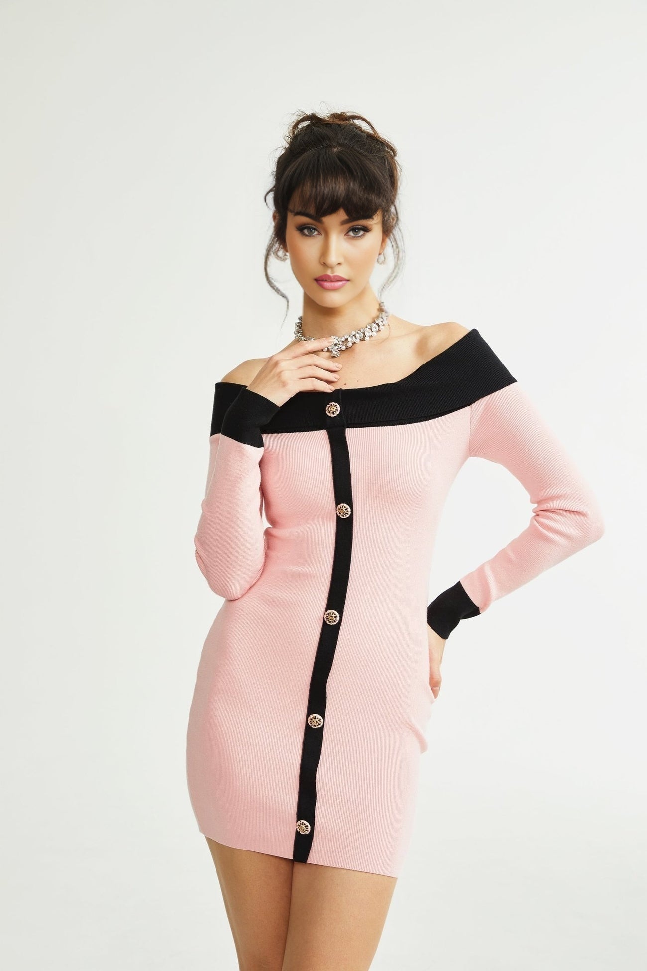 Indulge in sophistication with our Yvette Mini Dress Button Knit Thigh Length. Embrace elegance with this exquisite piece crafted for the modern trendsetter. Designed with a keen eye for detail, this stunning dress features contrasting pink and black colors that exude chic charm. The front button detailing adds a touch of refinement, while the knitted construction ensures a luxurious feel. Perfect for any occasion, this dress boasts long sleeves and a flattering thigh-length silhouette. Made from a premium blend of 80% polyester and 20% cotton, it offers both style and comfort in one luxurious package.